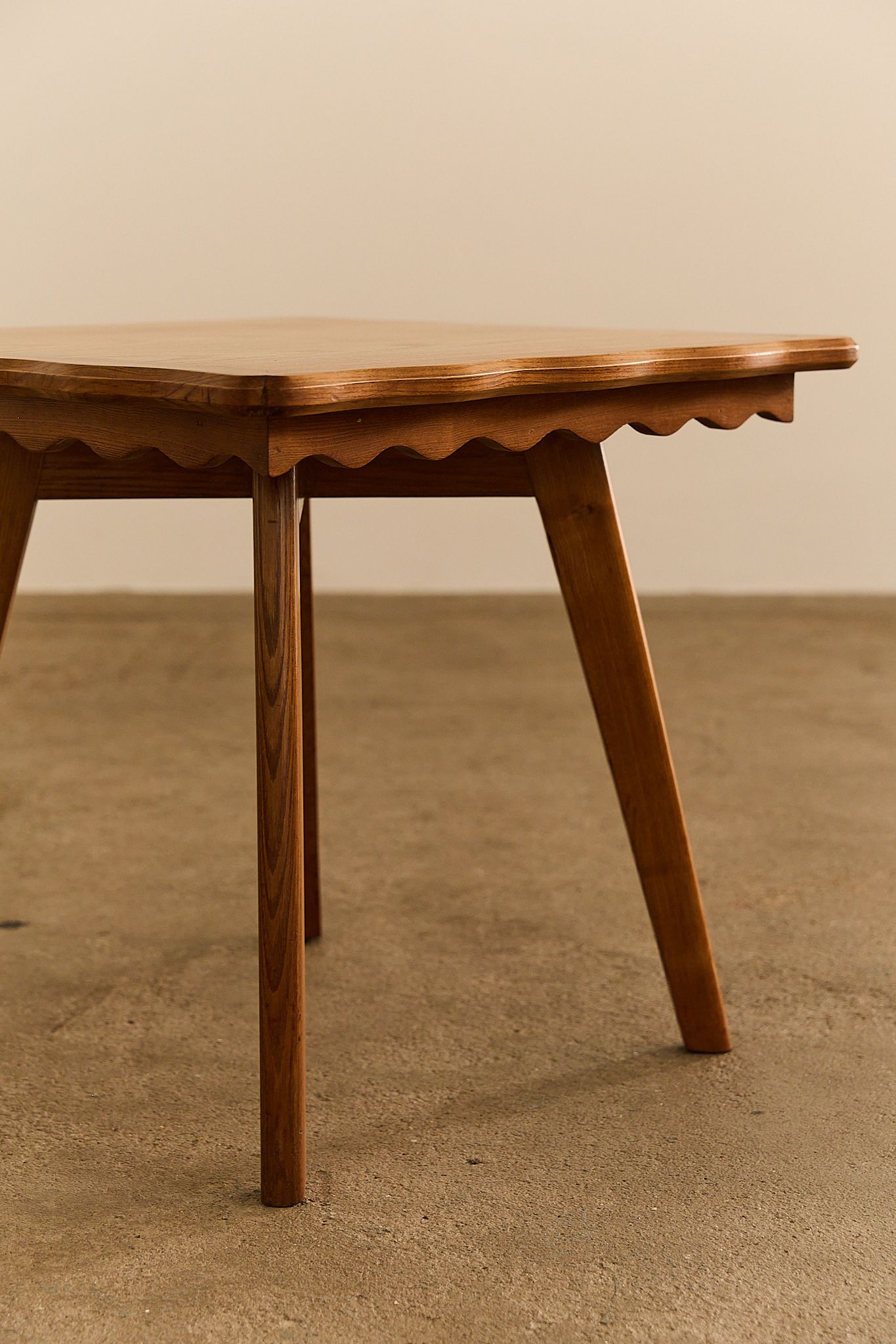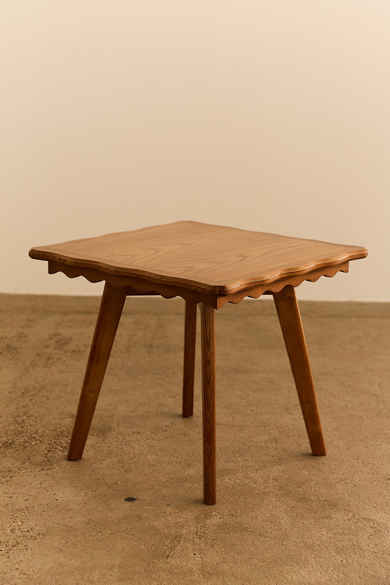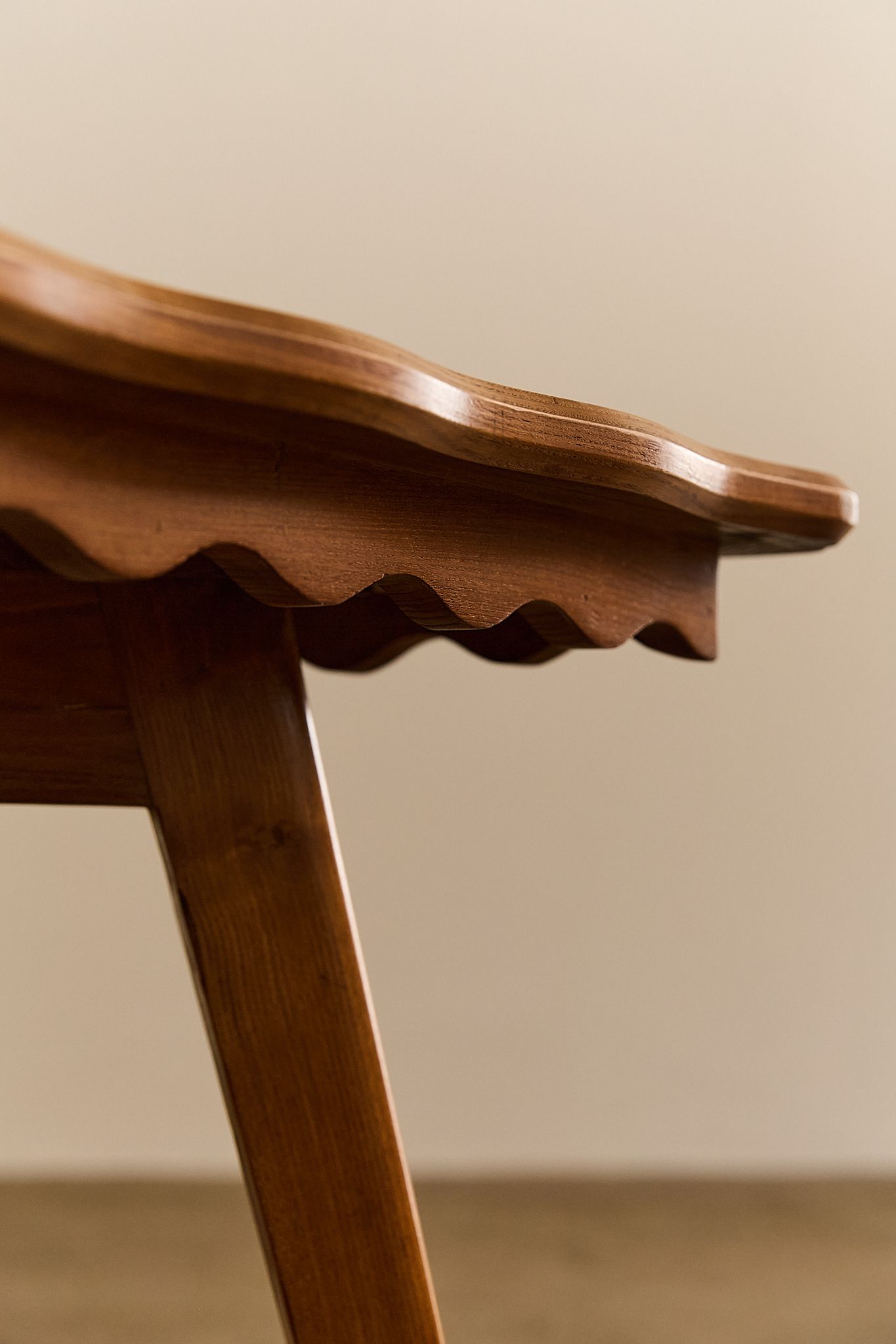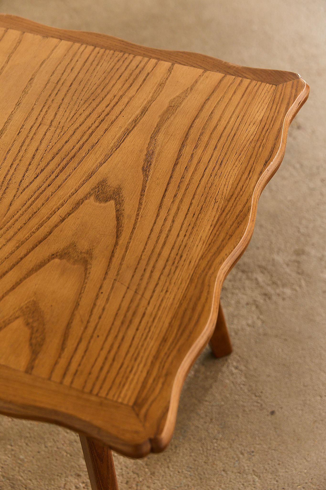 An elegant side table att to Paolo Buffa. Crafted in solid wood, the table features a subtly scalloped edge and gently tapered legs; hallmarks of Buffa’s refined style. The tabletop showcases beautiful natural grain, combining craftsmanship with understated ornamentation.