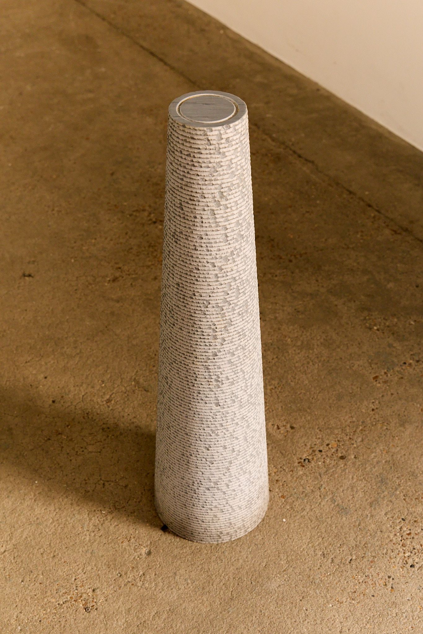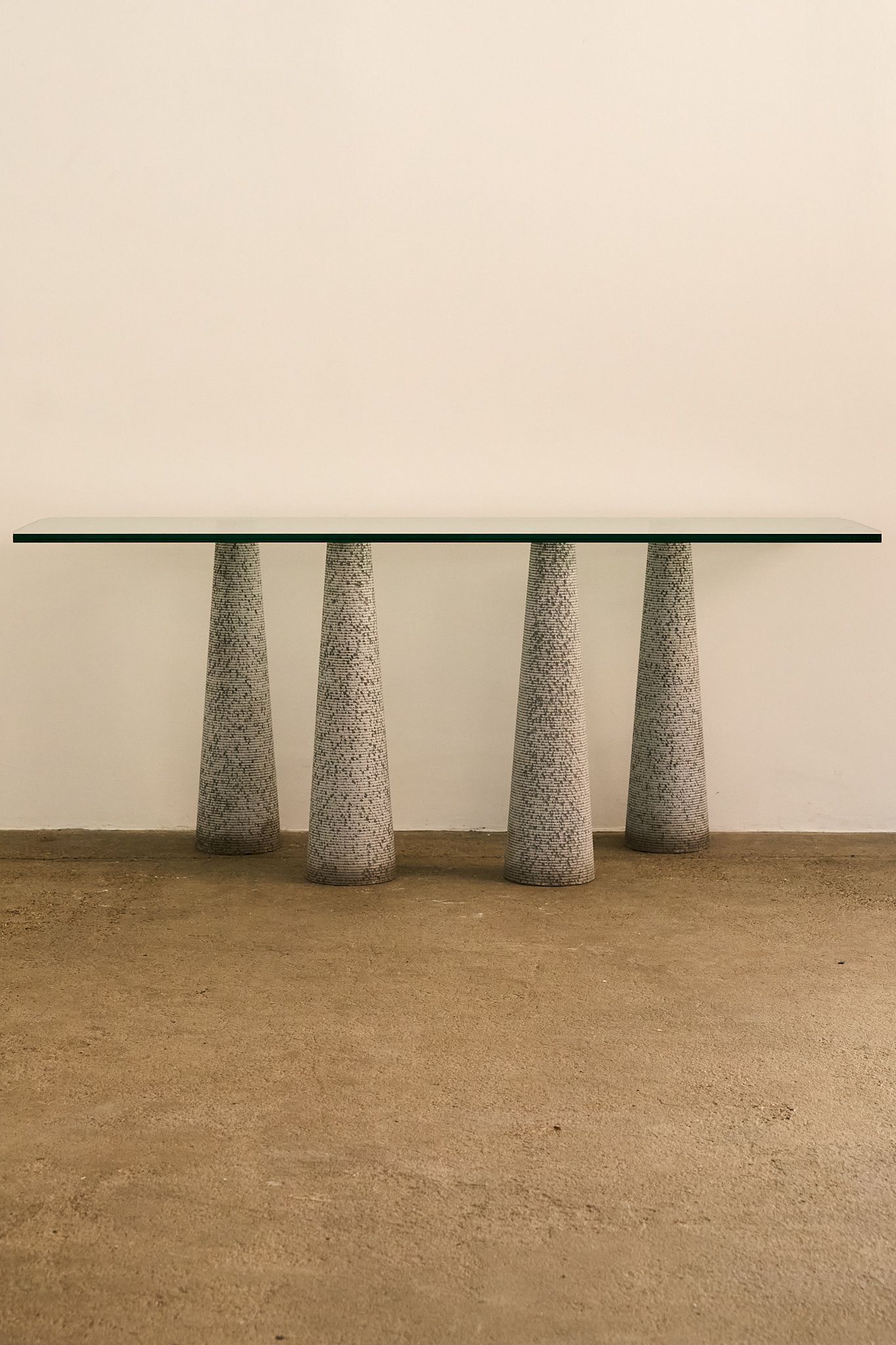 Striking console table by Luigi Lazzotti, featuring four sculptural conical bases in textured grey stoneware supporting a thick rectangular glass top. The tapering forms are rhythmically arranged, giving the piece both balance and monumentality. A refined example of Italian postmodern design, Lazzotti’s work here combines architectural rigor with artisanal surface detail, resulting in a piece that is at once minimalist and expressive.