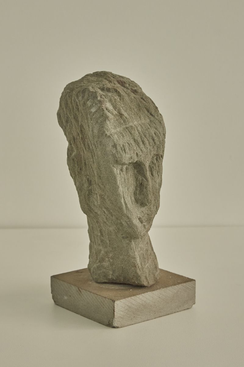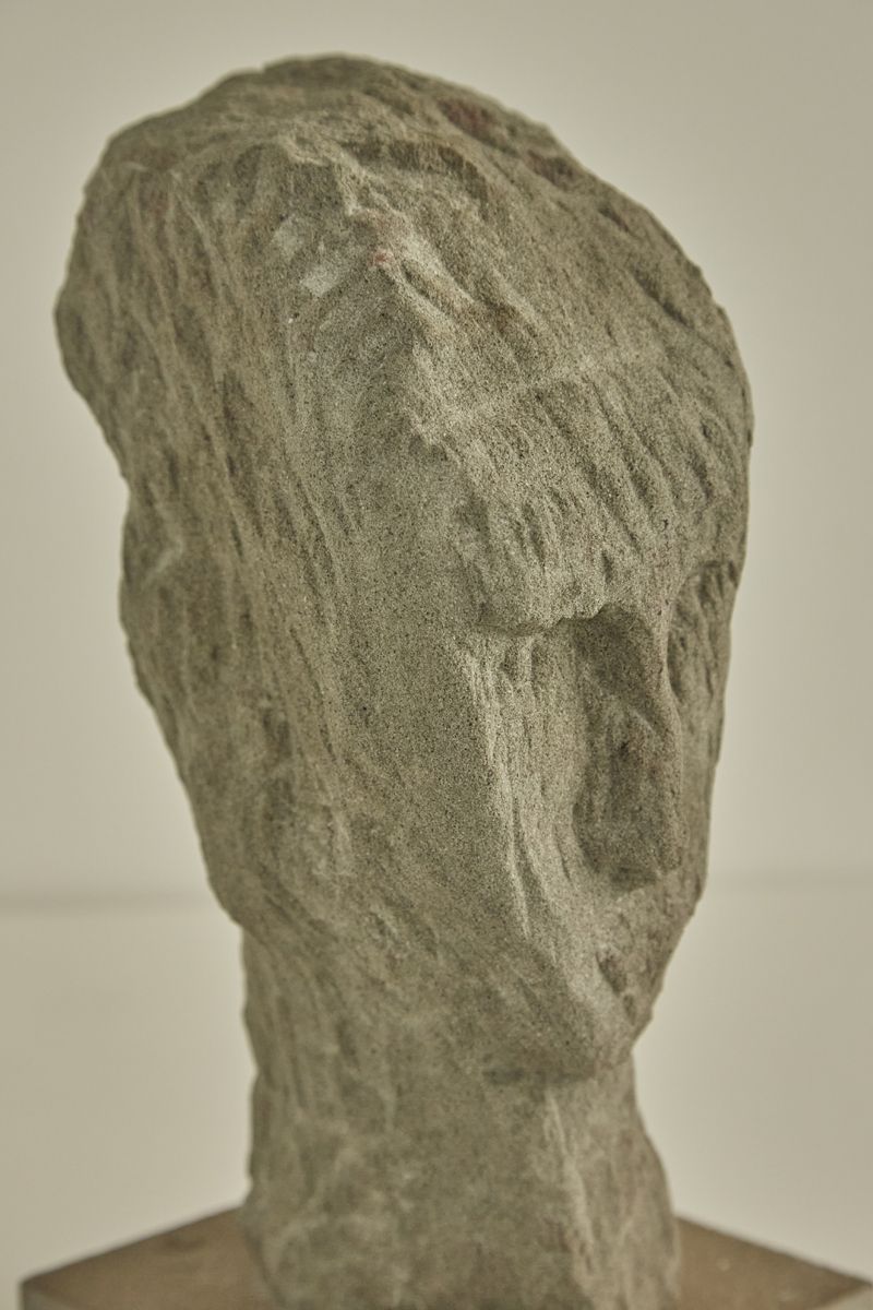 This is a sculptural piece by Italian artist Aldo Nava. The work features a rough-hewn stone or stone-like material carved into a minimalist, abstract representation of a human head. Its textured surface highlights the rawness of the material, while the simplified facial features evoke a primal and timeless quality. The sculpture is mounted on a square wooden base, giving it a grounded and sturdy presence.