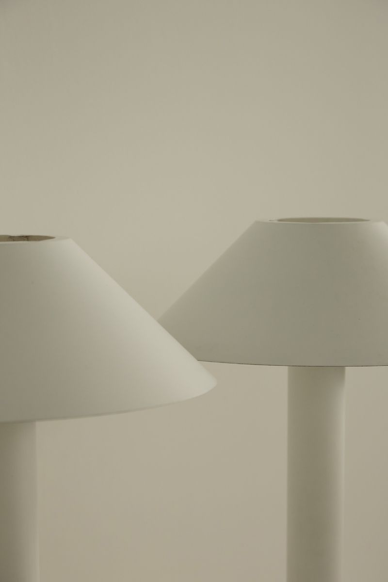 Pair of elegantly simple white table lamps. Featuring white lacquered metal cylindrical stems, conical shades, and sleek contoured bases. Price is for the pair.