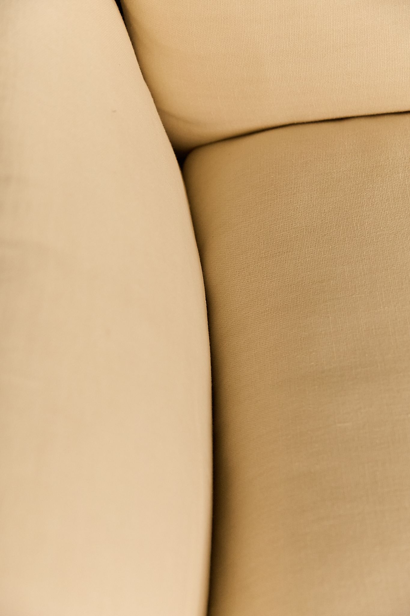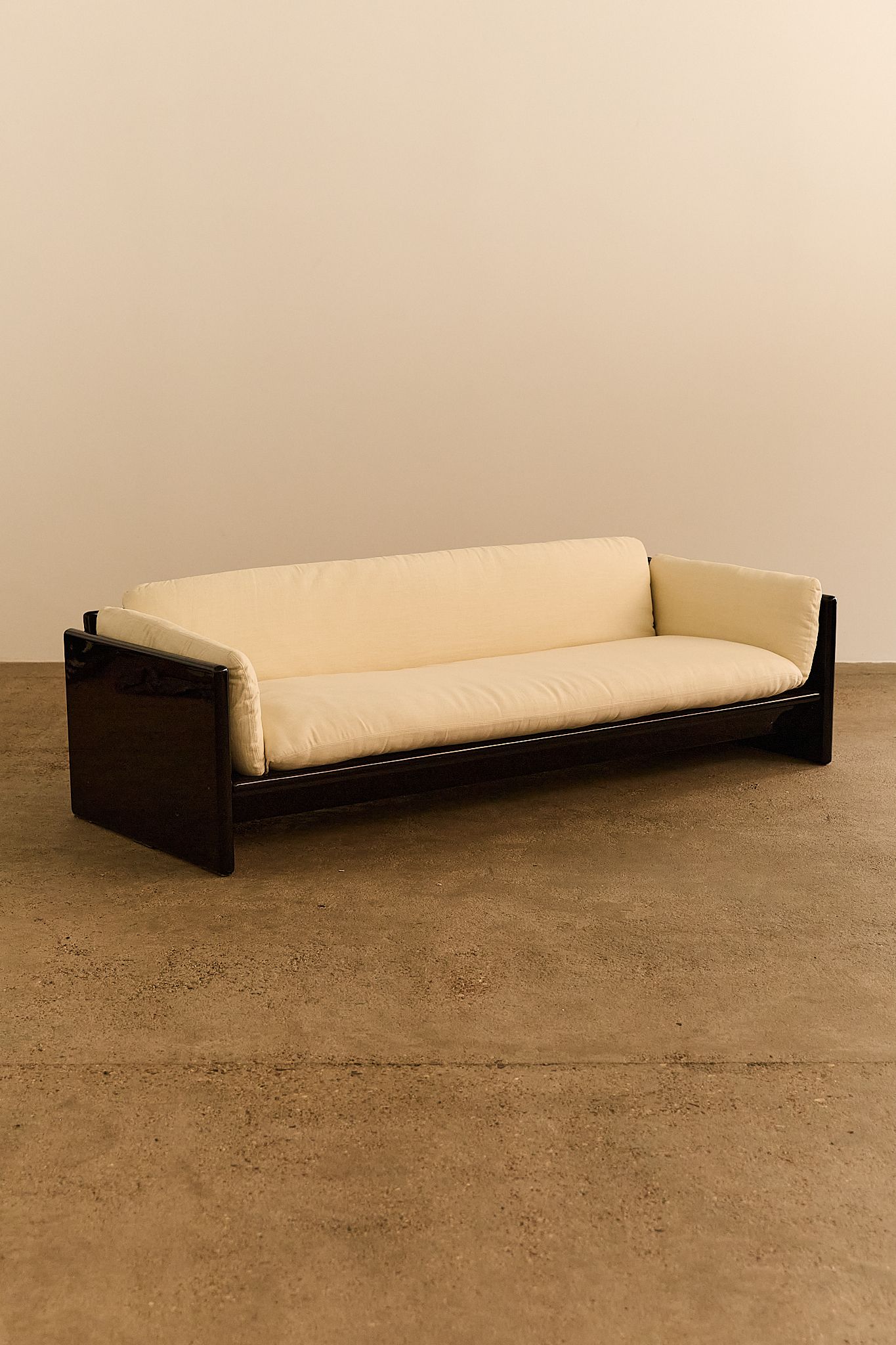 A sculptural 3-seater sofa designed by Kazuhide Takahama for Studio Simon (later re-named Gavina) in the 1970s. The frame is formed from lacquered black wood with Takahama’s simple but robust forms giving its structure punctuation. Newly upholstered in soft Italian linen, the plush cushions offer a fresh contrast to the rigid, minimal structure.