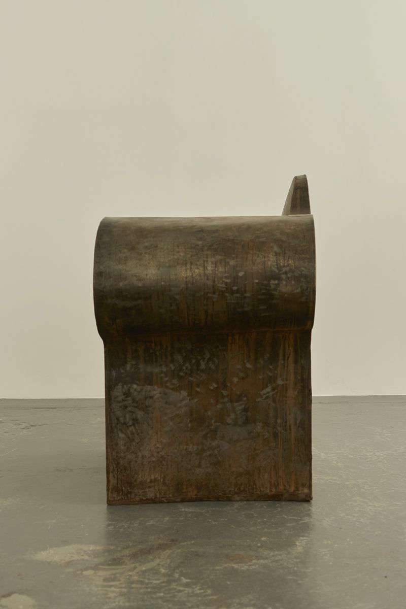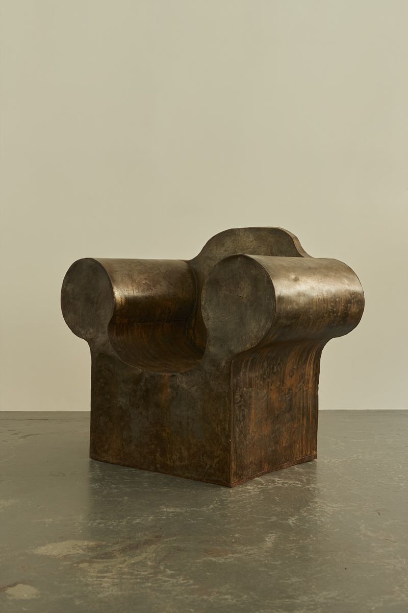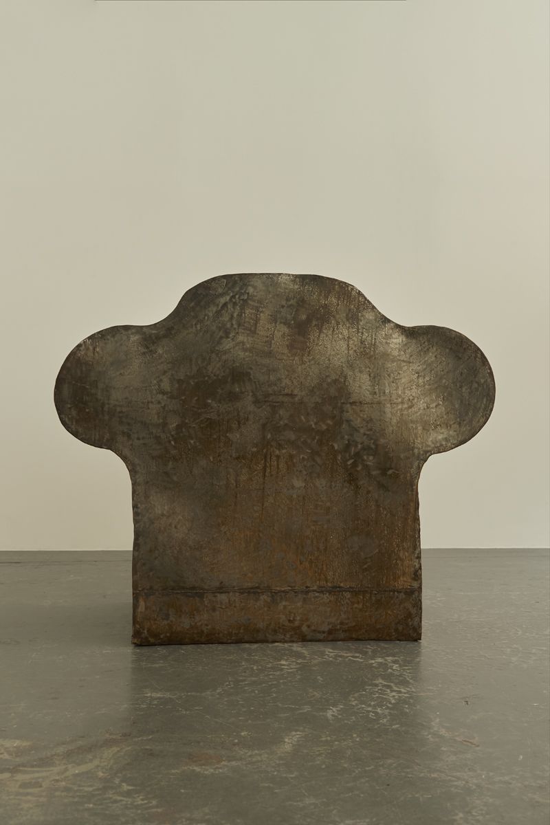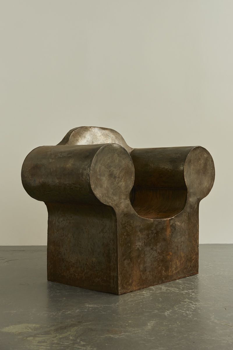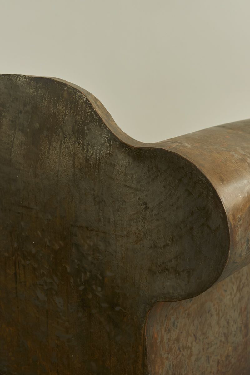 An extraordinary Italian artist’s chair, reminiscent of Ron Arad’s works. Crafted from metal sheets welded together to create a bulbous and lightweight hollow armchair with exaggerated proportions.