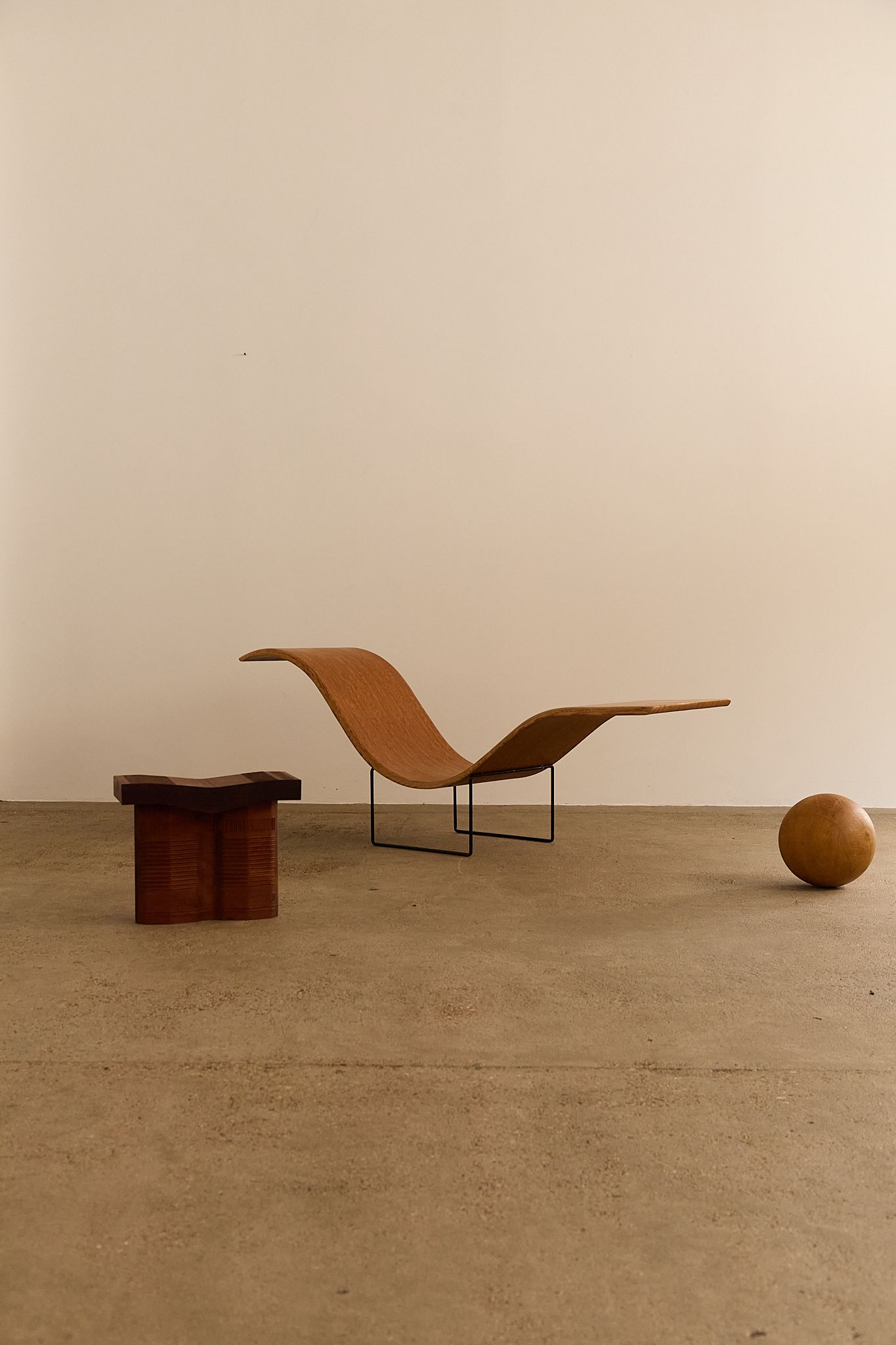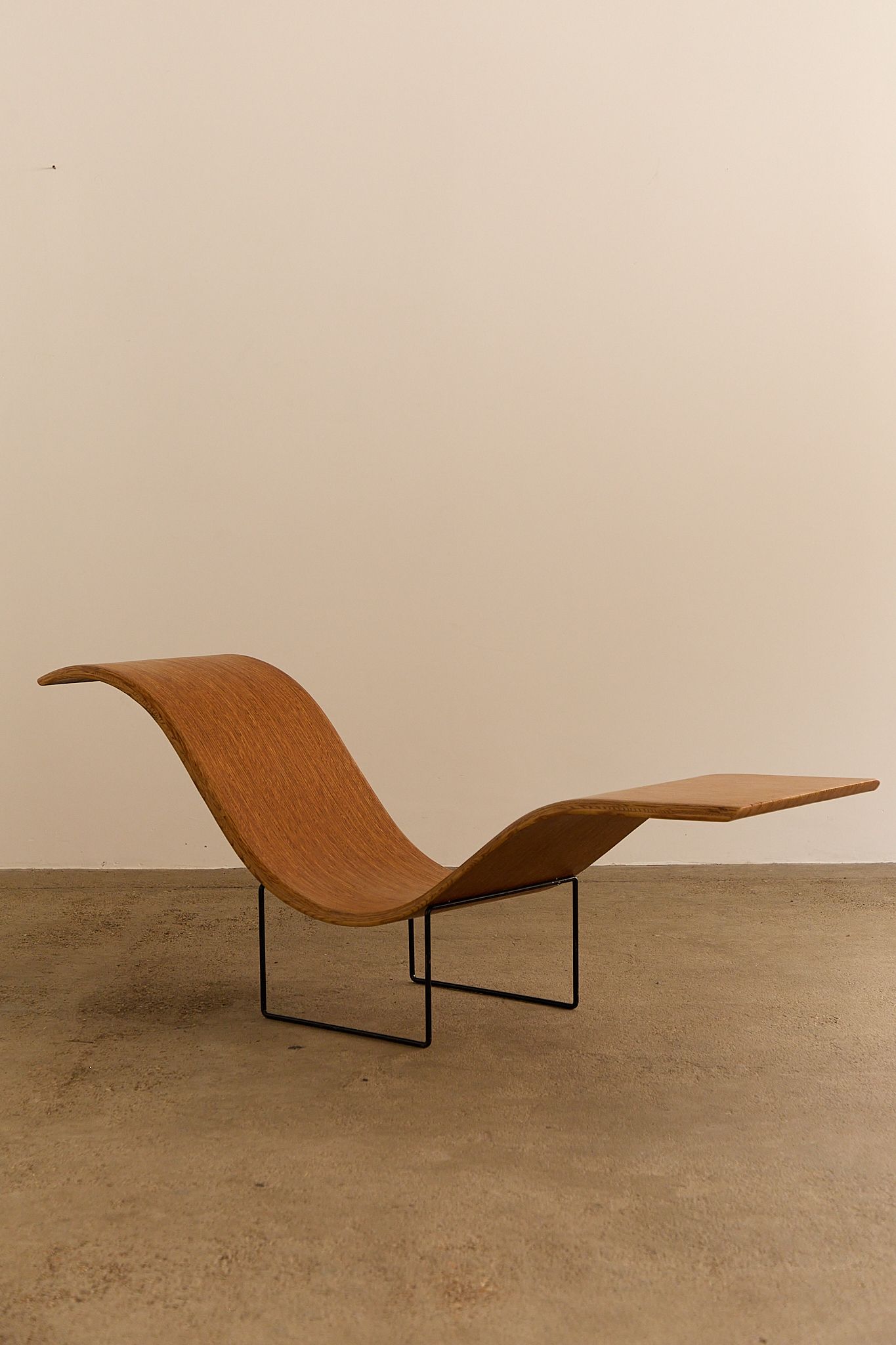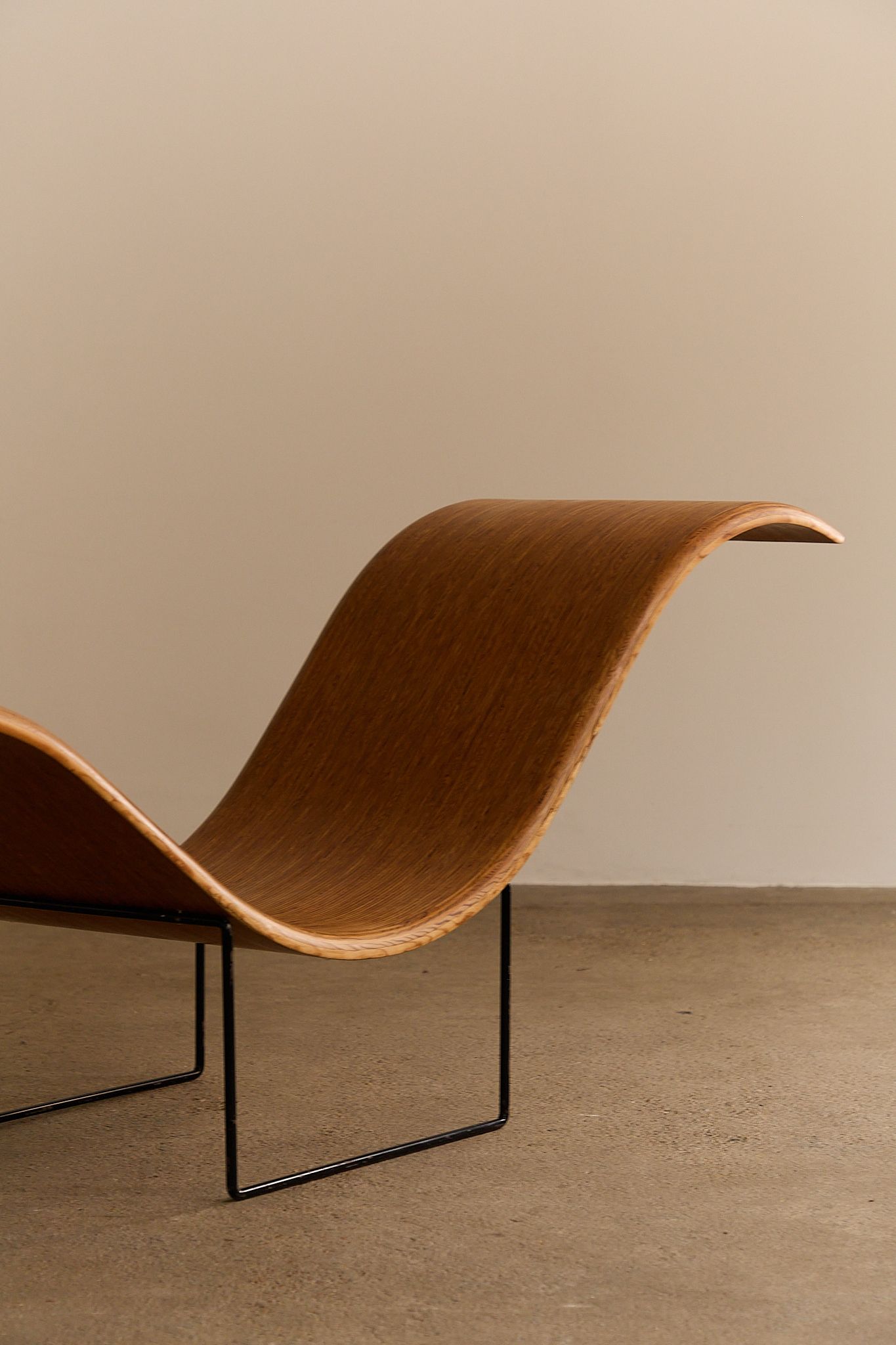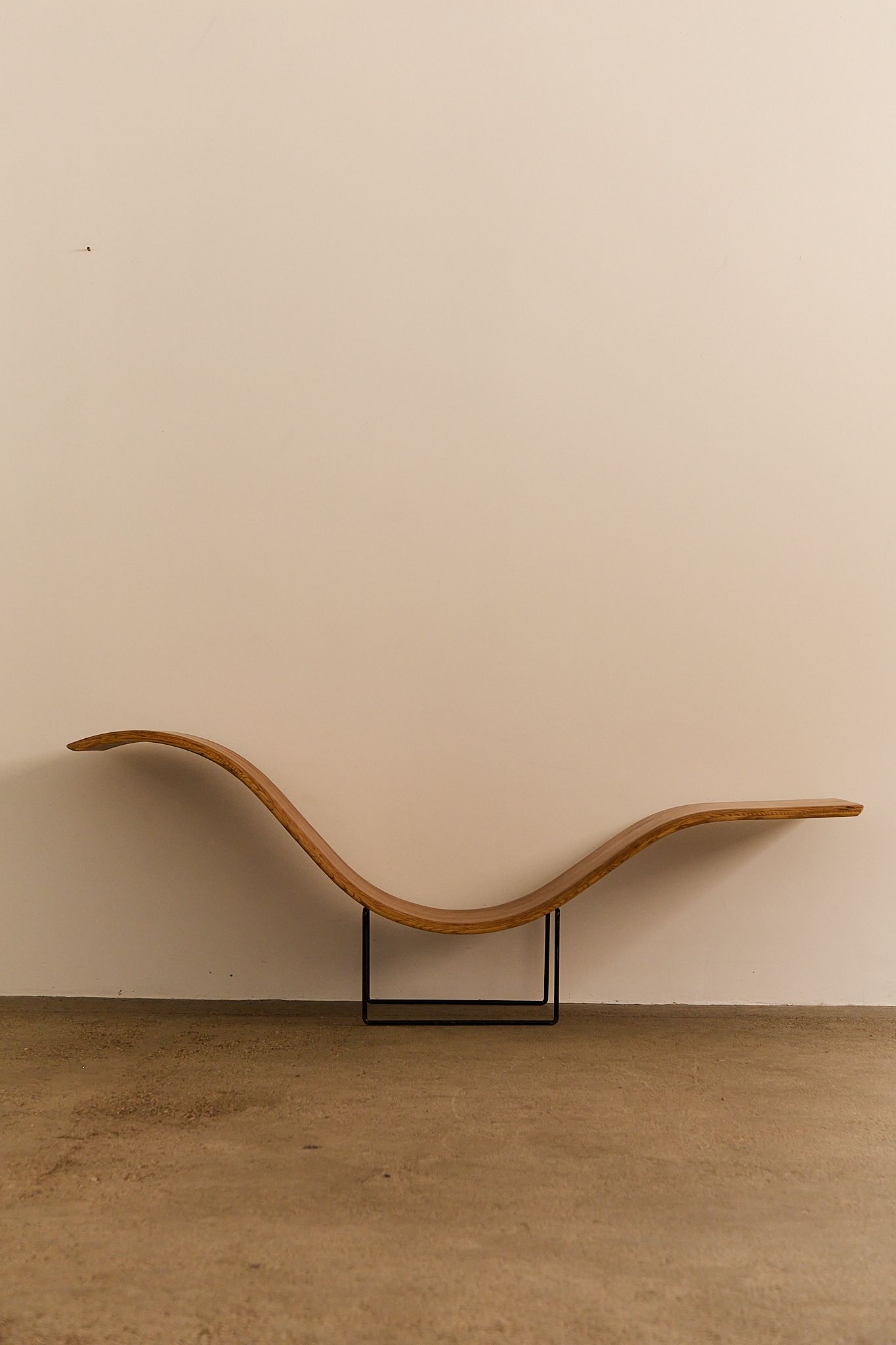 A striking lounge chair designed by German multi-media artist Tiller Lesser in 1990. This rare piece exemplifies the distinctive aesthetics of his work from that period, featuring an elegantly curved, stack-laminated wooden seat that appears to float on a minimal black metal frame.