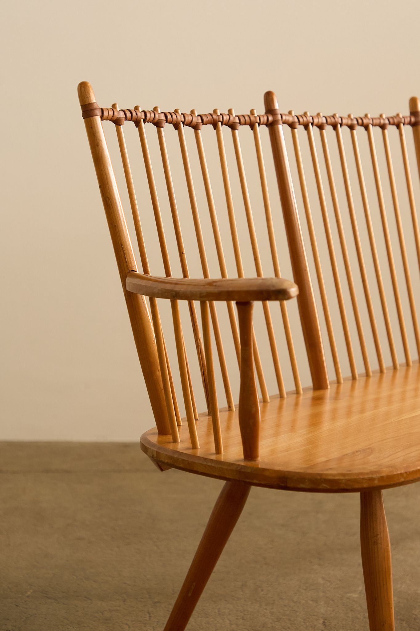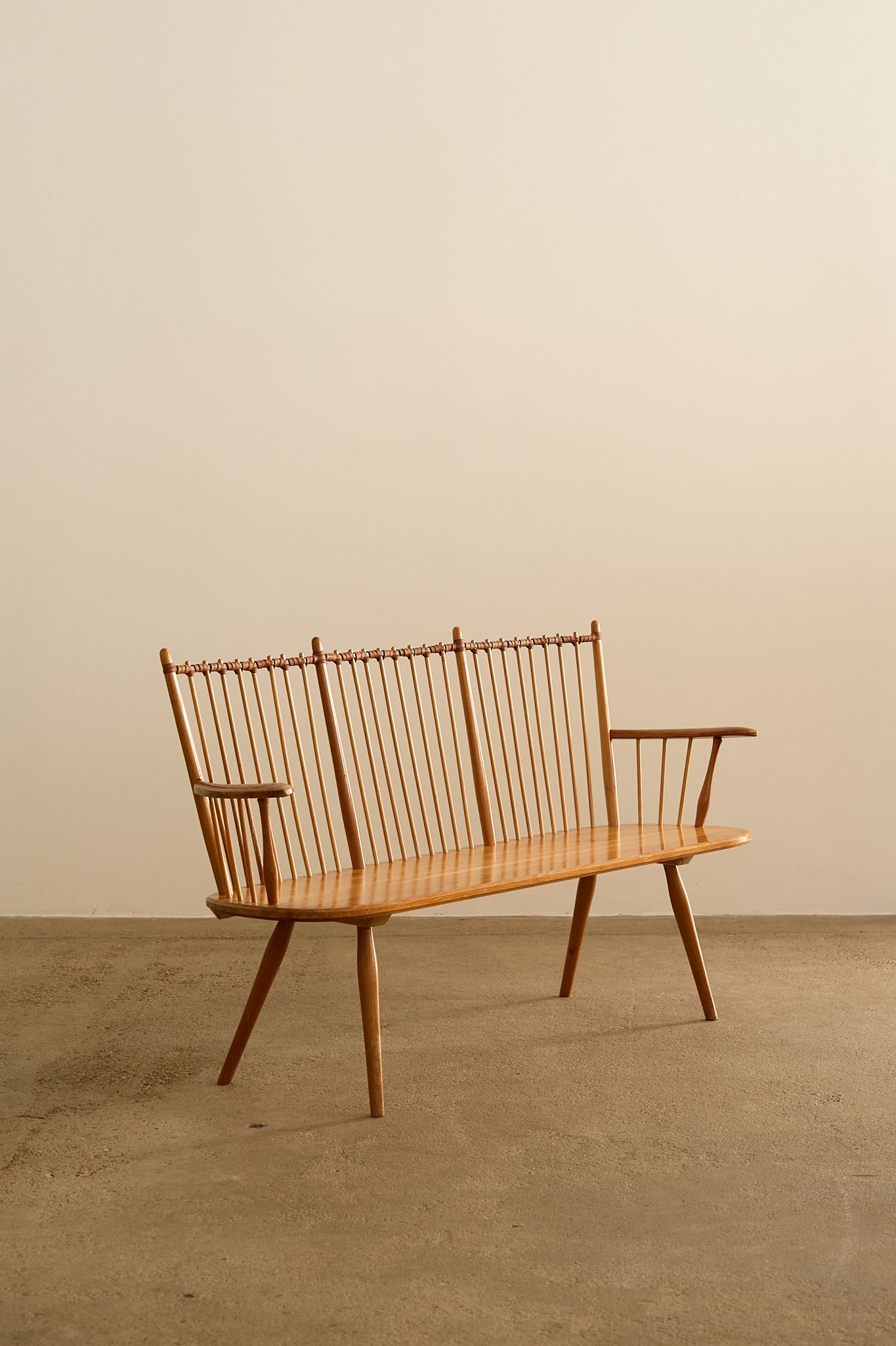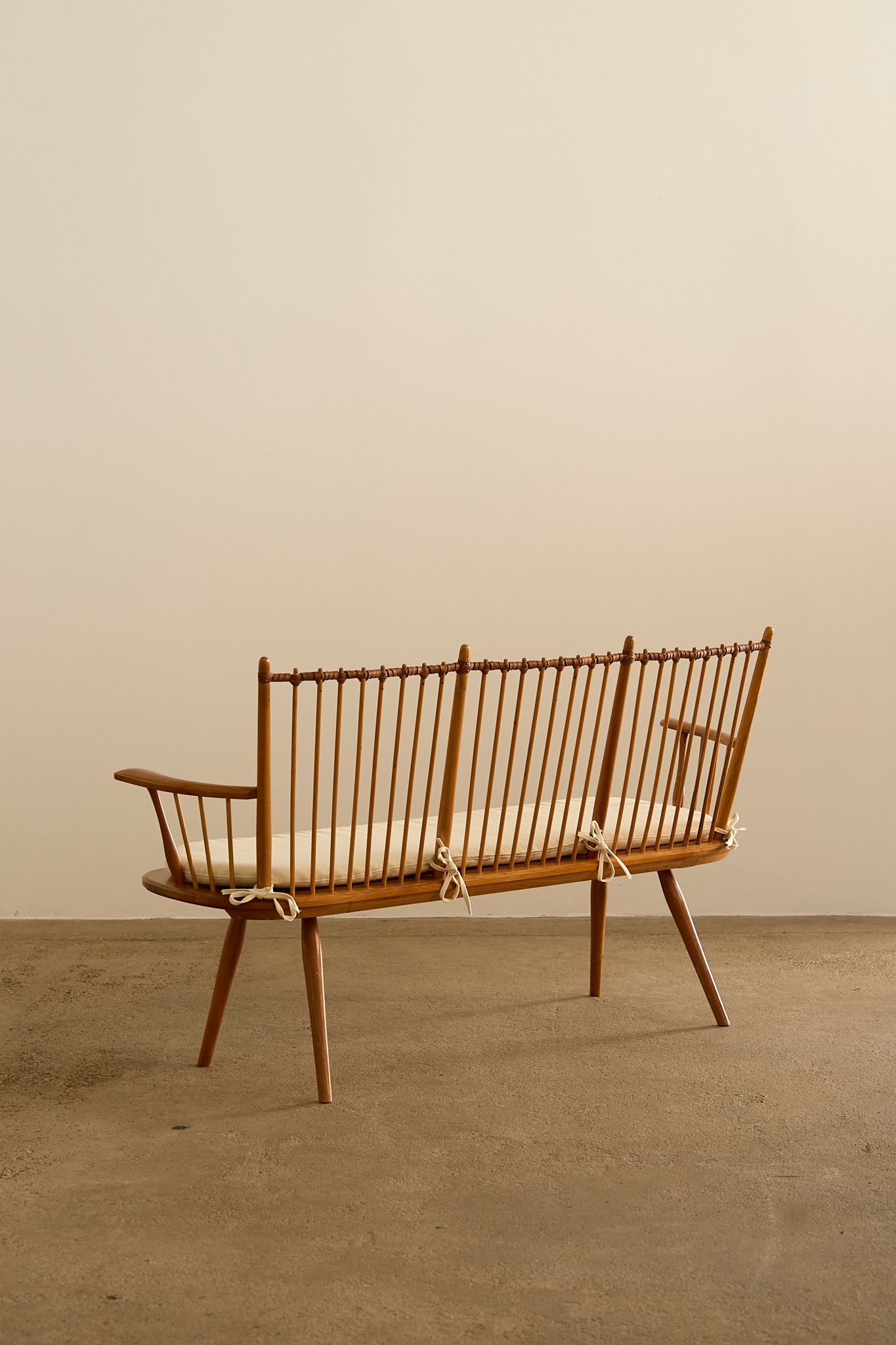 Very rare 1950s bench crafted from solid cherry wood, designed by Albert Haberer for Fleiner. The backrest features spindles secured with leather straps, providing both strength and flexibility. A fine example of German craftsmanship. The seat has been newly reupholstered in linen.