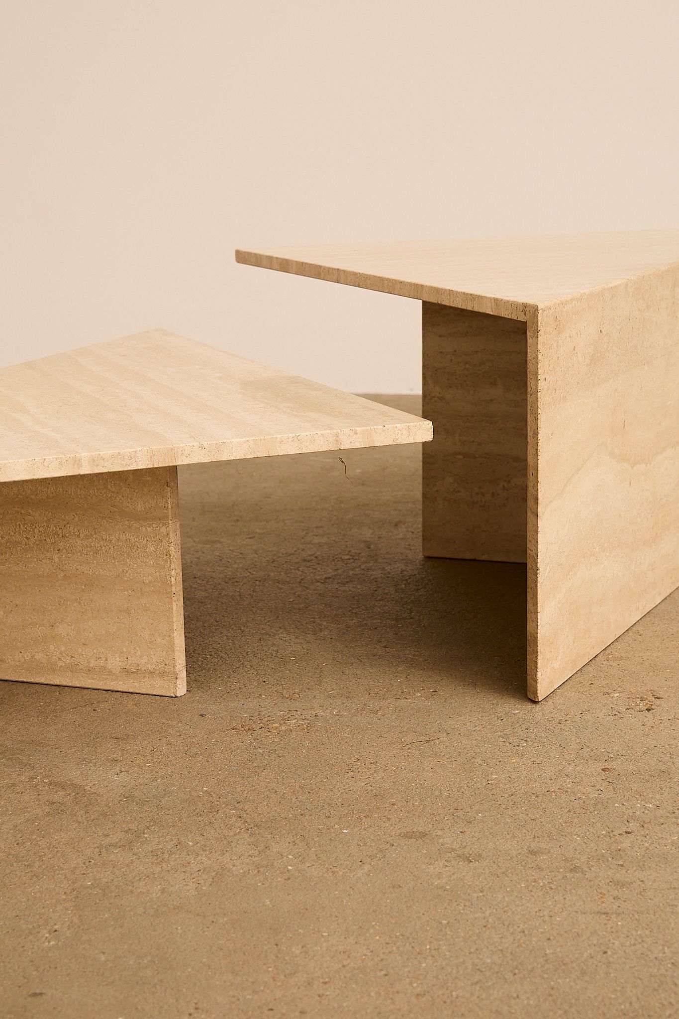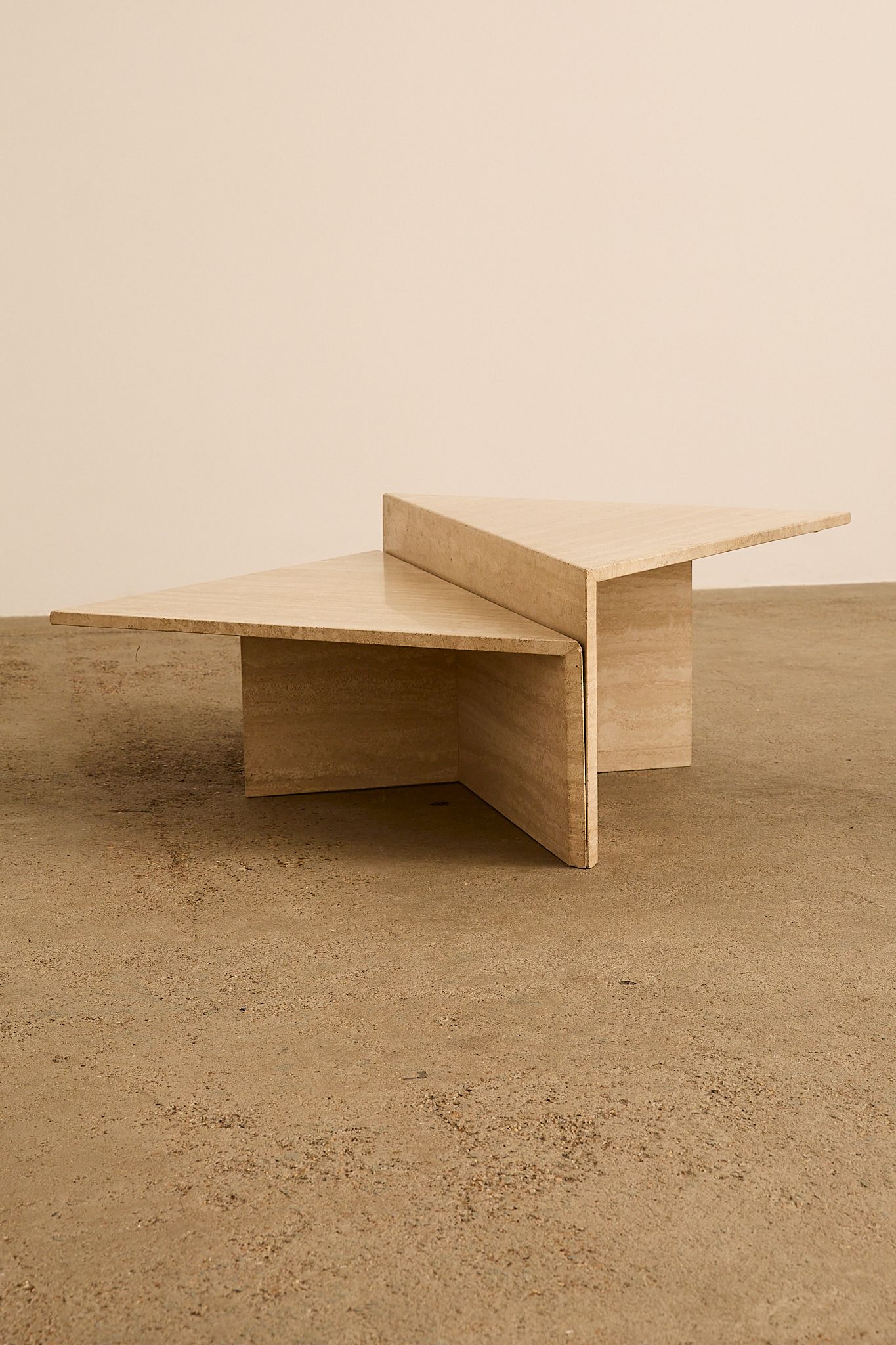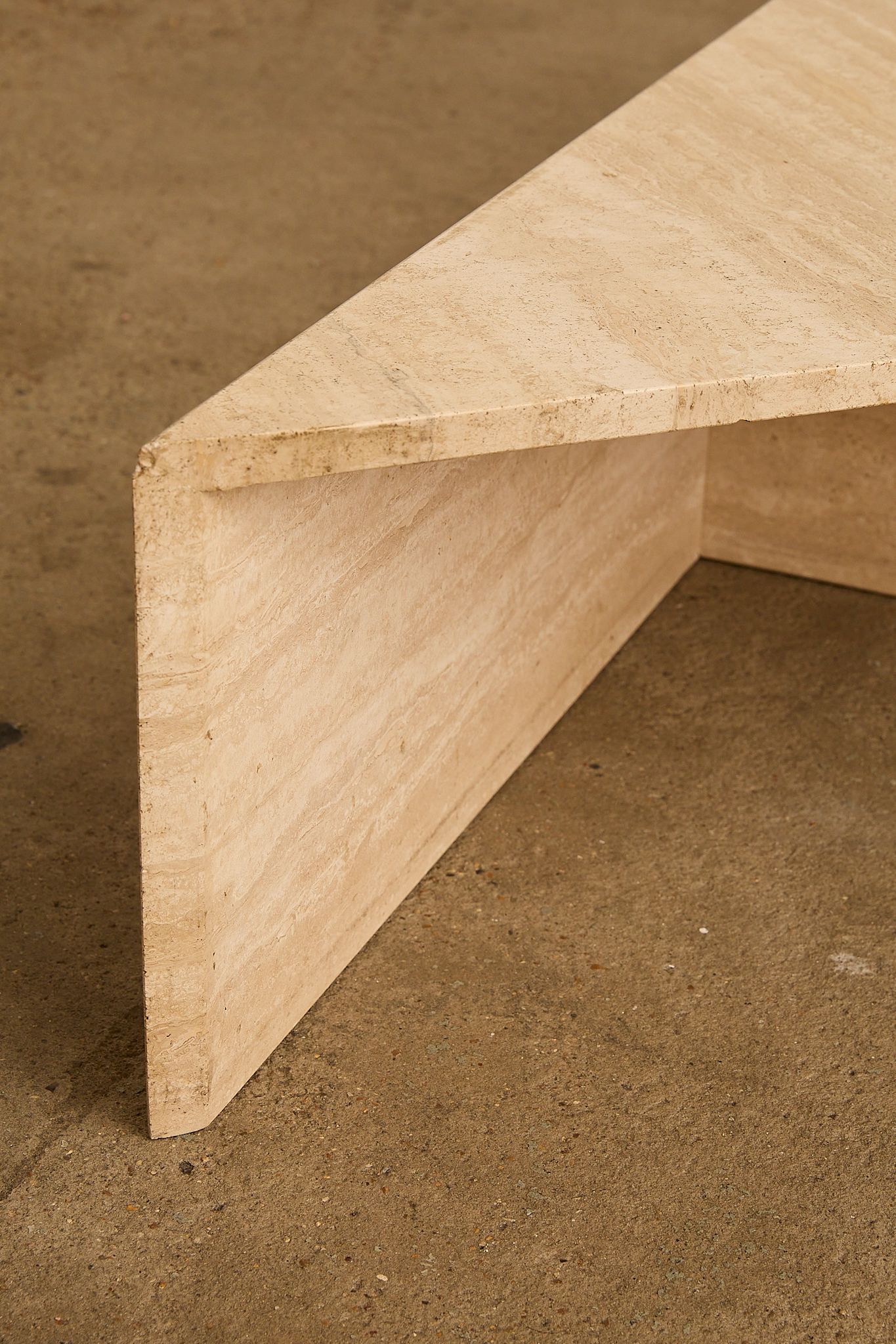A striking 1970s Italian travertine triangle coffee table by Up&Up, featuring bold geometric design and natural stone texture.