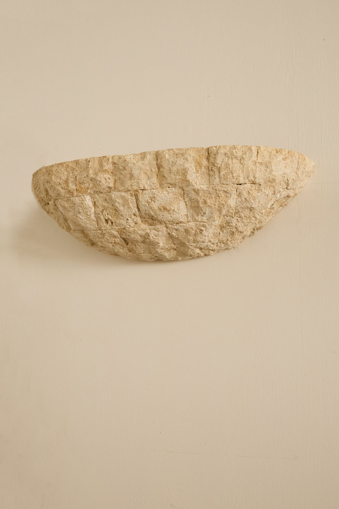 Handcrafted in textured stone, these sculptural half-moon sconces cast a warm, indirect glow. Their organic, rough-hewn surface evokes the character of traditional French masonry, while the simple geometric form gives them a timeless, architectural presence. Price is for the pair.