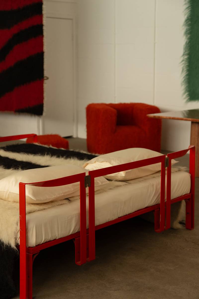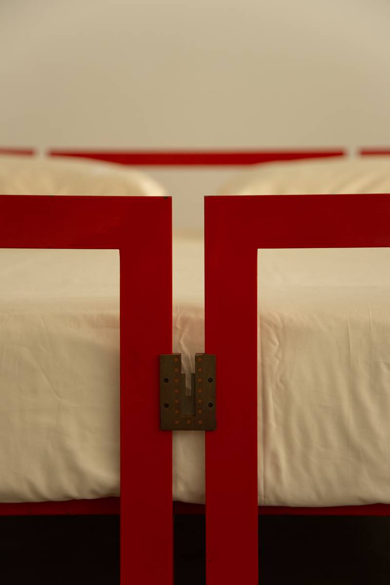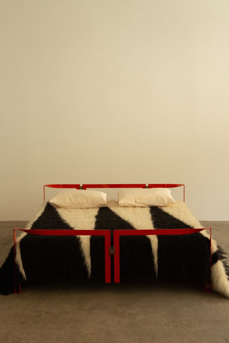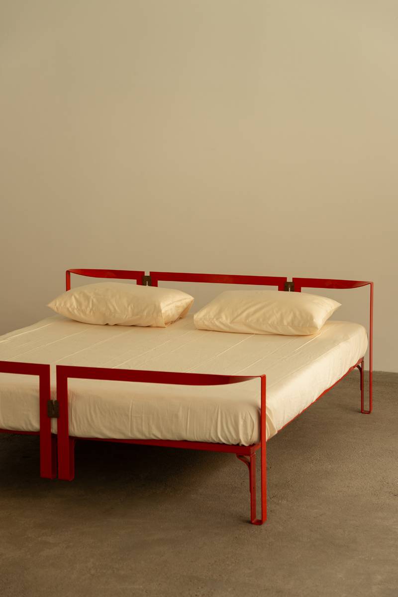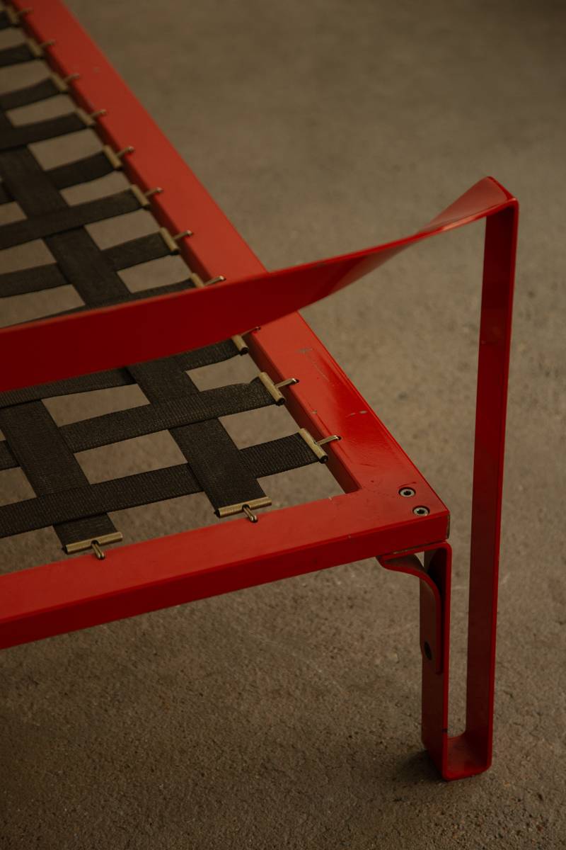 Striking bed design featuring a powder-lacquered metal frame in bold China red. The structure includes a matching headboard and footrest, with the support frame and base constructed from tubular metal. Stainless steel linking elements add a refined, decorative touch to the geometric composition.