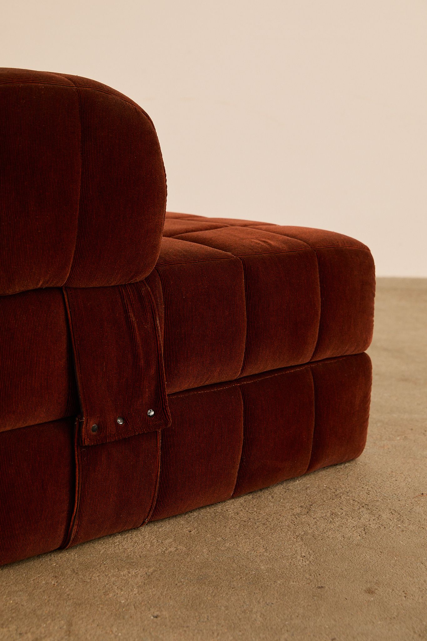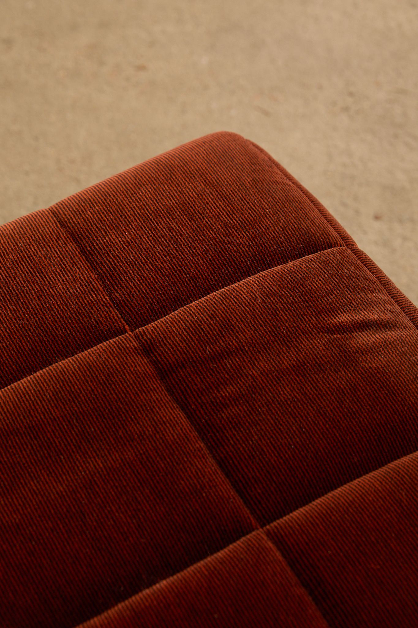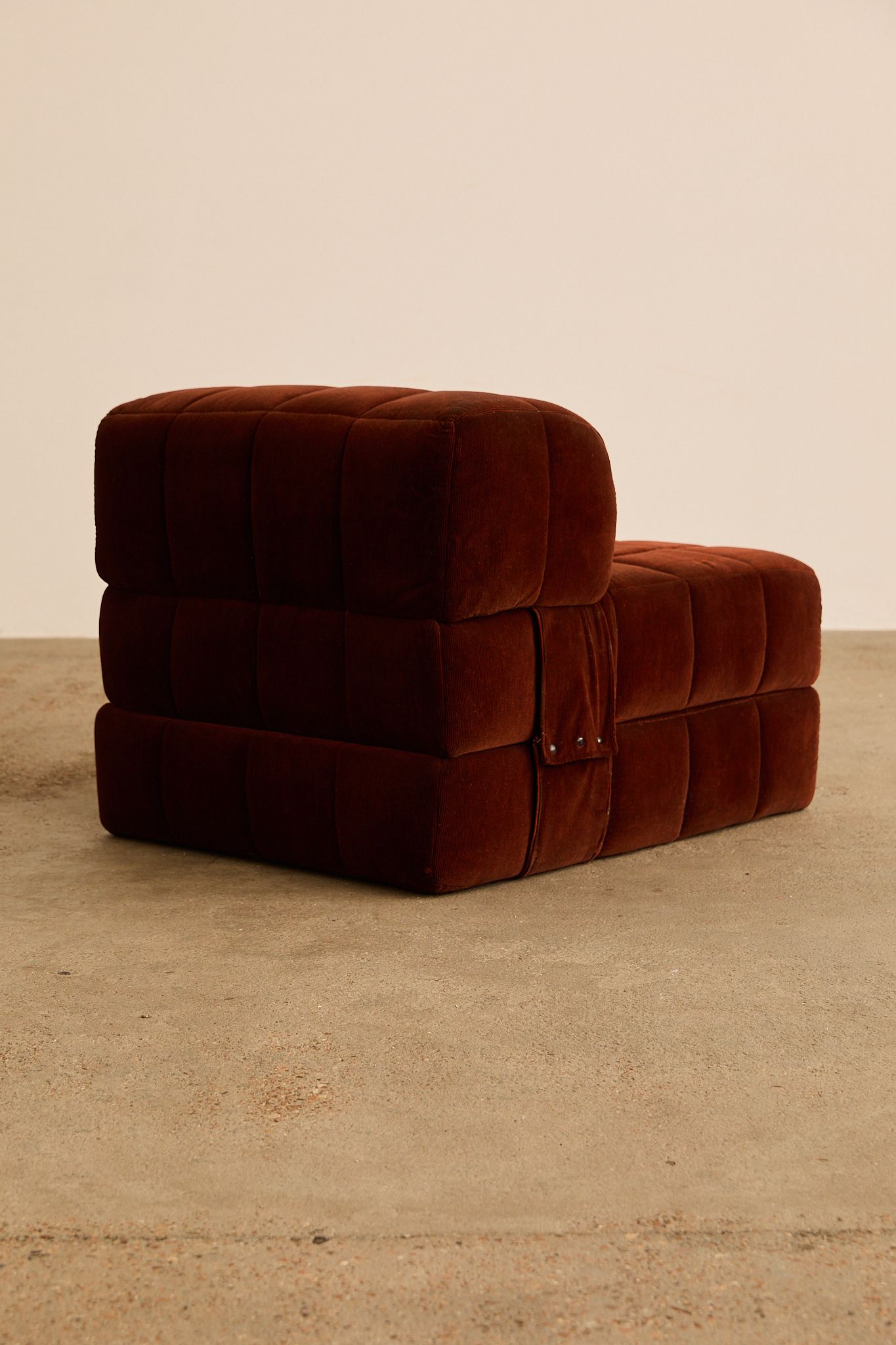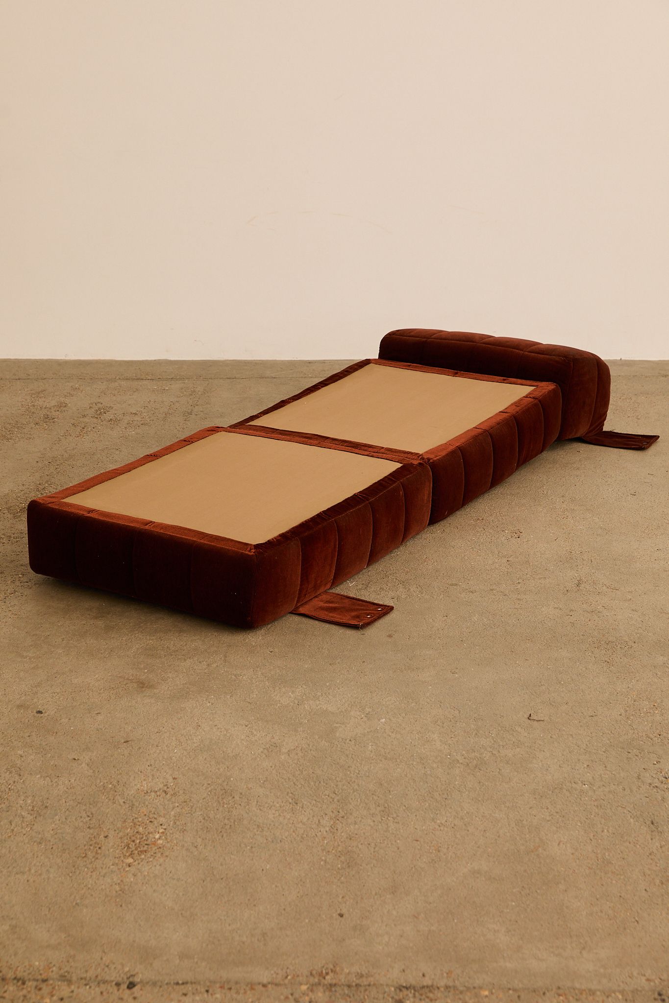 A low, sculptural velvet lounge chair with deep tufting that easily unfolds into a comfortable single bed.