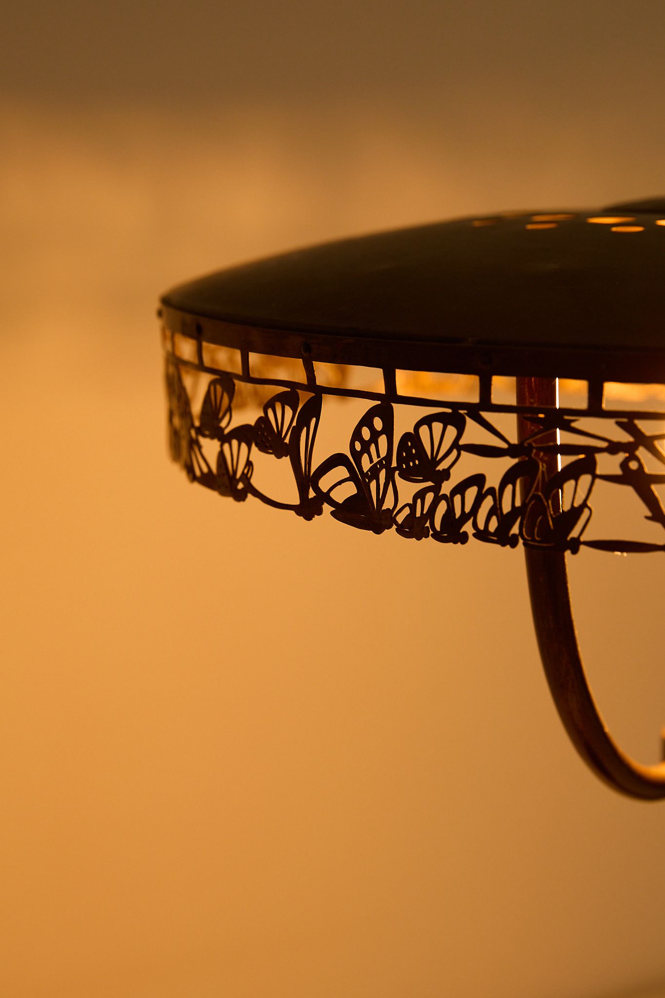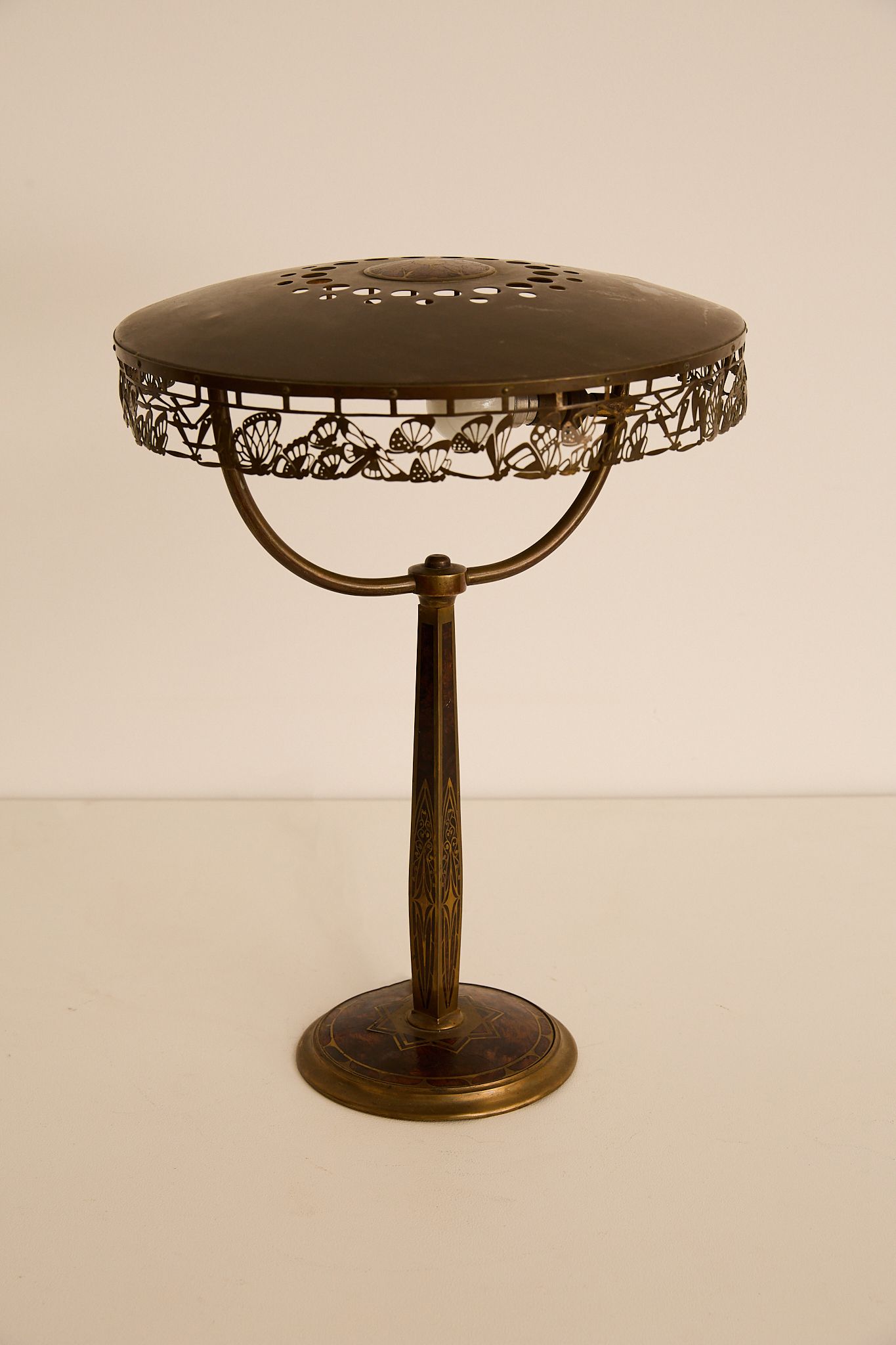 Austrian brass table lamp from the early 1900s, adorned with decorative details throughout.