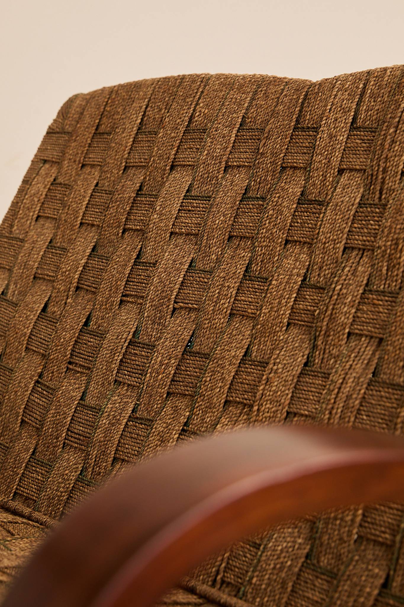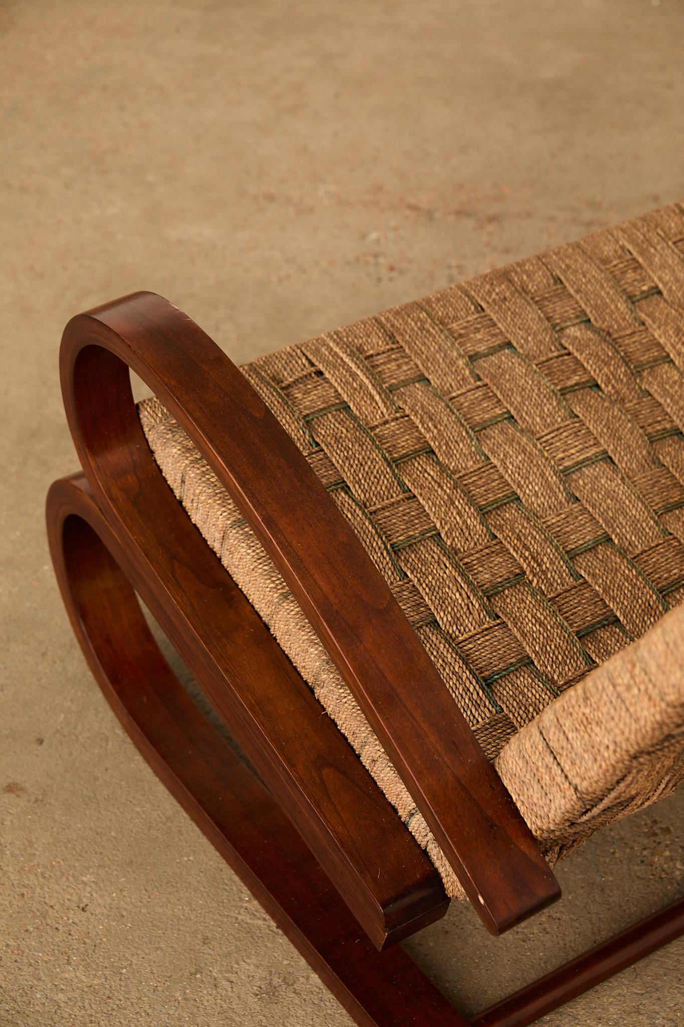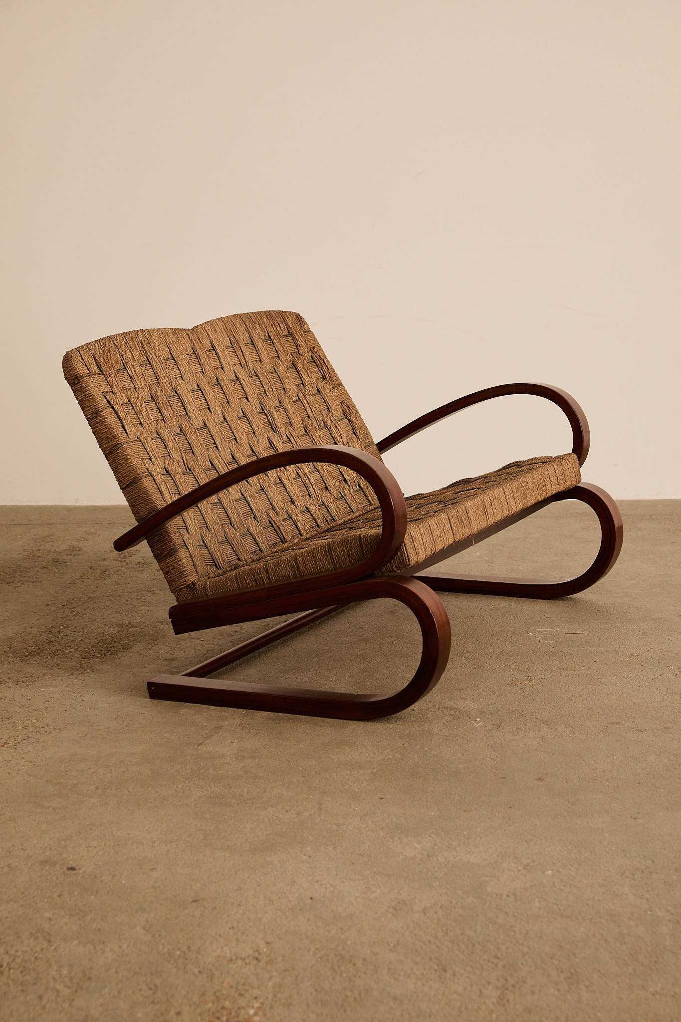 1940s Italian lounge settee with a sculptural steam-bent wood frame and hand-woven rope/cord seat and back; attributed to Italian rationalist architect and designer Giuseppe Pagano.