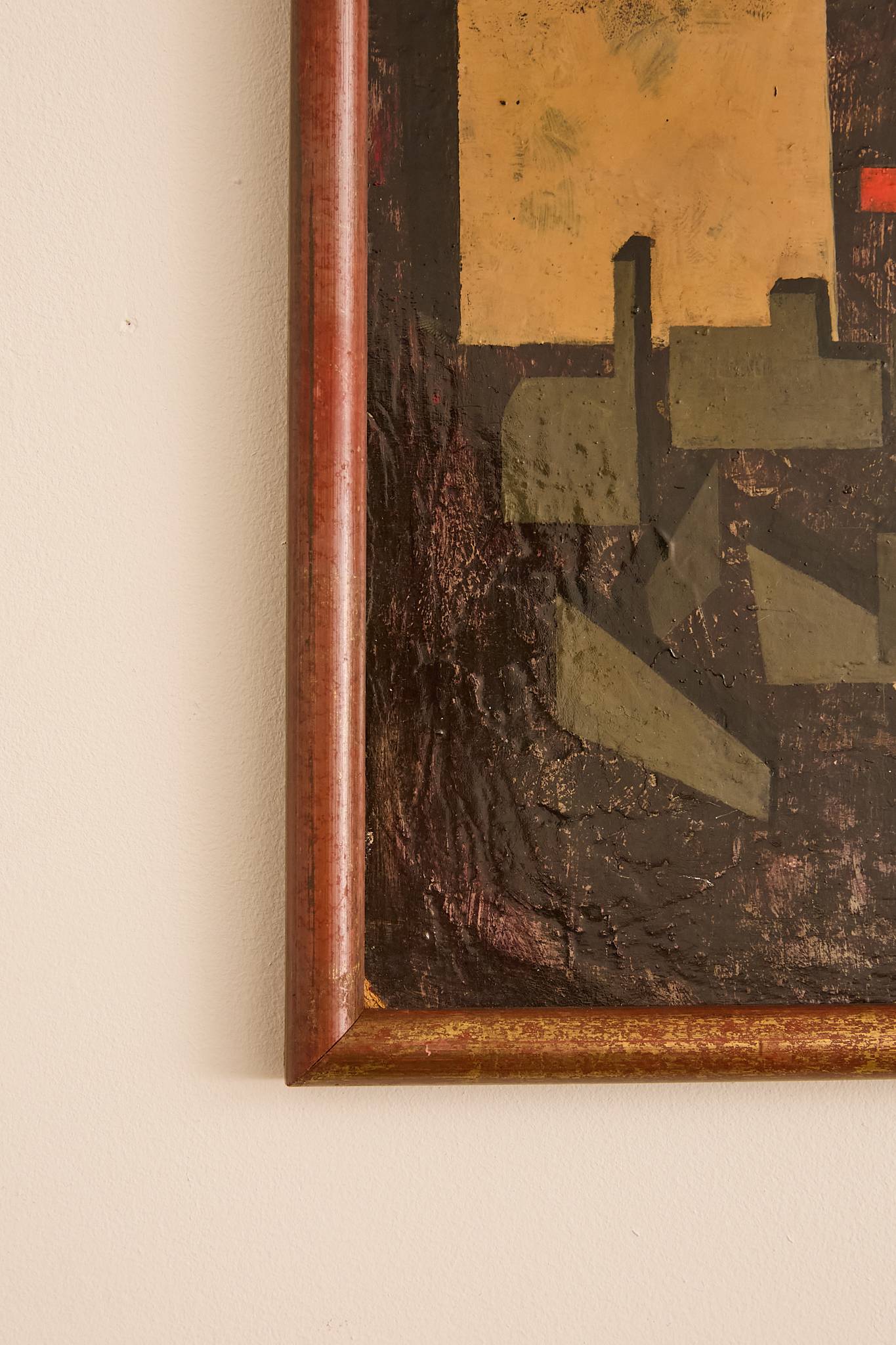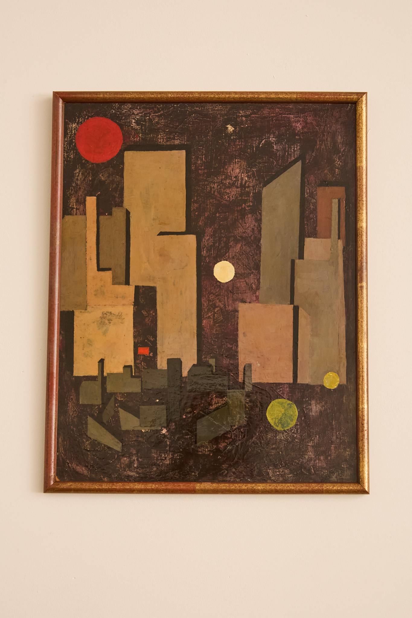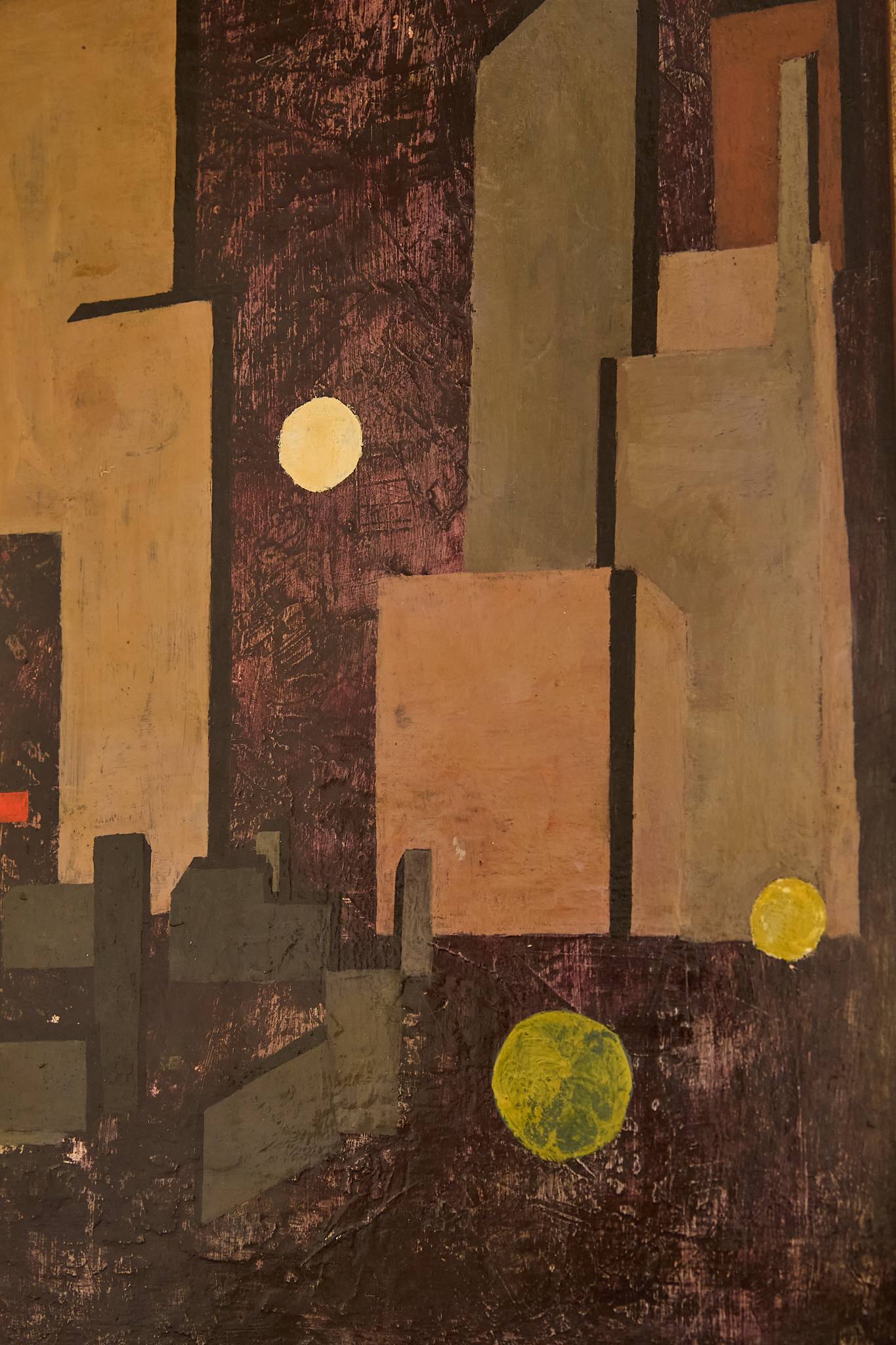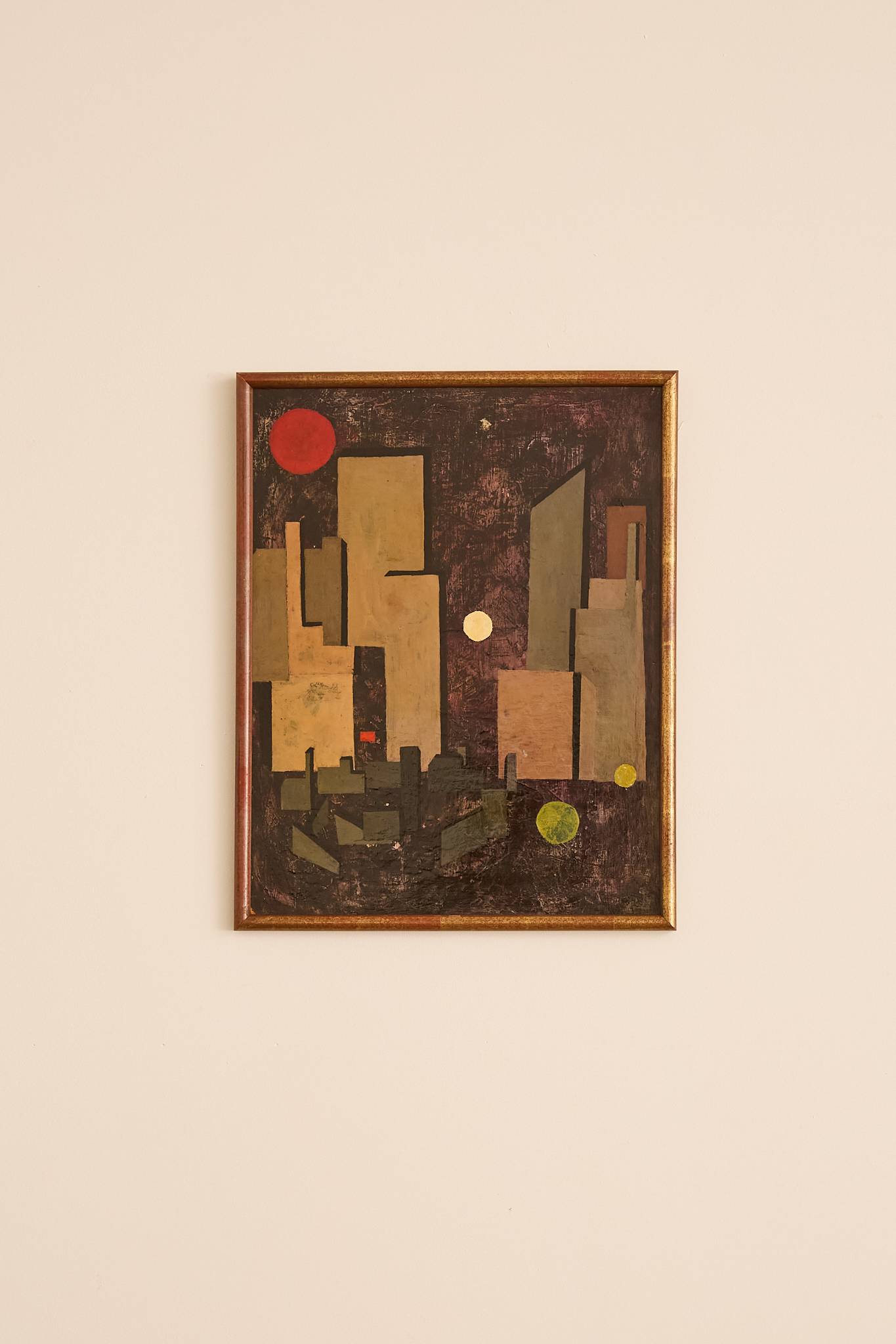 Abstract cityscape painting with geometric blocks in muted ochre, taupe and green set against a richly textured dark ground, punctuated by circular suns or moons in red, yellow and lime. The work has a strong mid-century feel, with layered brushwork and a graphic composition that suggests buildings at night. Presented in a simple gilt wooden frame with light age patina consistent with wear and time.