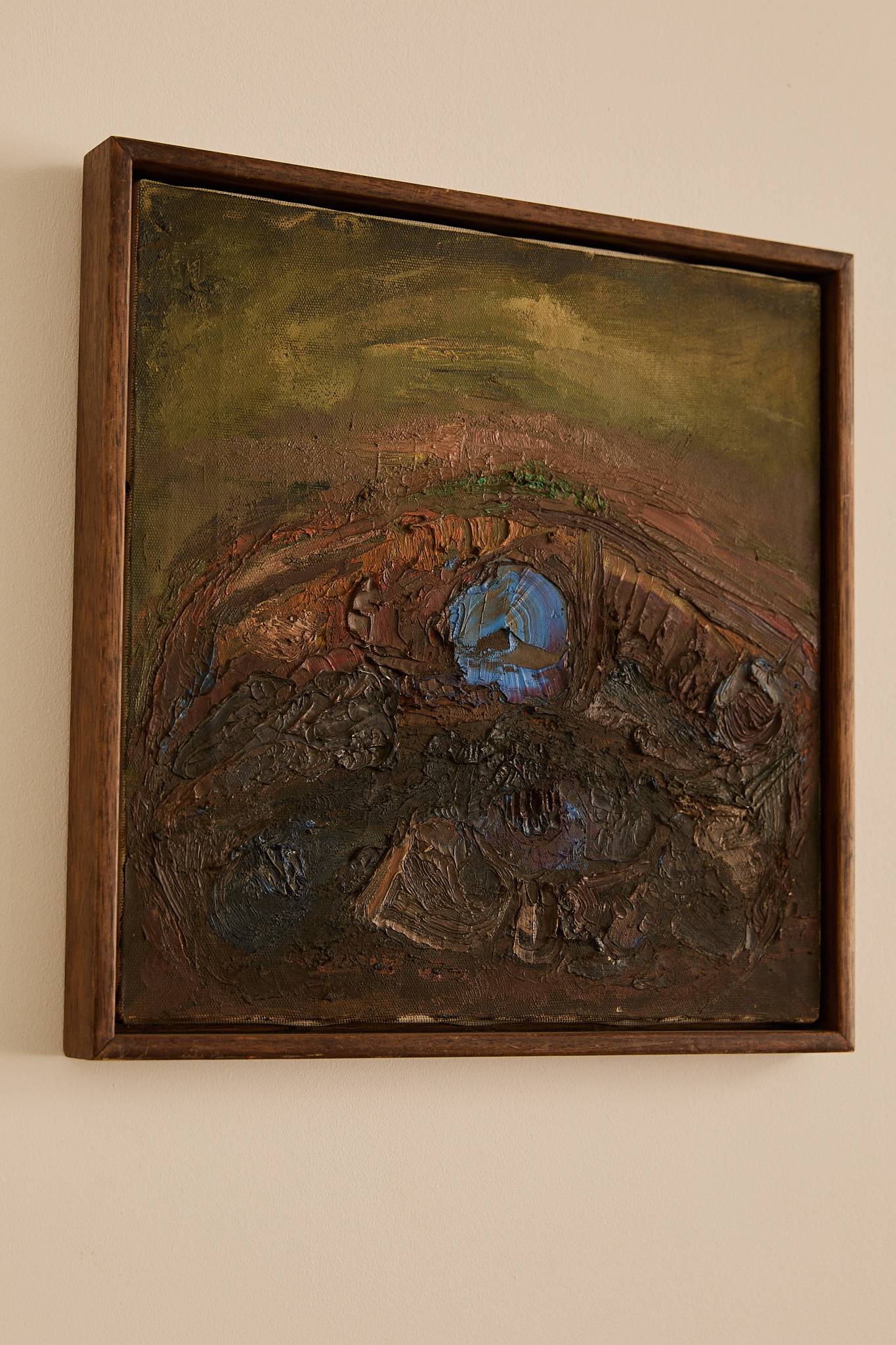 An abstract painting with rich, layered texture and an earthy palette of browns, greens, and deep blues. The composition suggests a buried horizon or inner landscape, with a subtle blue focal point emerging from the darker surface. Presented in its original wooden frame, which forms an integral part of the work. Italian painter Goliardo Padova (1909–1979) fused Po Valley lyricism with modern Milanese currents—from Chiarismo to Corrente—leaving a quietly radical, grain-lit body of work.
