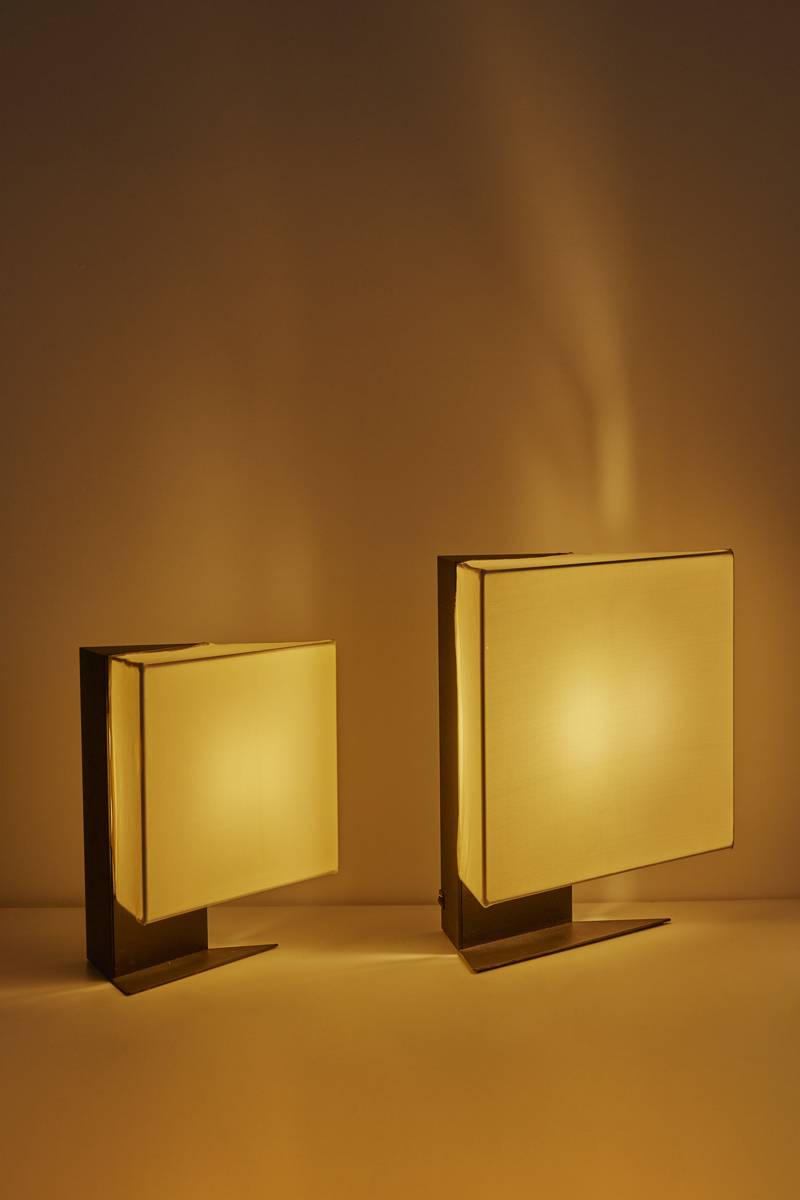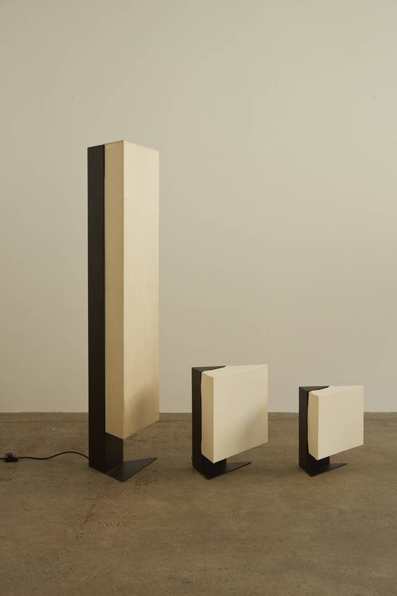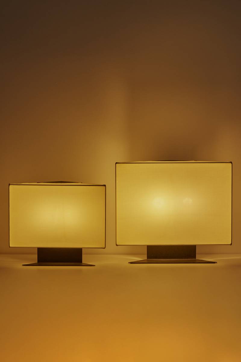 Rare table lamps designed in Italy in 1978 by Cini Boeri for Artemide. Featuring a triangular shape in black steel with white fabric stretched over a wire frame. Equipped with two standard E27 socket lights. Price is for the pair.