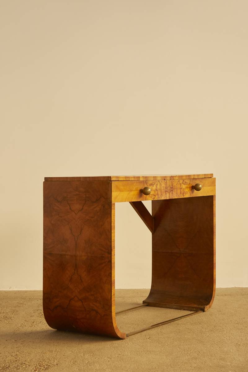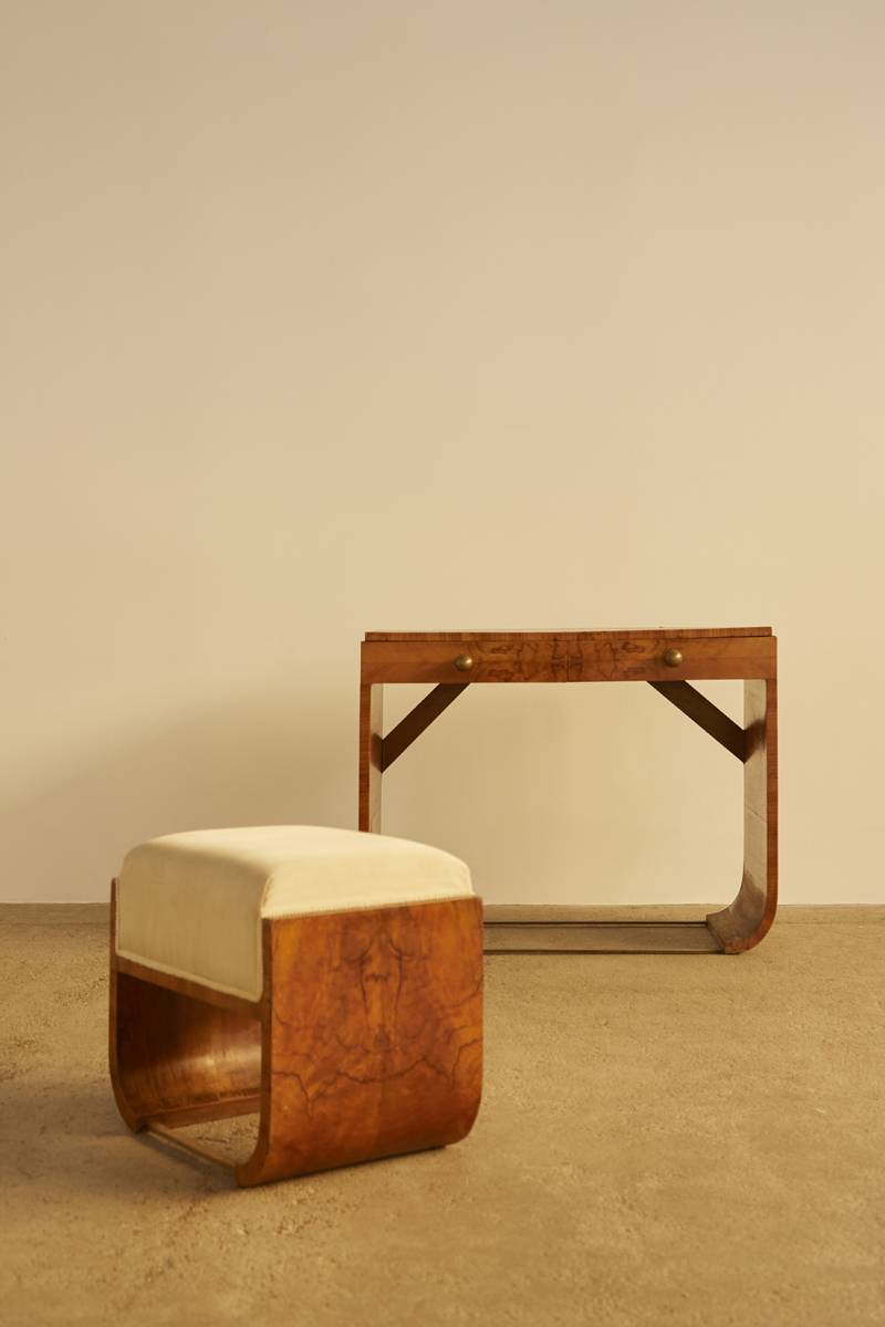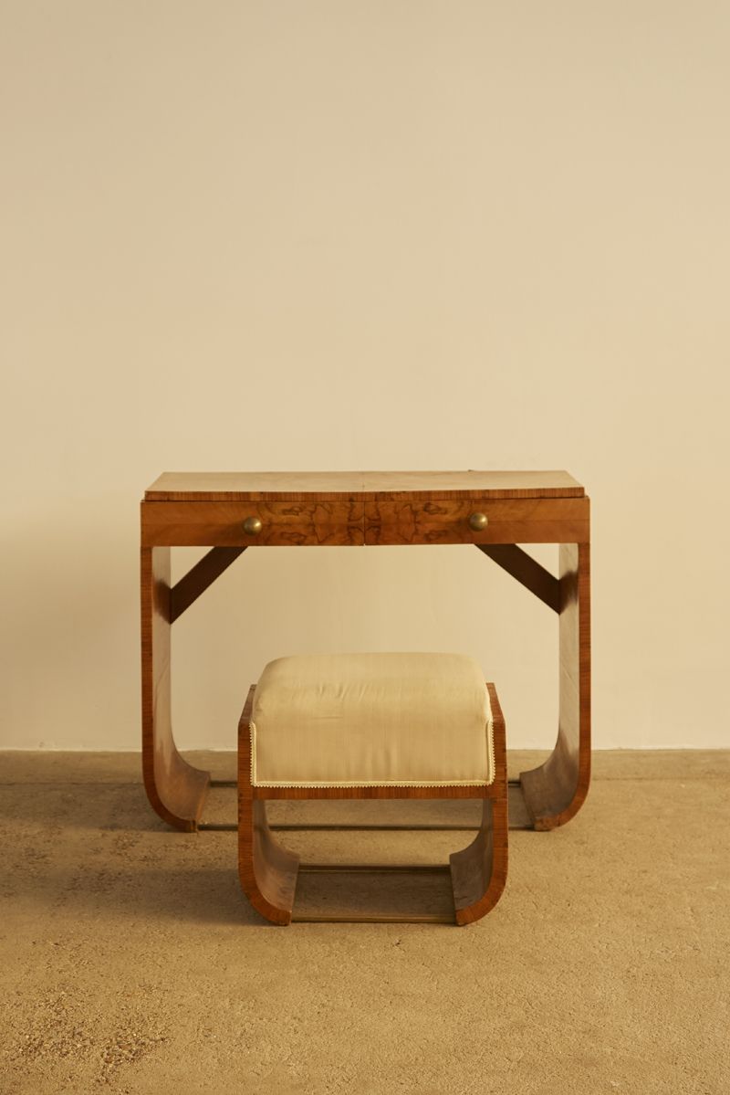 This elegant Art Deco desk features a rich burlwood veneer, brass knobs, and sleek geometric lines characteristic of the era. Accompanied by its matching ottoman, upholstered in the original fabric, this set exudes vintage charm and sophistication. The desk’s compact size and timeless design make it a perfect addition to a stylish workspace or bedroom.