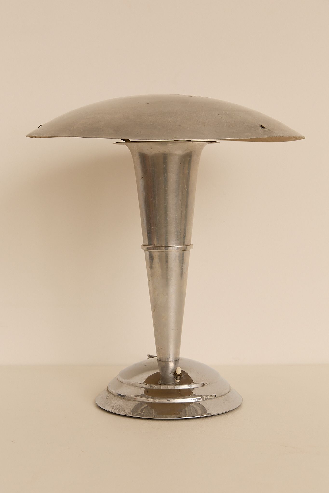 Art Deco table lamp, France, circa 1930s. Made of chromed metal, it features a wide circular shade, tapered conical stem, and stepped round base. The lamp’s clean geometry and polished finish reflect the refined elegance and modernity characteristic of French Art Deco design.