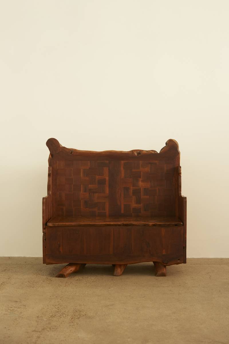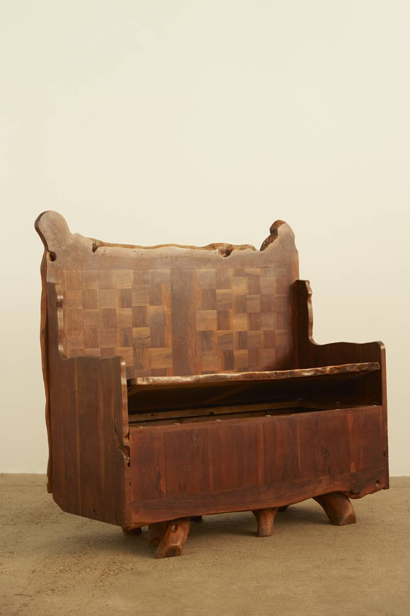 A very unique bench in olive wood with a handcrafted aesthetic, featuring a woven wood backrest, sculpted edges, and natural wood grain details. The sturdy design includes a storage compartment beneath the seat, making it both functional and decorative.