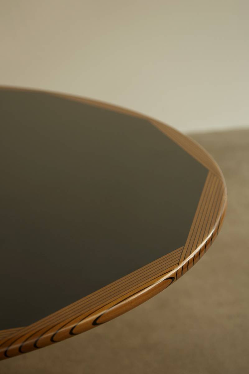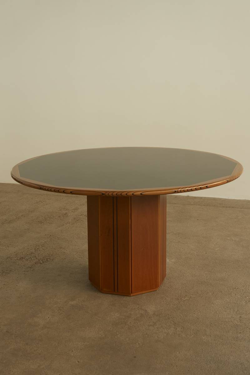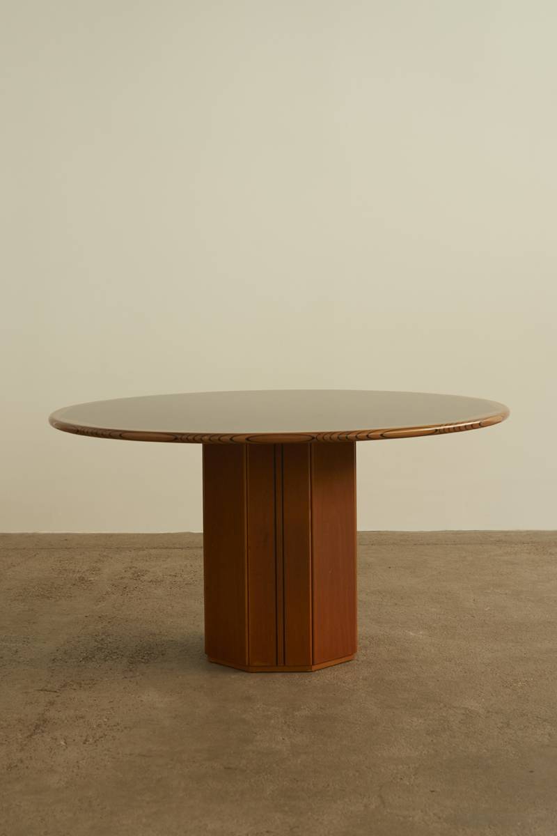 Artona dining table by Afra & Tobia Scarpa, crafted by Maxalto in Italy, 1975. Featuring a round walnut top with dark inlaid lines and a black finish, its graphic design is most striking along the edges. The table rests on a exagonal base, housing a concrete block for stability and easy transport. Afra & Tobia Scarpa, renowned architects and designers, have works in MoMA and the Louvre, earning accolades like the Compasso d’Oro.