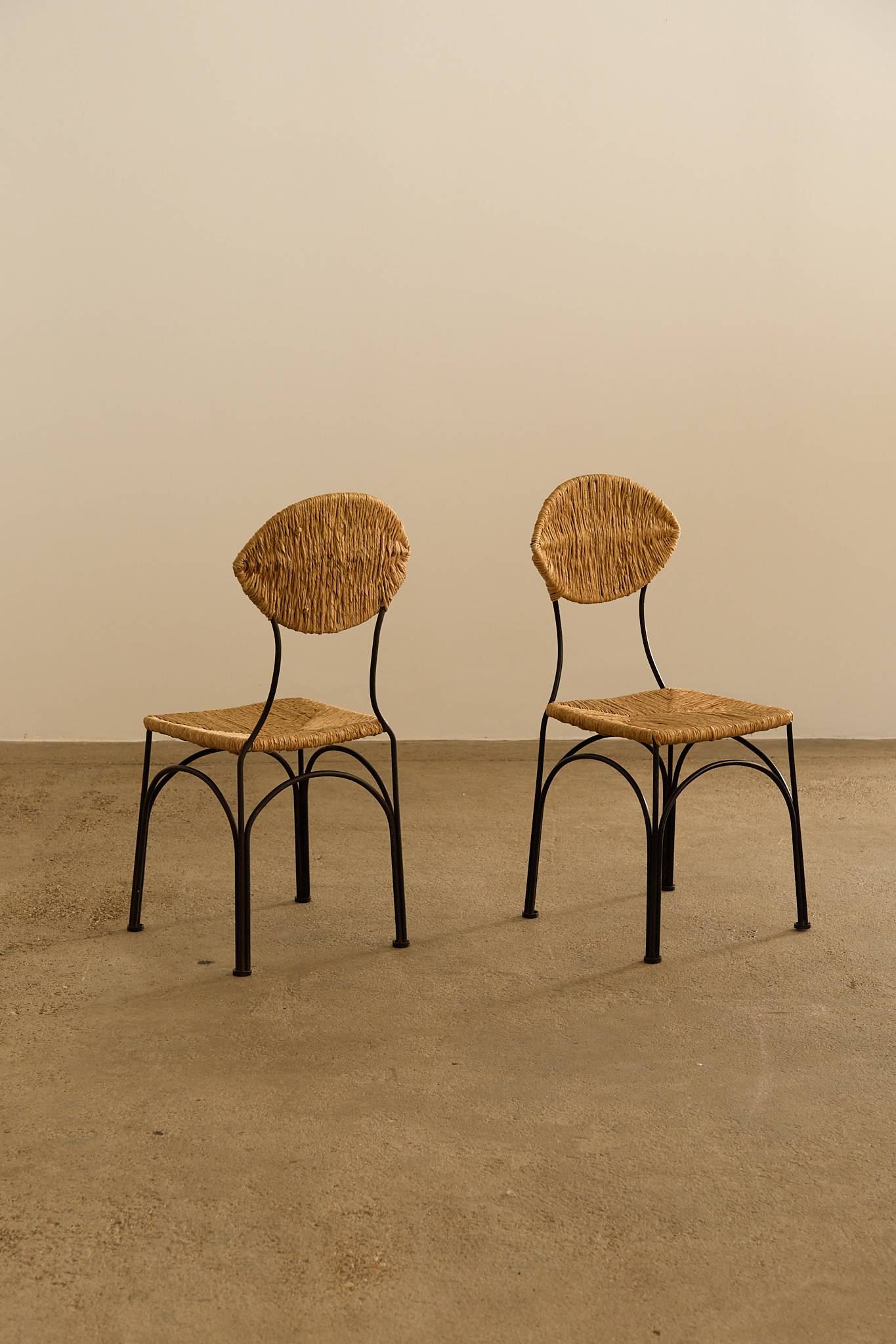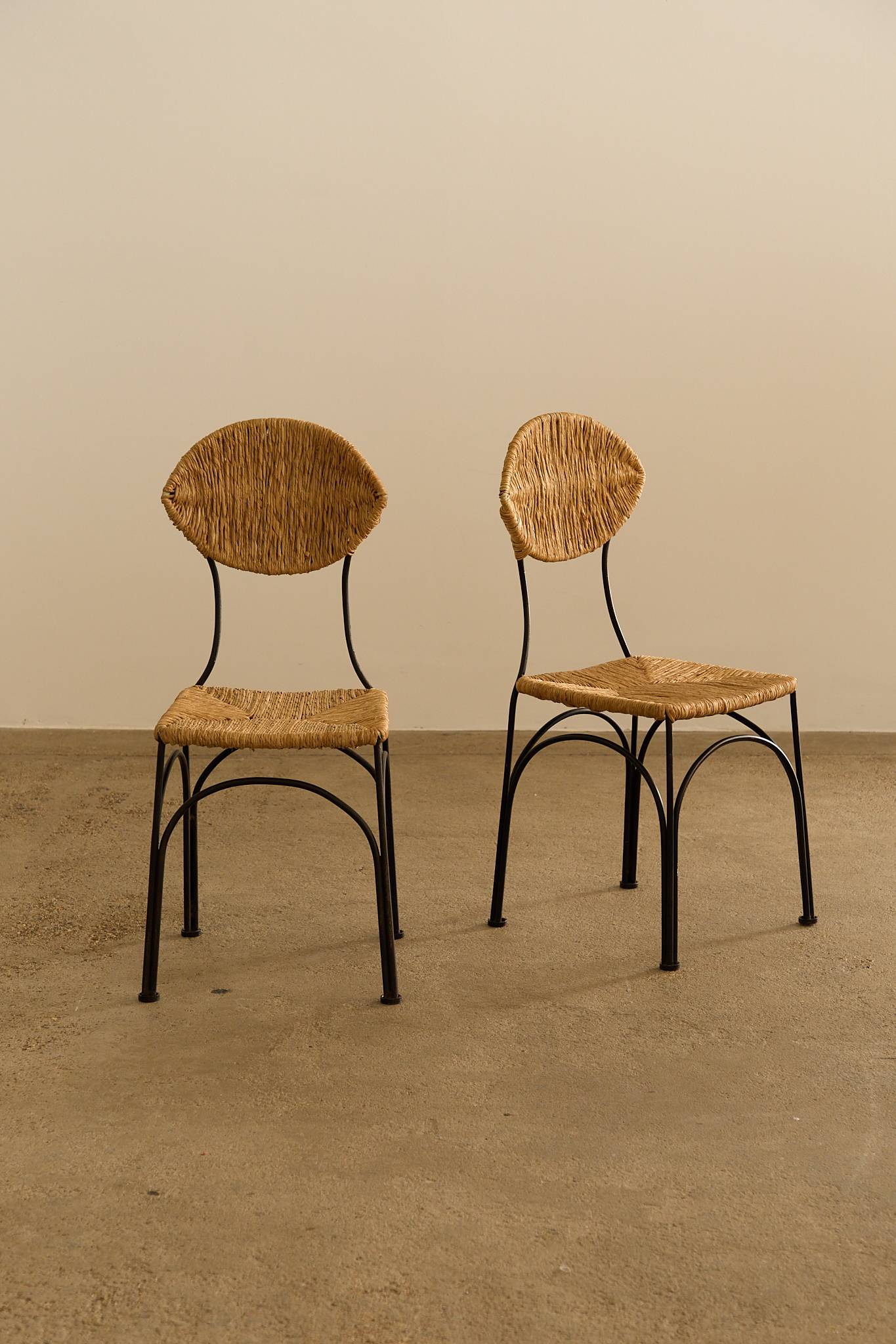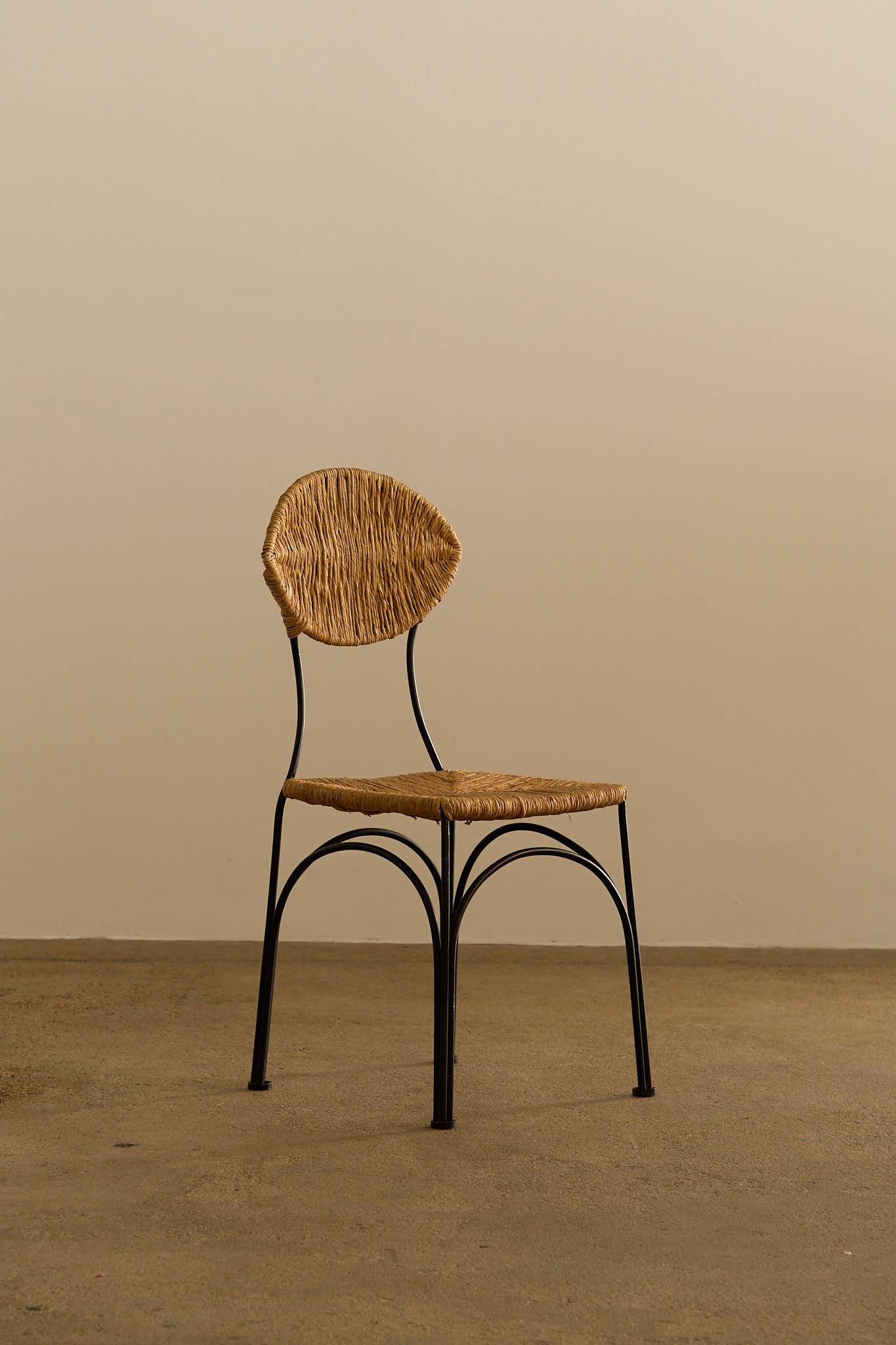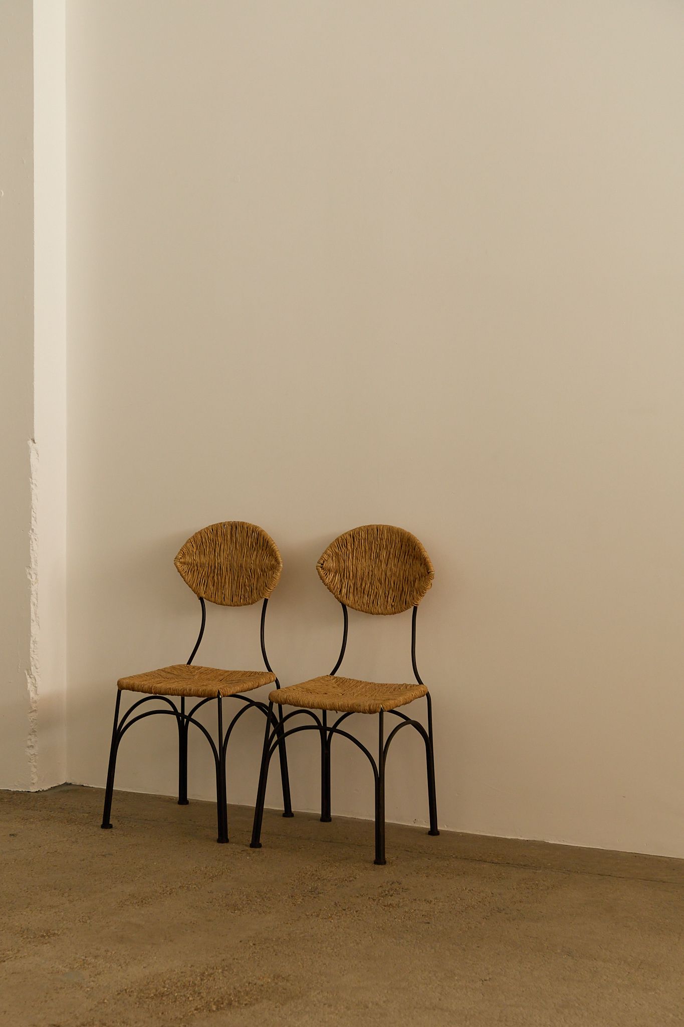Set of six ‘Banana’ chairs by Tom Dixon for Cappellini, Italy. Featuring a striking combination of painted metal frames with woven straw seats and backs, these chairs embody Dixon’s raw, industrial aesthetic with a nod to traditional craftsmanship. Priced for the set of 6.