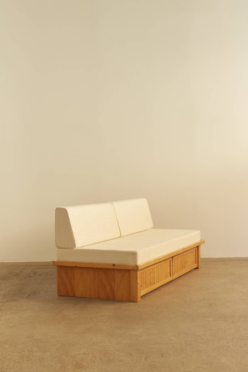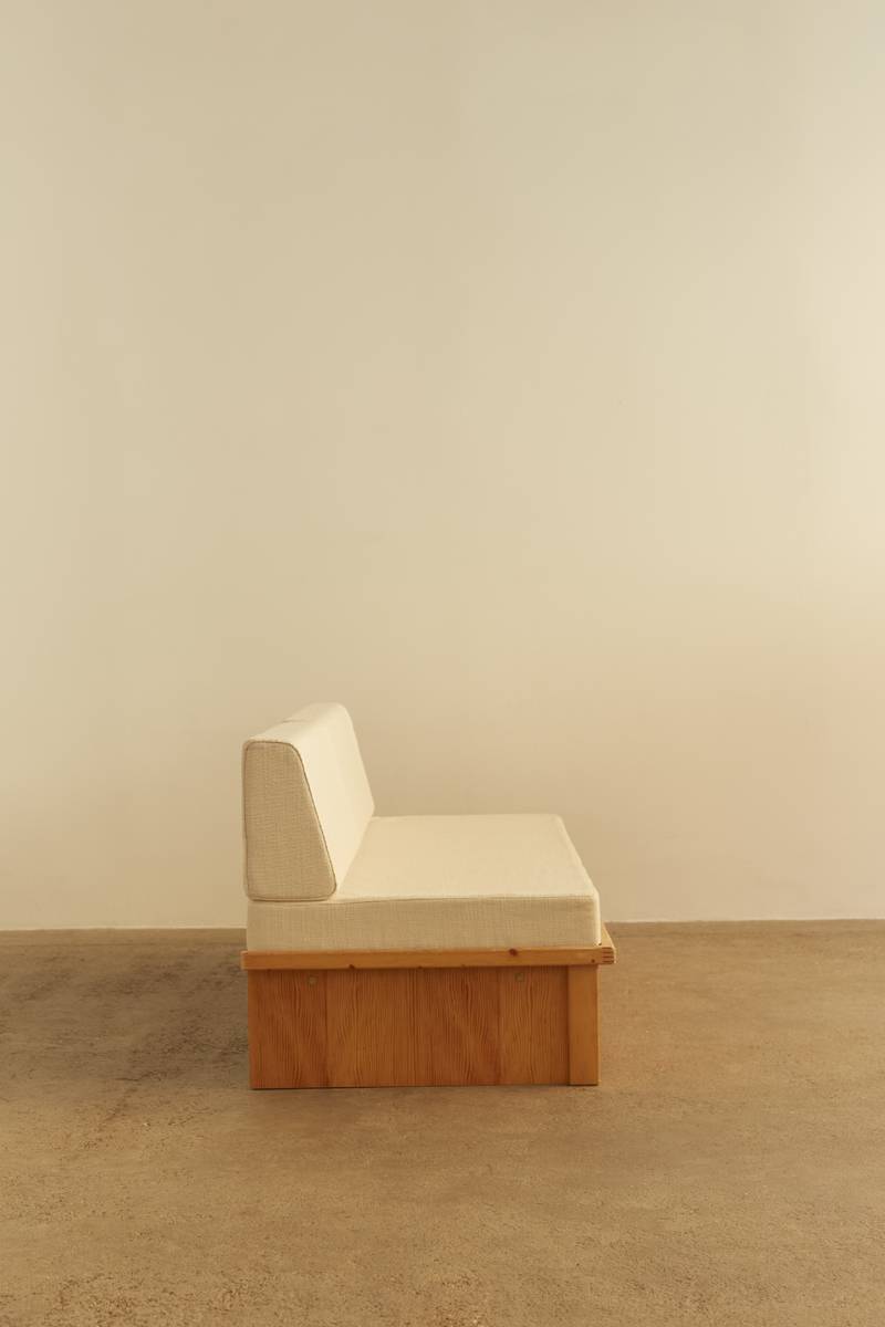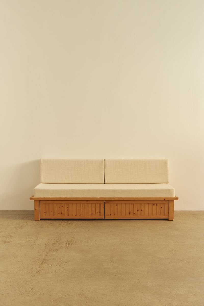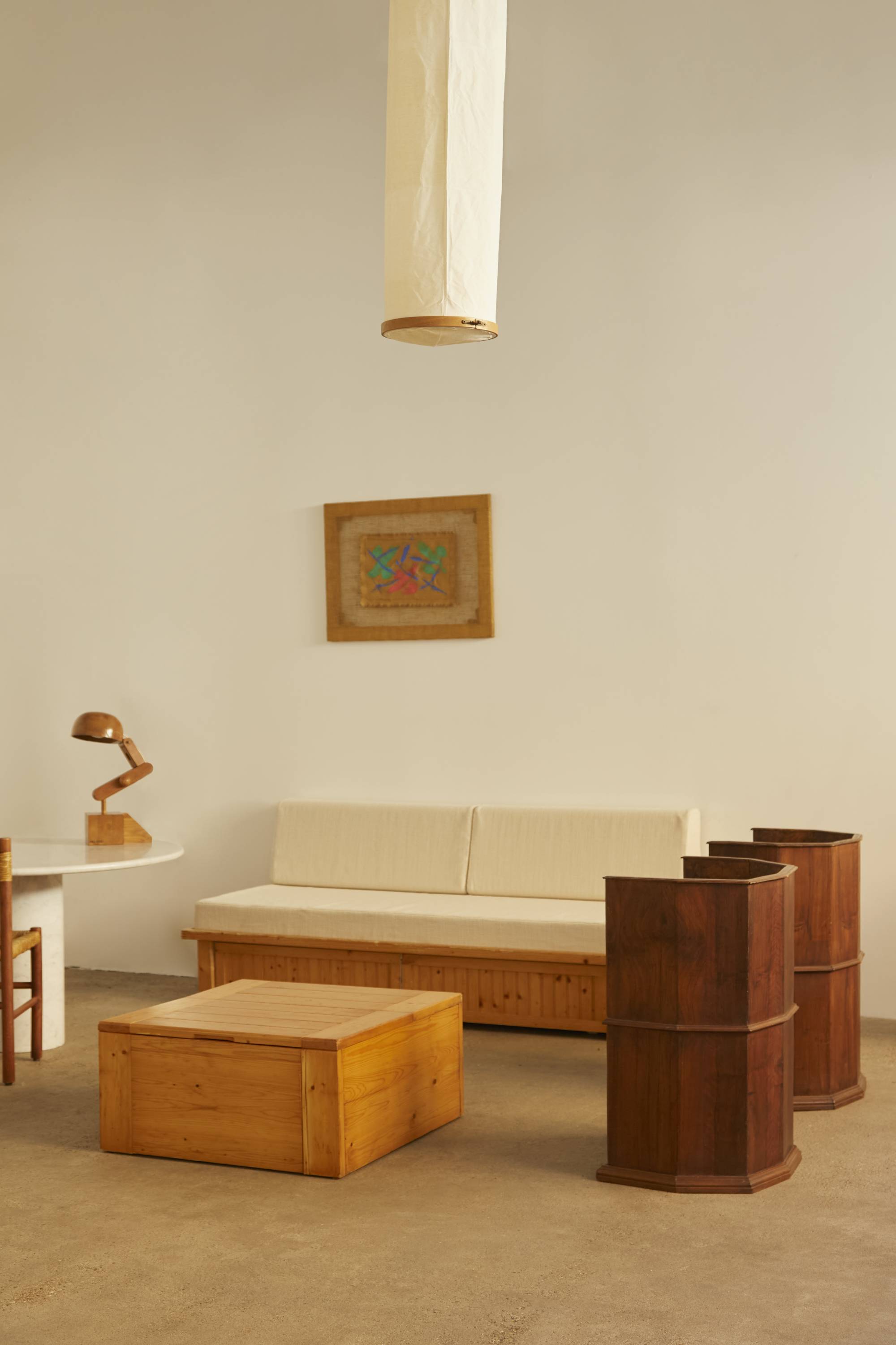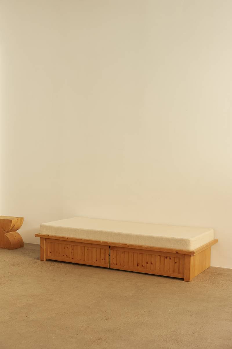 Originally part of the iconic Résidence Nova in Les Arcs, designed by Charlotte Perriand, this sofa bed features a pine slat structure with discreet rolling drawers hidden behind a drop-down front. The seat mattress and foam cushions are upholstered in luxurious Mont-Blanc wool by Nobilis, adding to its refined, timeless appeal.