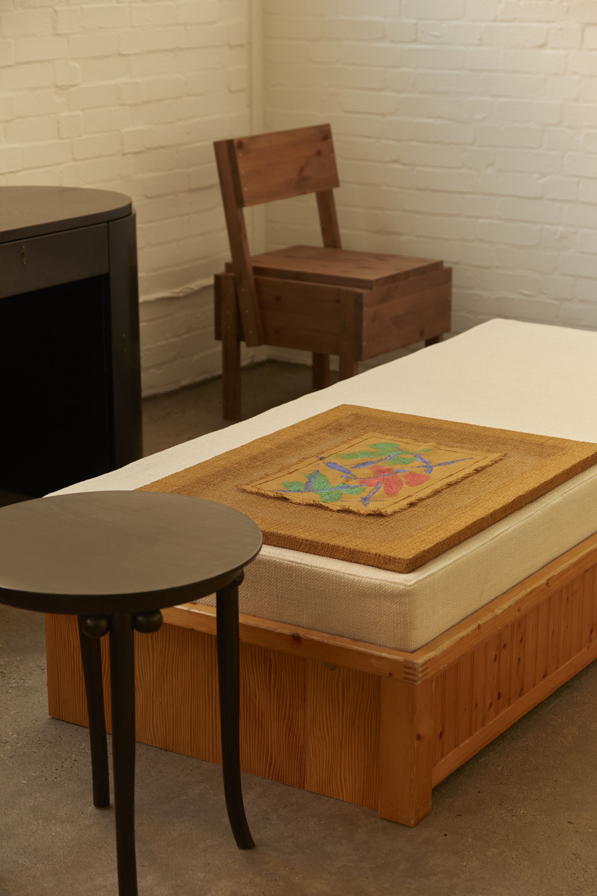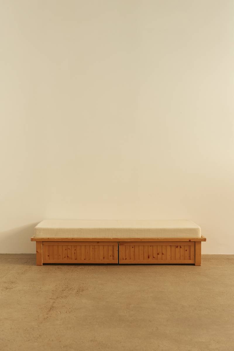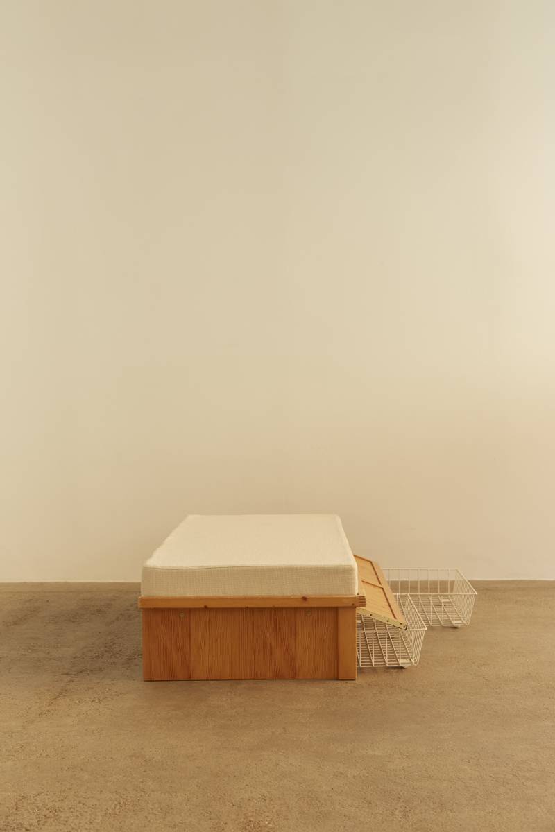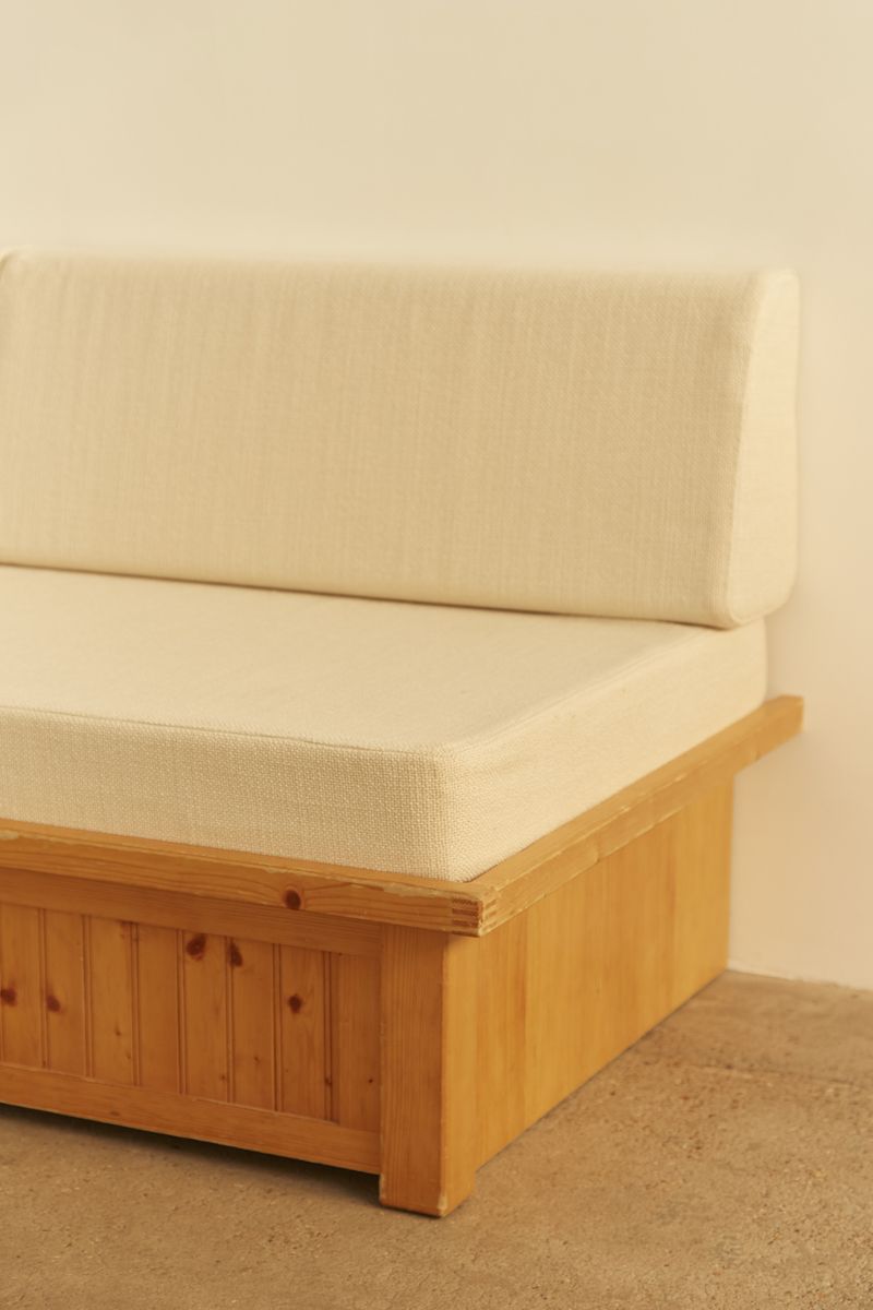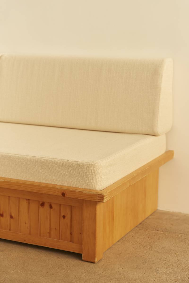 Originally part of the iconic Résidence Nova in Les Arcs, designed by Charlotte Perriand, this sofa bed features a pine slat structure with discreet rolling drawers hidden behind a drop-down front. The seat mattress and foam cushions are upholstered in luxurious Mont-Blanc wool by Nobilis, adding to its refined, timeless appeal.