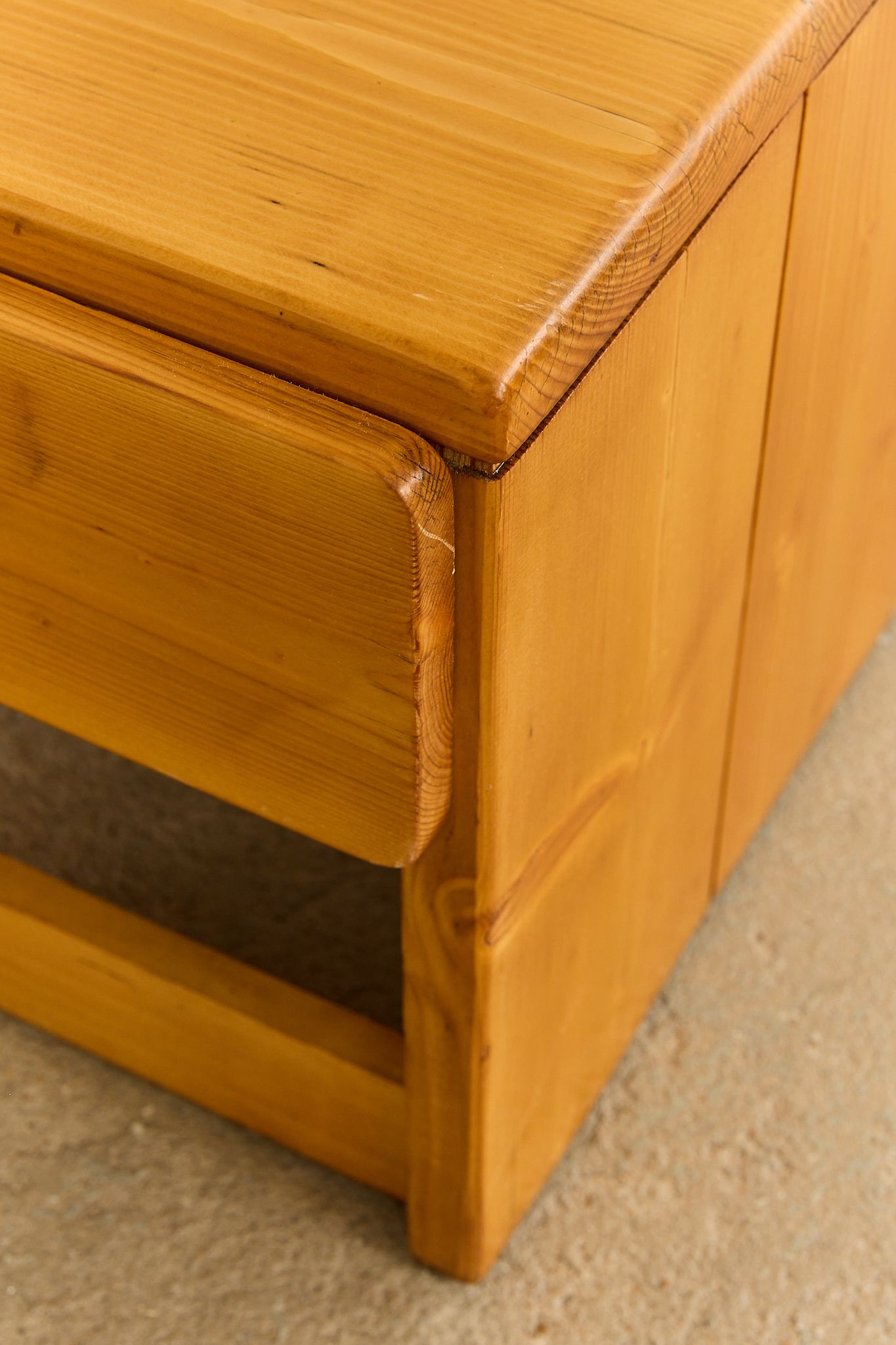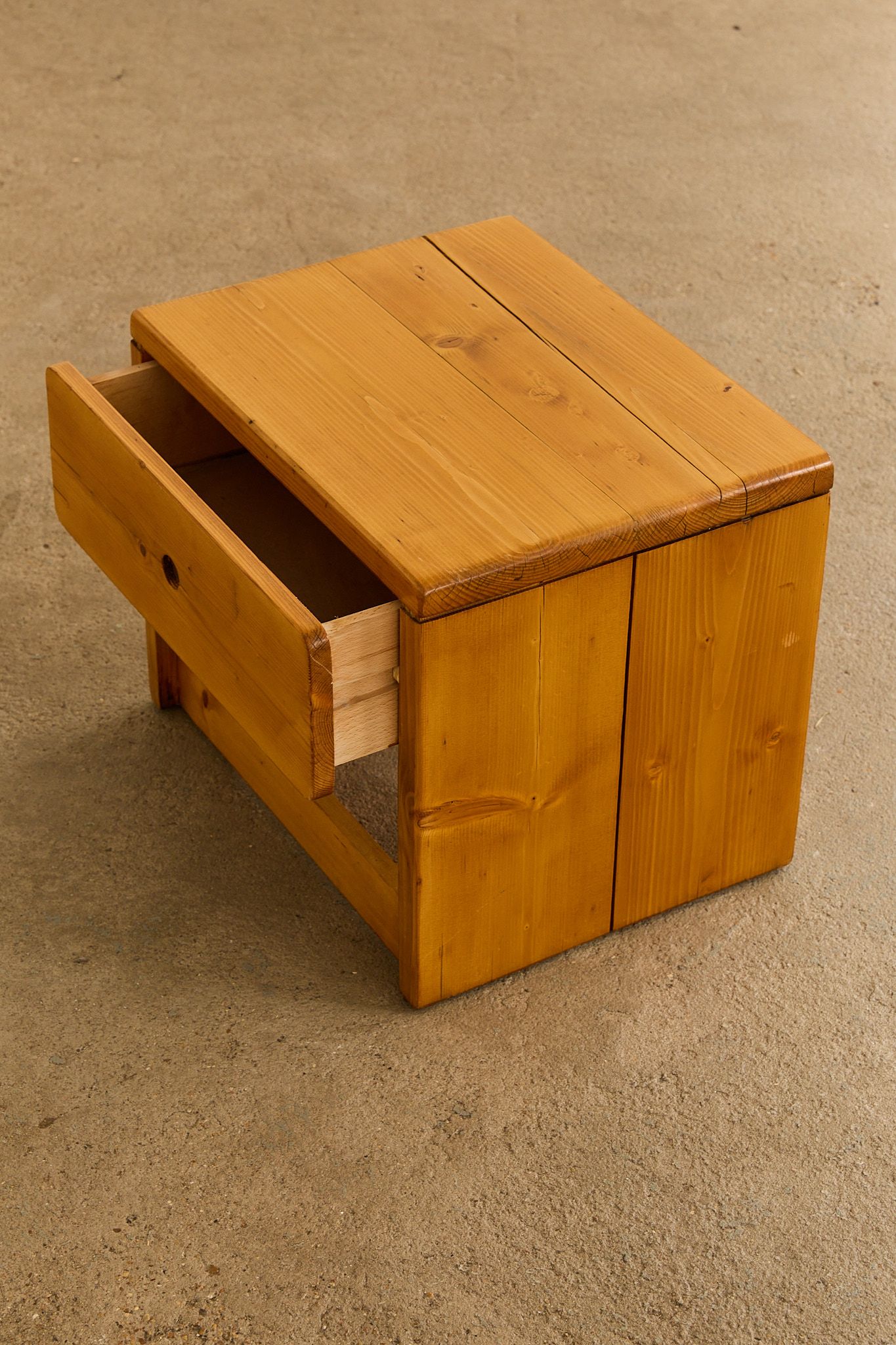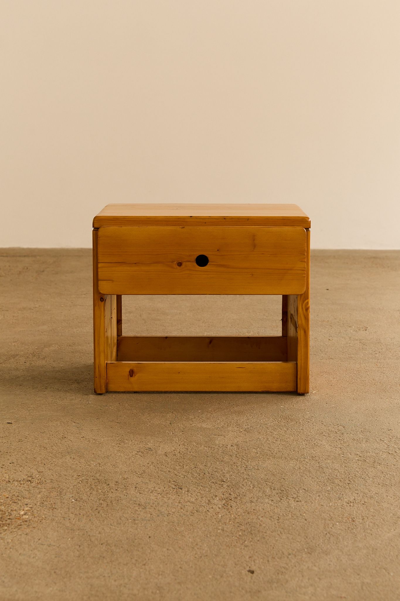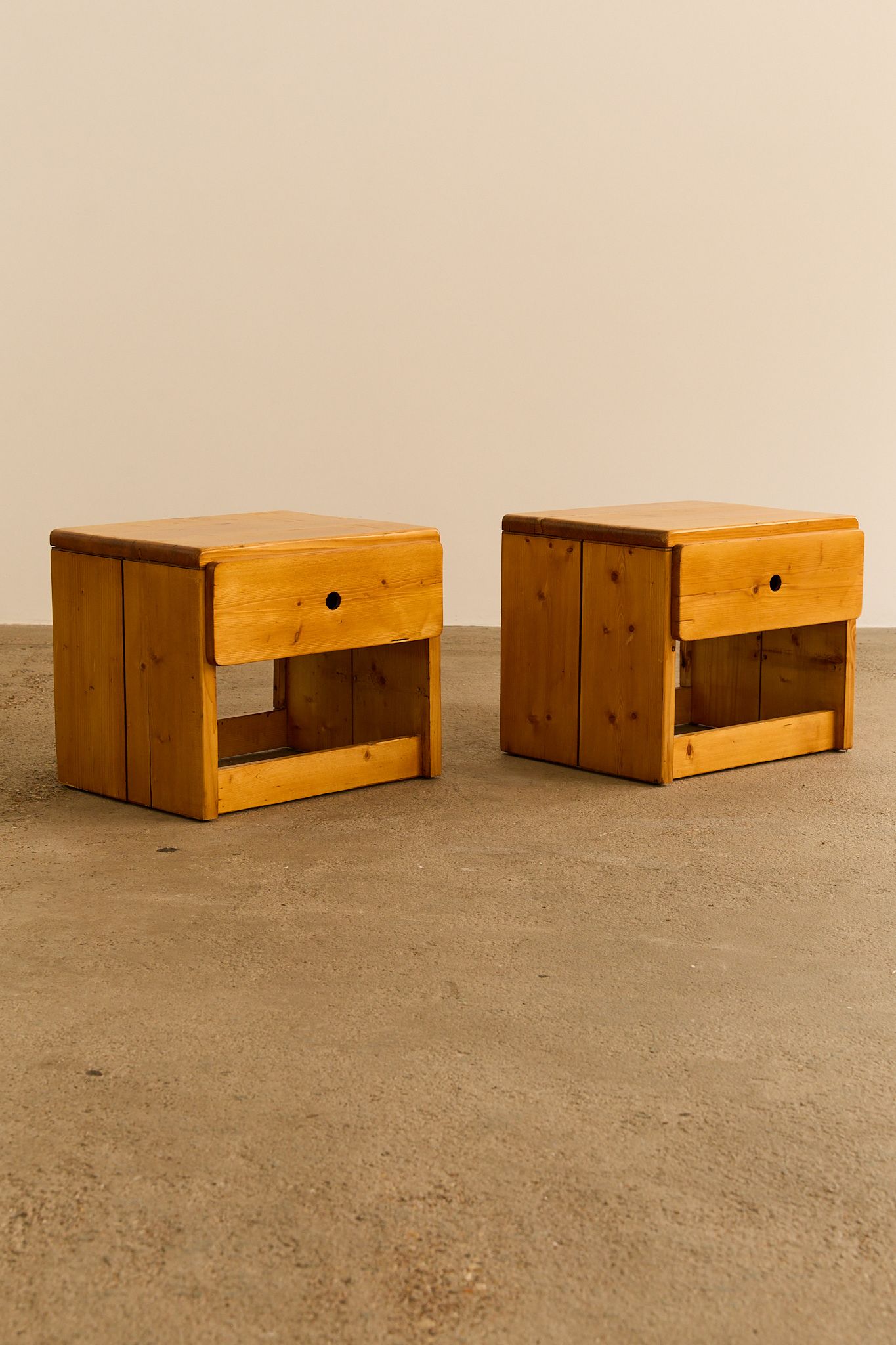 A pair of bedside tables with one drawer with circular pull handle, selected by Charlotte Perriand to furnish the Arcs 1800 apartments, a real estate project to which she devoted nearly 20 years of her life. Price is for the pair.