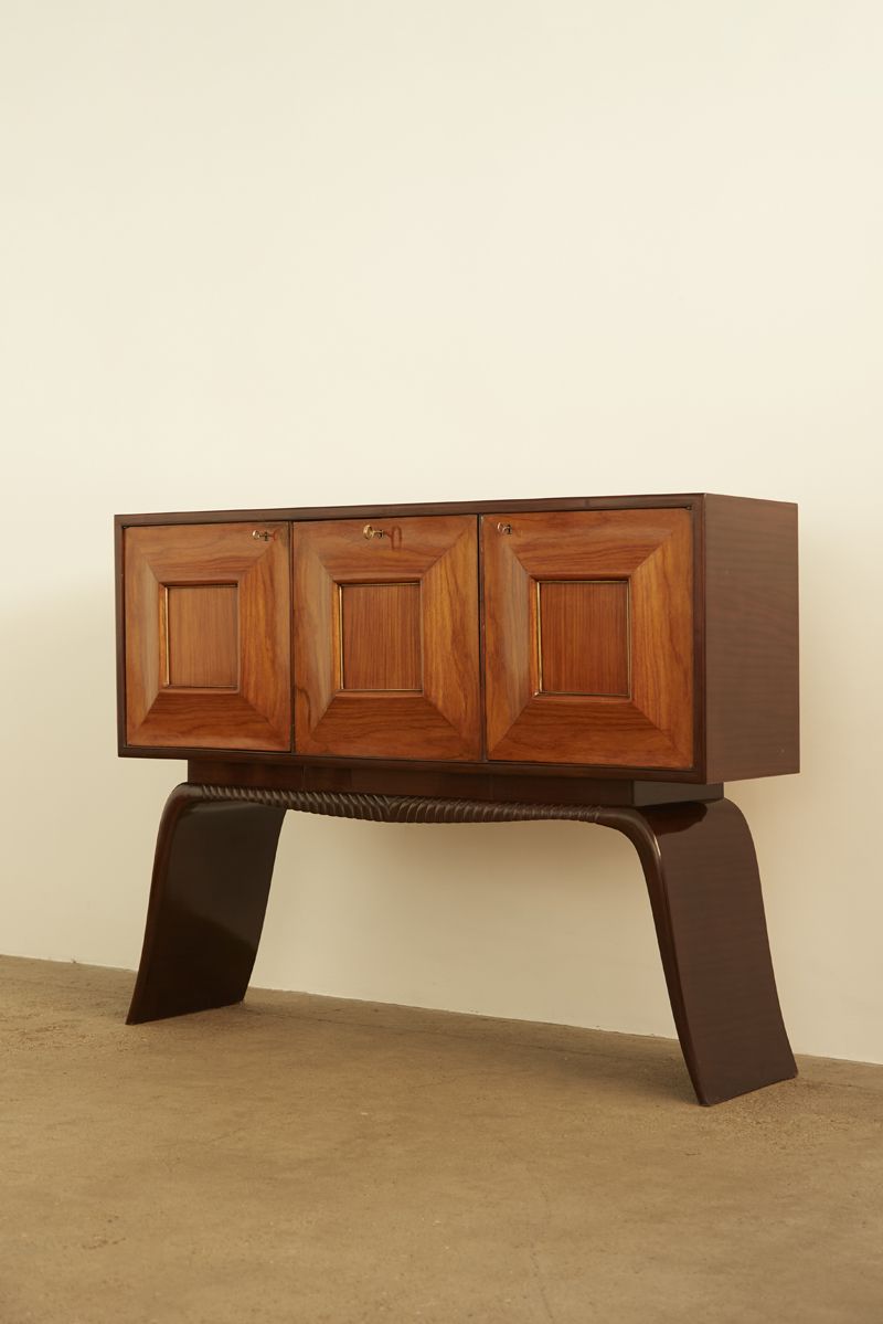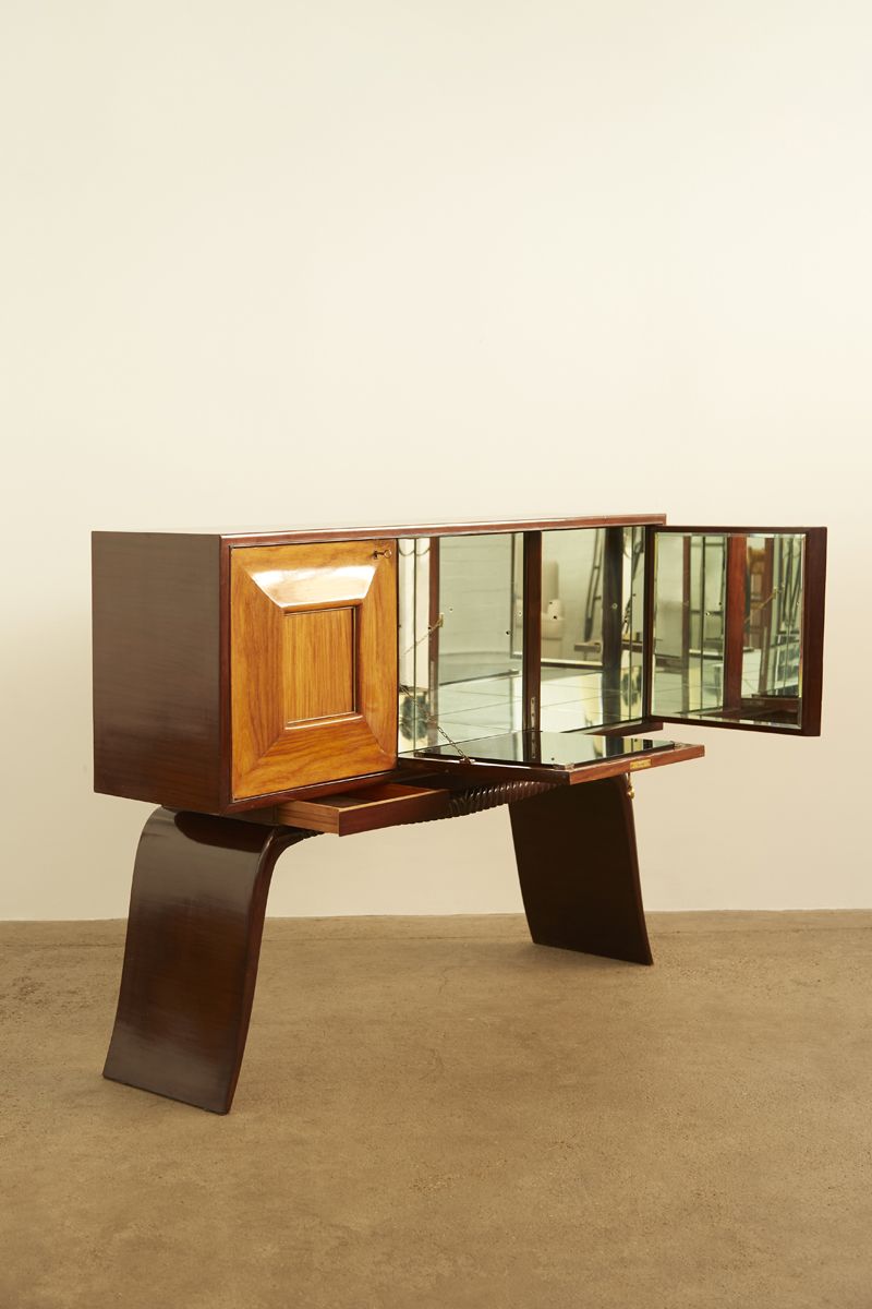 A sophisticated bar cabinet with a sculptural base and paneled wood doors. The mirrored interior, complete with a glass drop-down serving surface, enhances its elegance and functionality.