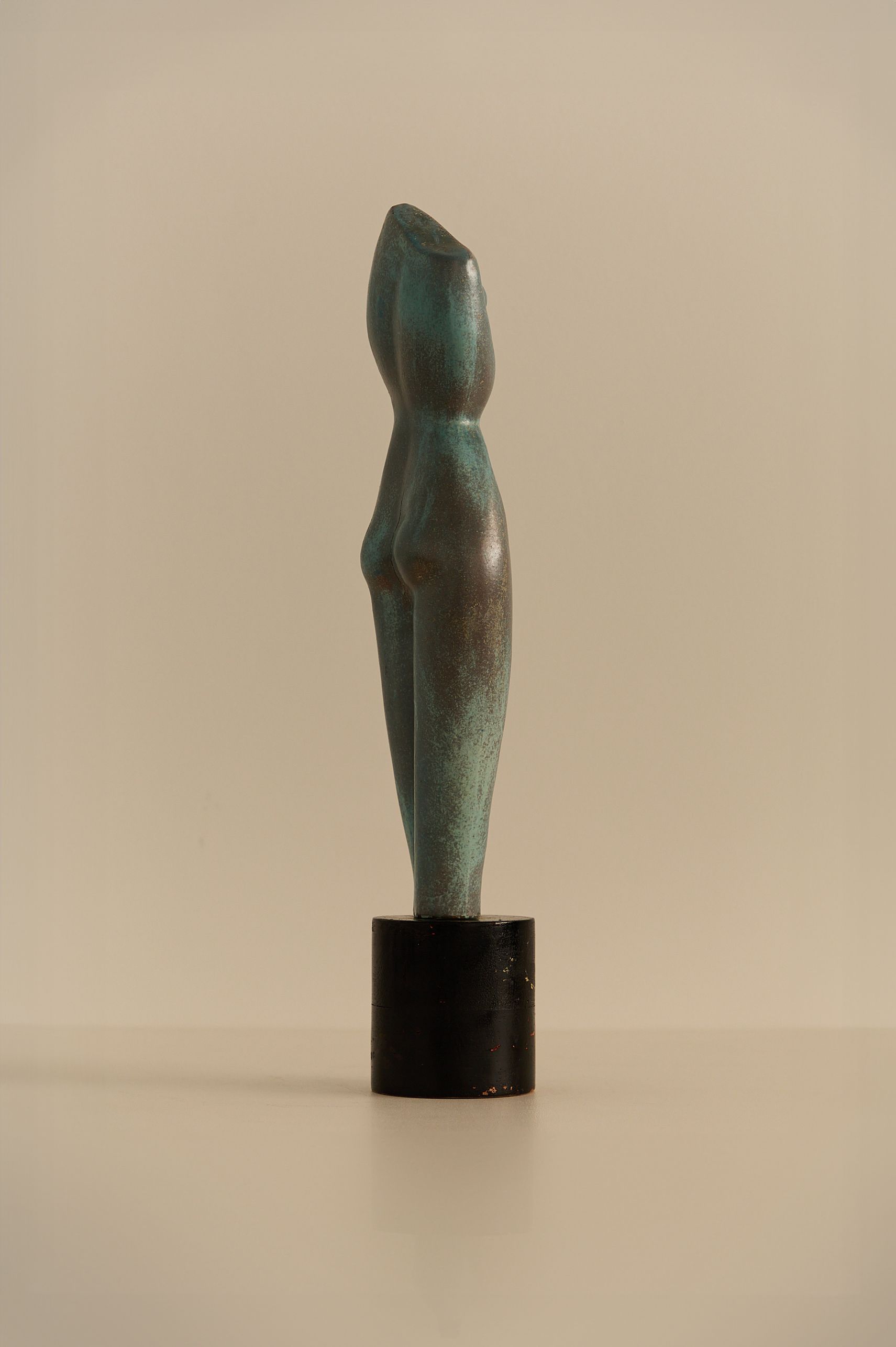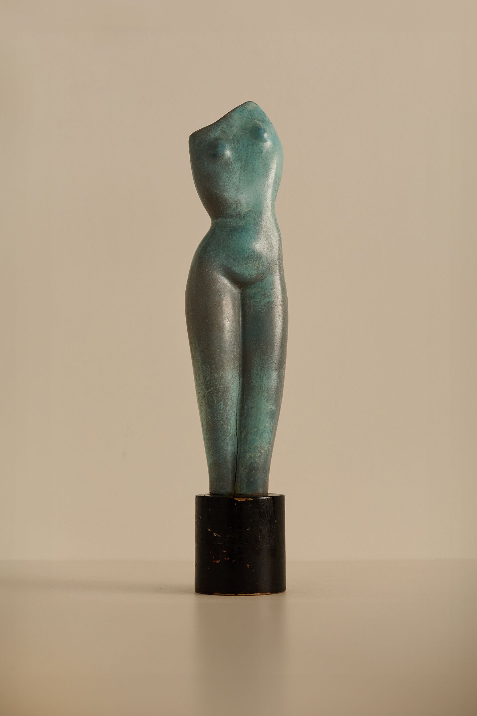 A minimalist ceramic sculpture of a female torso with flowing, abstracted curves and a mottled turquoise glaze; mounted on a black wooden base.