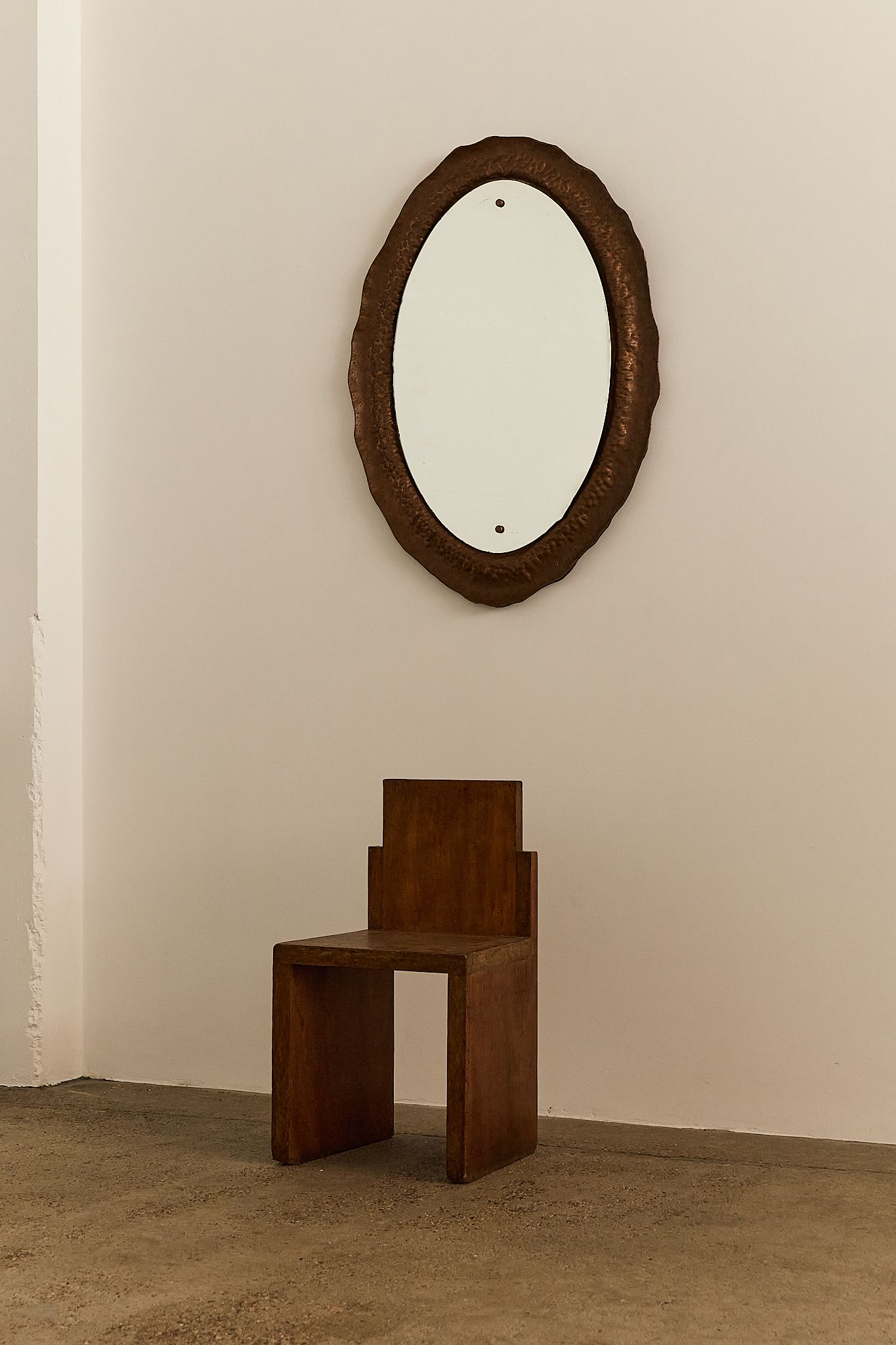 A distinctive oval wall mirror crafted in the 1960s. The hammered copper frame features an organic, undulating edge with richly textured detailing that beautifully catches the light.