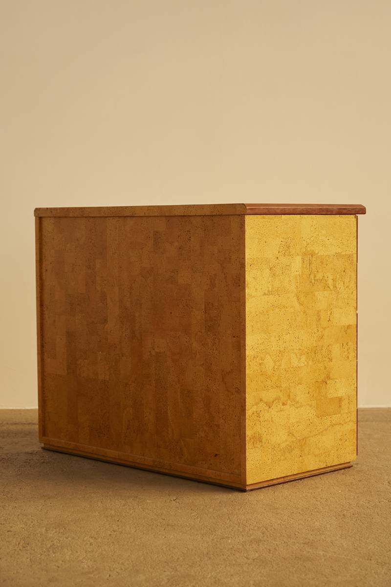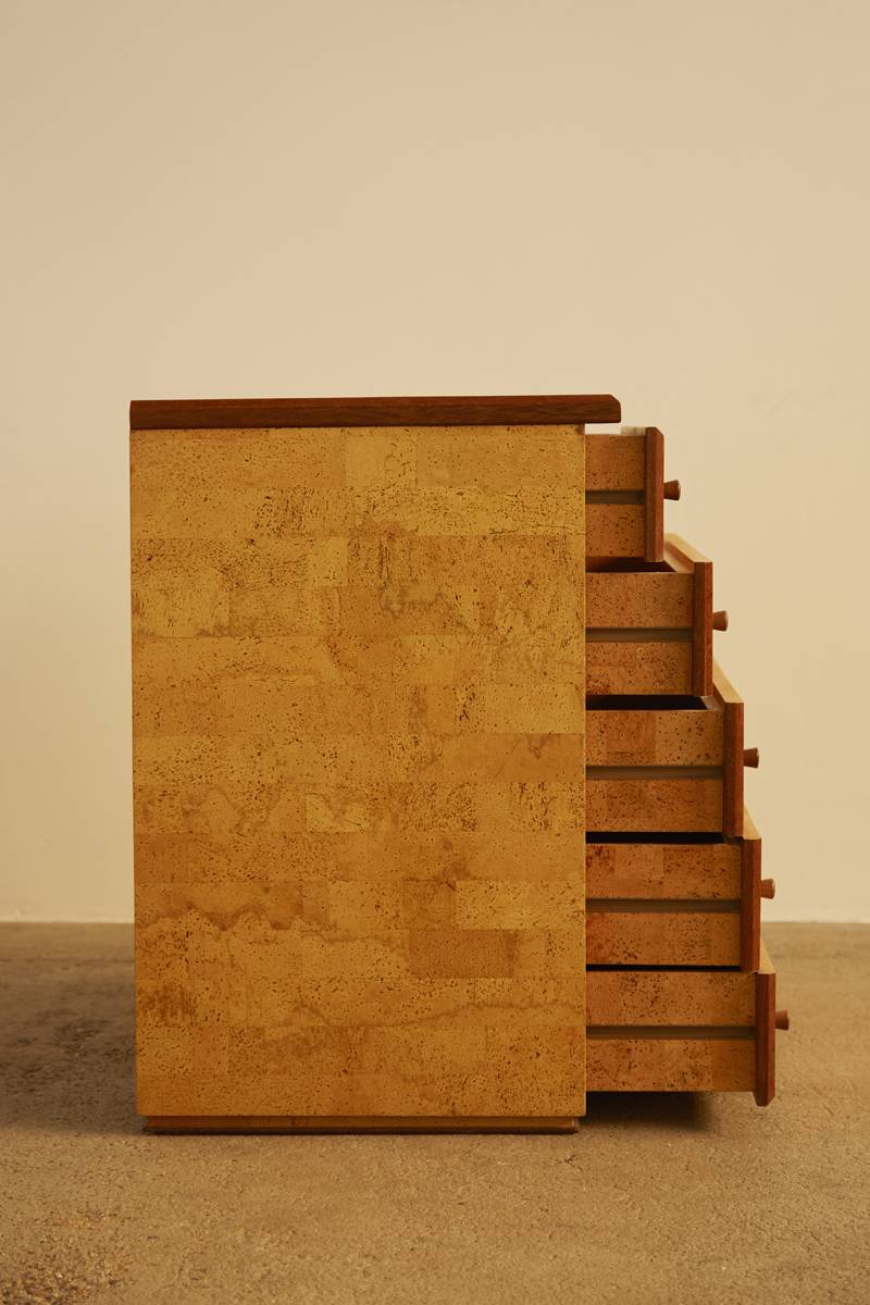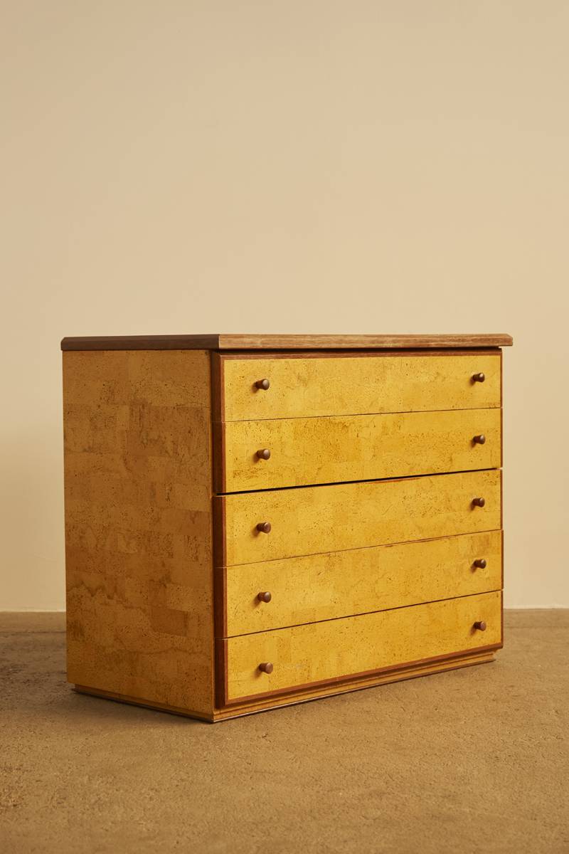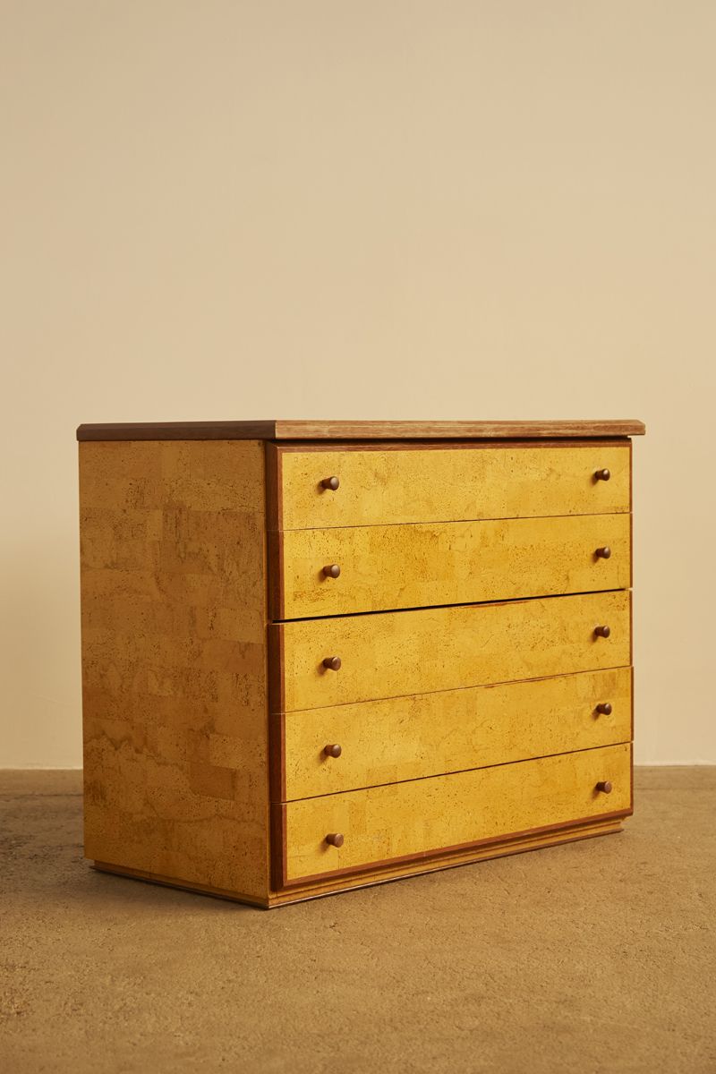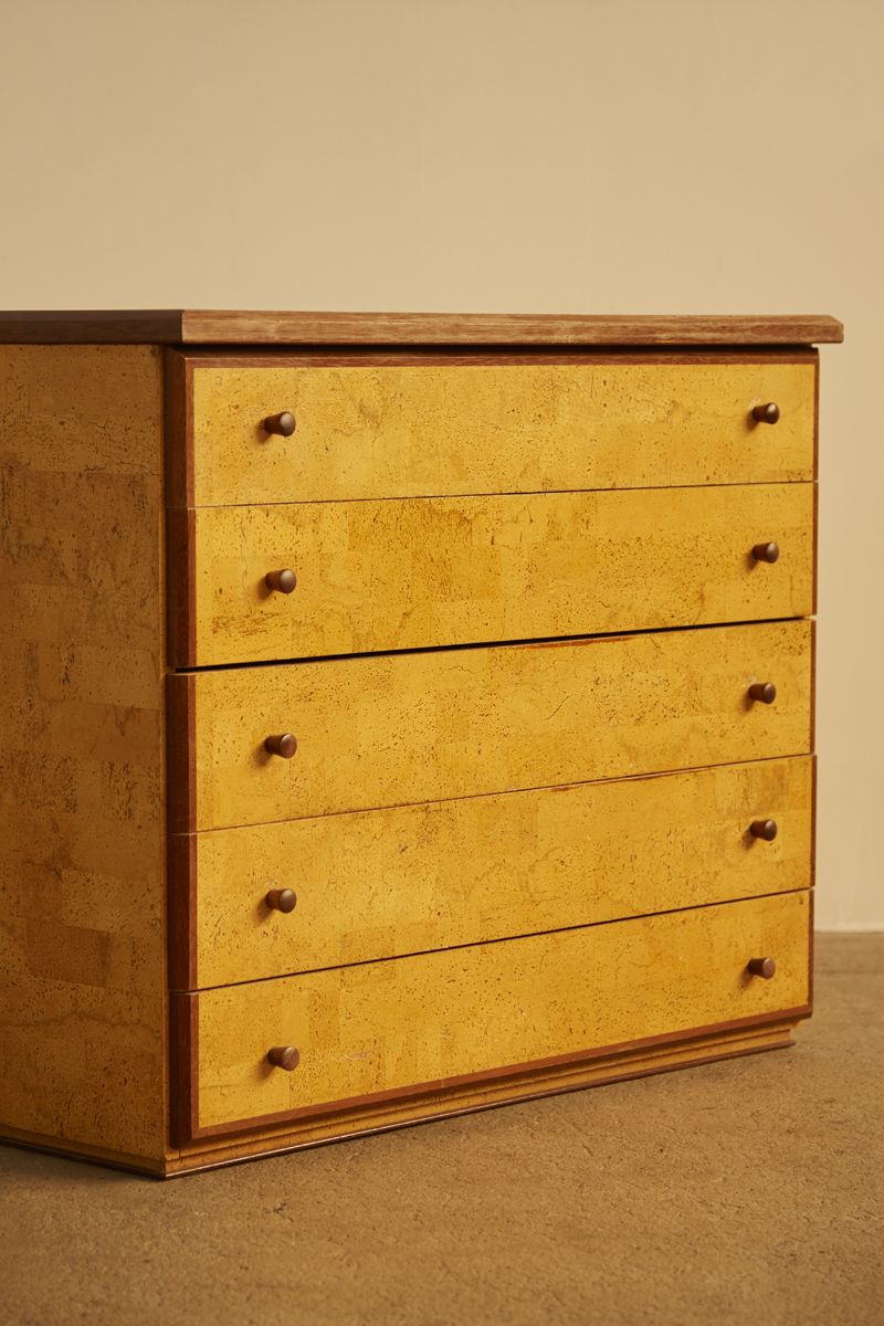 A unique Italian cork chest of drawers from the 1970s. Crafted with a cork exterior and a sturdy wooden structure, it features simple yet stylish wooden knobs. A distinctive and effortlessly cool statement piece.