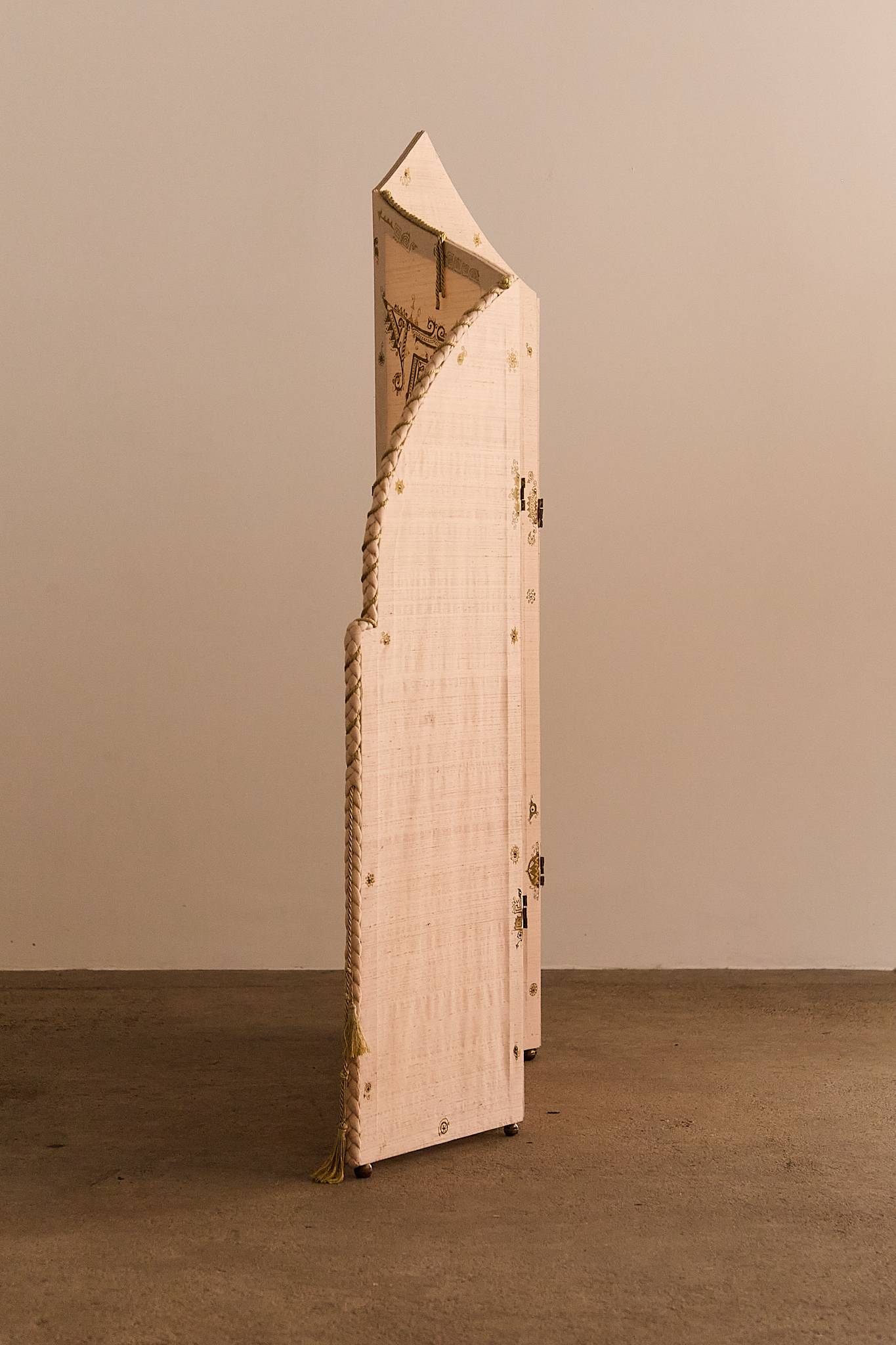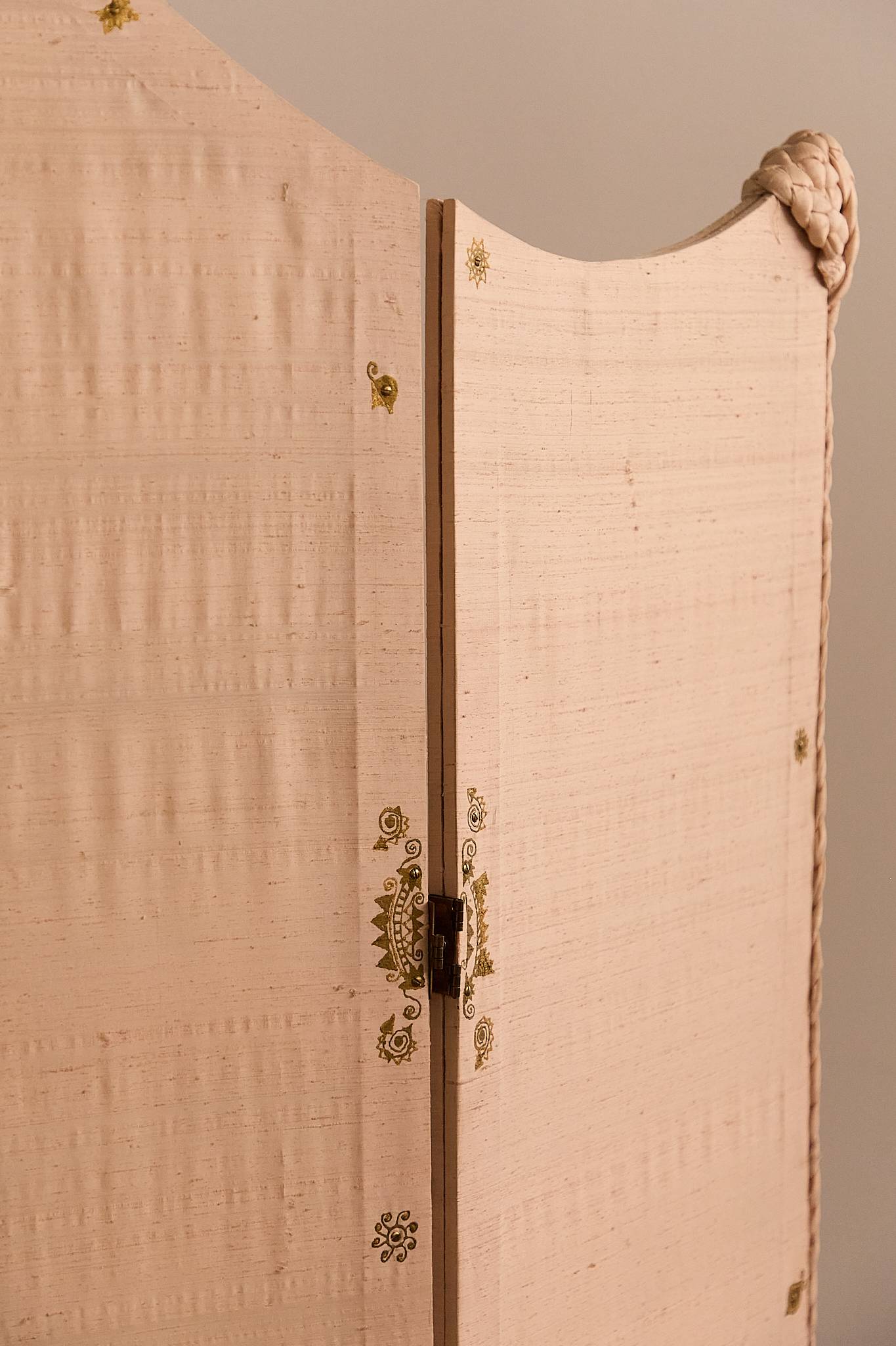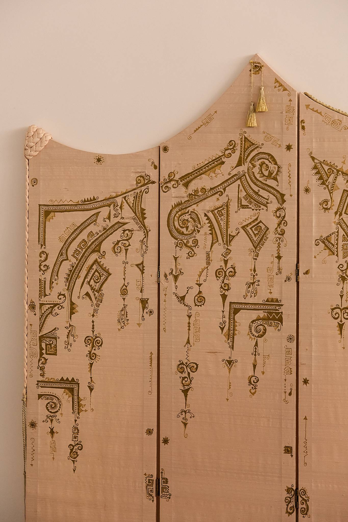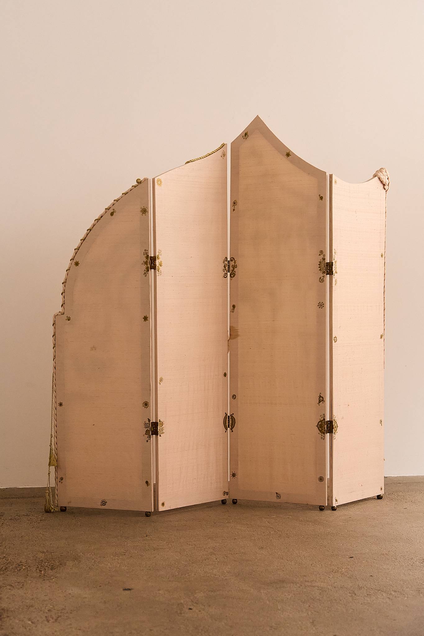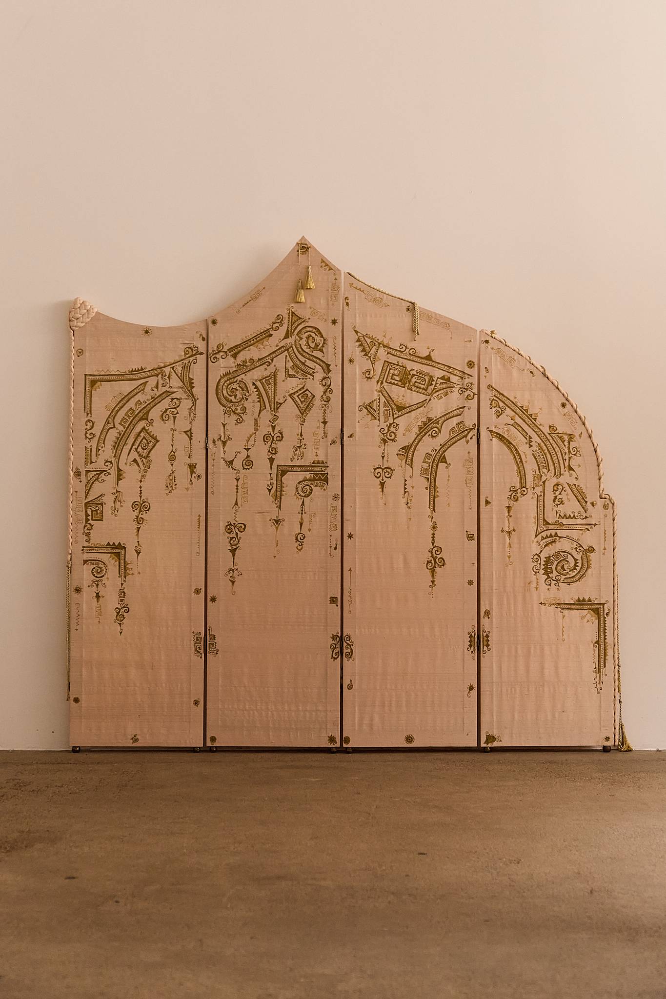 An ornate folding screen crafted with a wooden structure, adorned with silk panels featuring gold-painted designs and intricate trimmings. The silhouette includes an arched upper panel and a knotted fabric accent, lending a theatrical, almost operatic character to the piece.