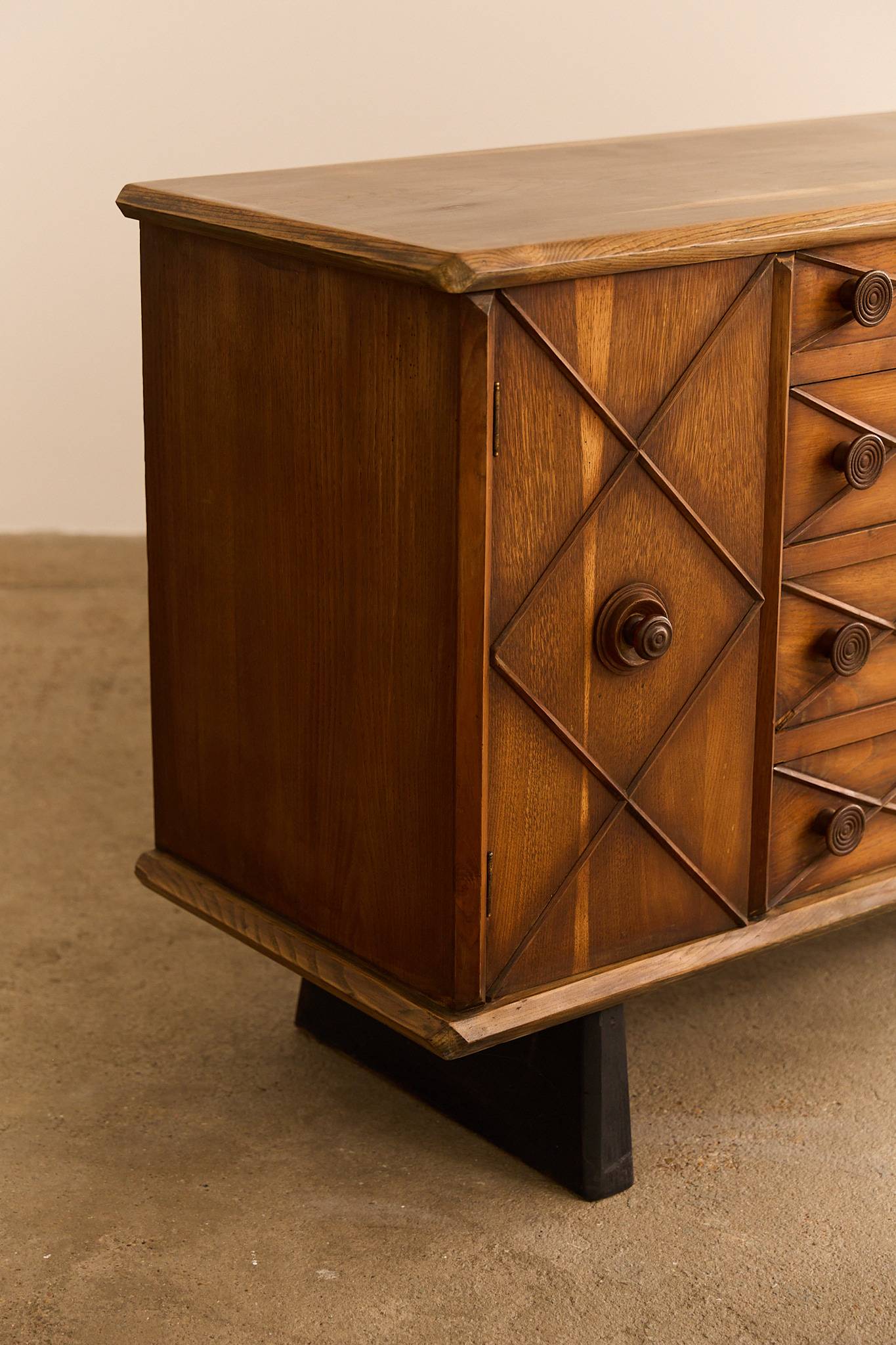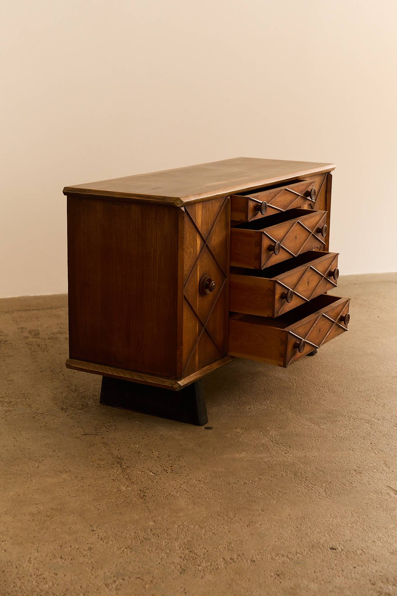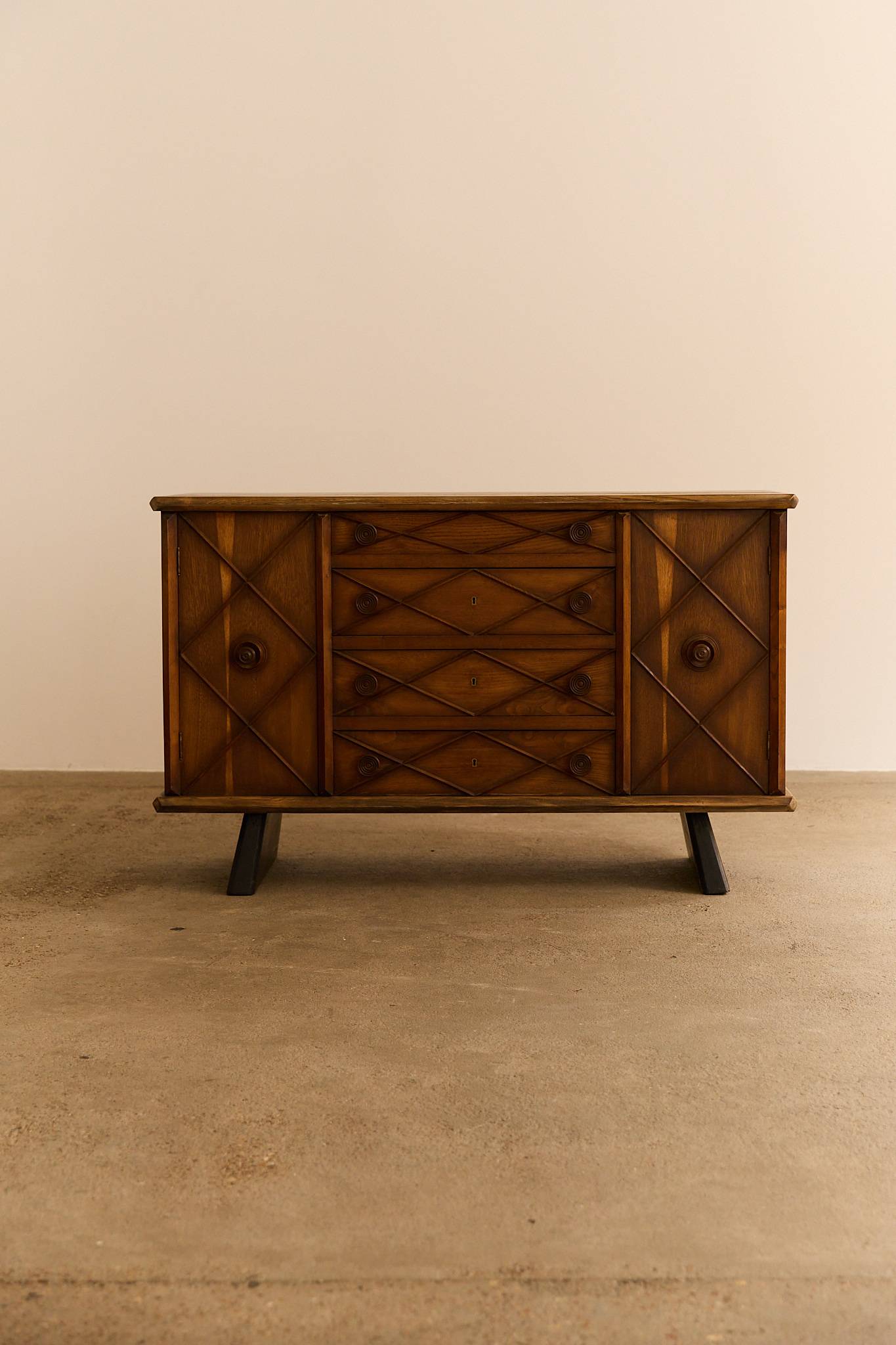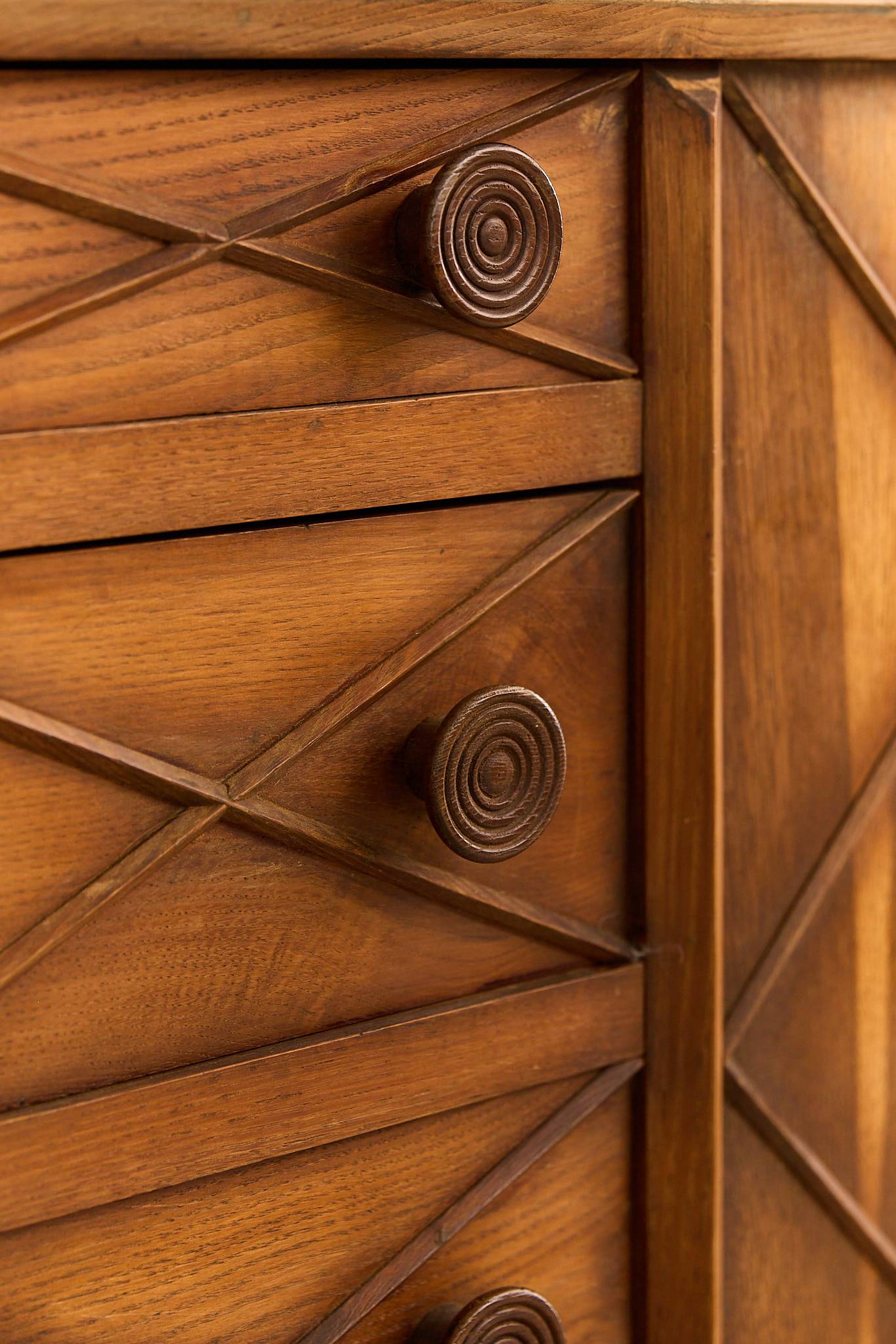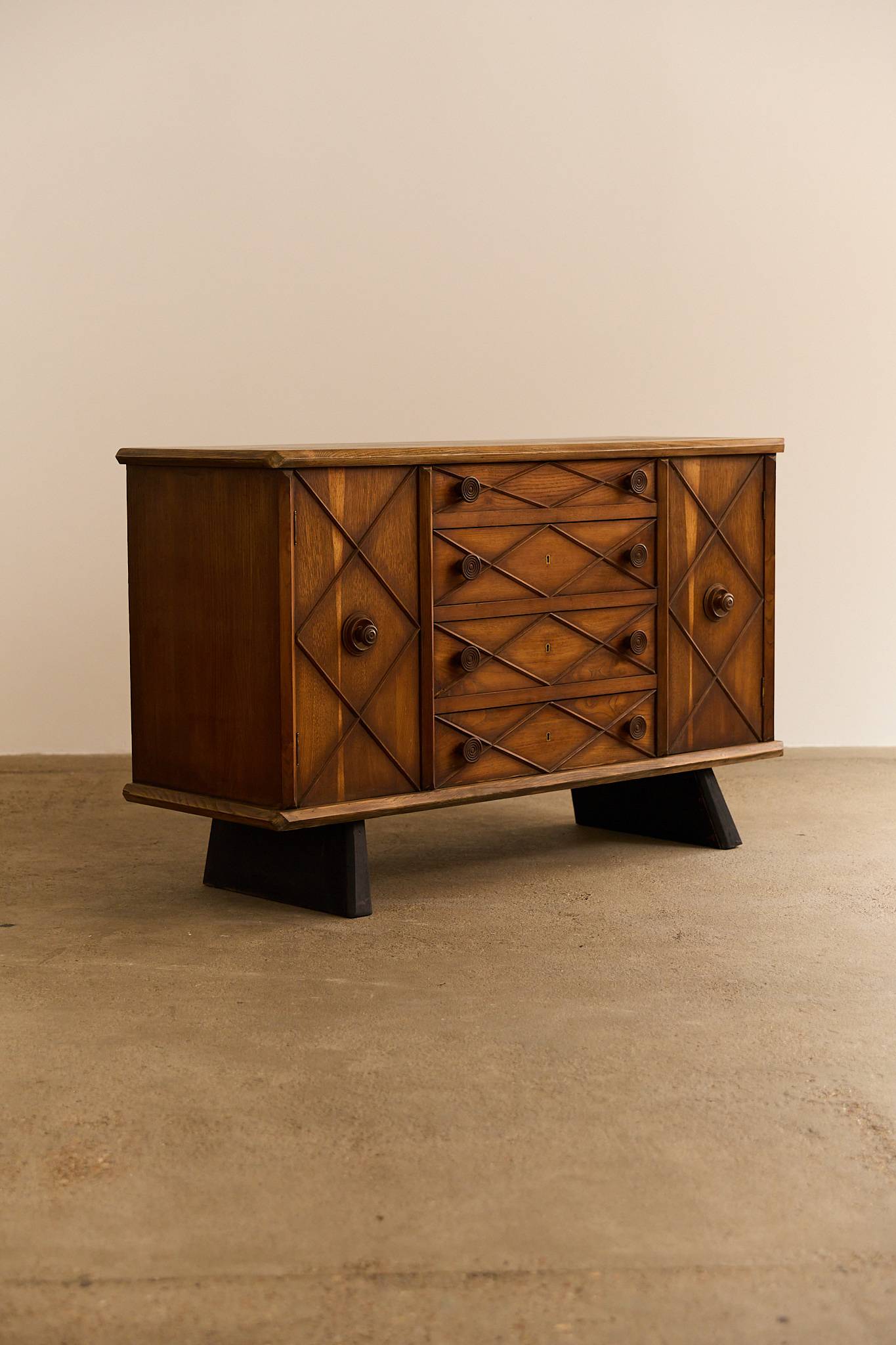 Elegant dresser / schest of drawers crafted from with ebonized wood accents and buxus details. This refined piece reflects the sophisticated Italian craftsmanship of the 1940s, combining clean lines with subtle decorative contrast. Gianni Vigorelli (1916–1998) was an Italian sculptor and furniture designer known for his elegant, sculptural pieces that embody the essence of Italian design of the 40-50’s.