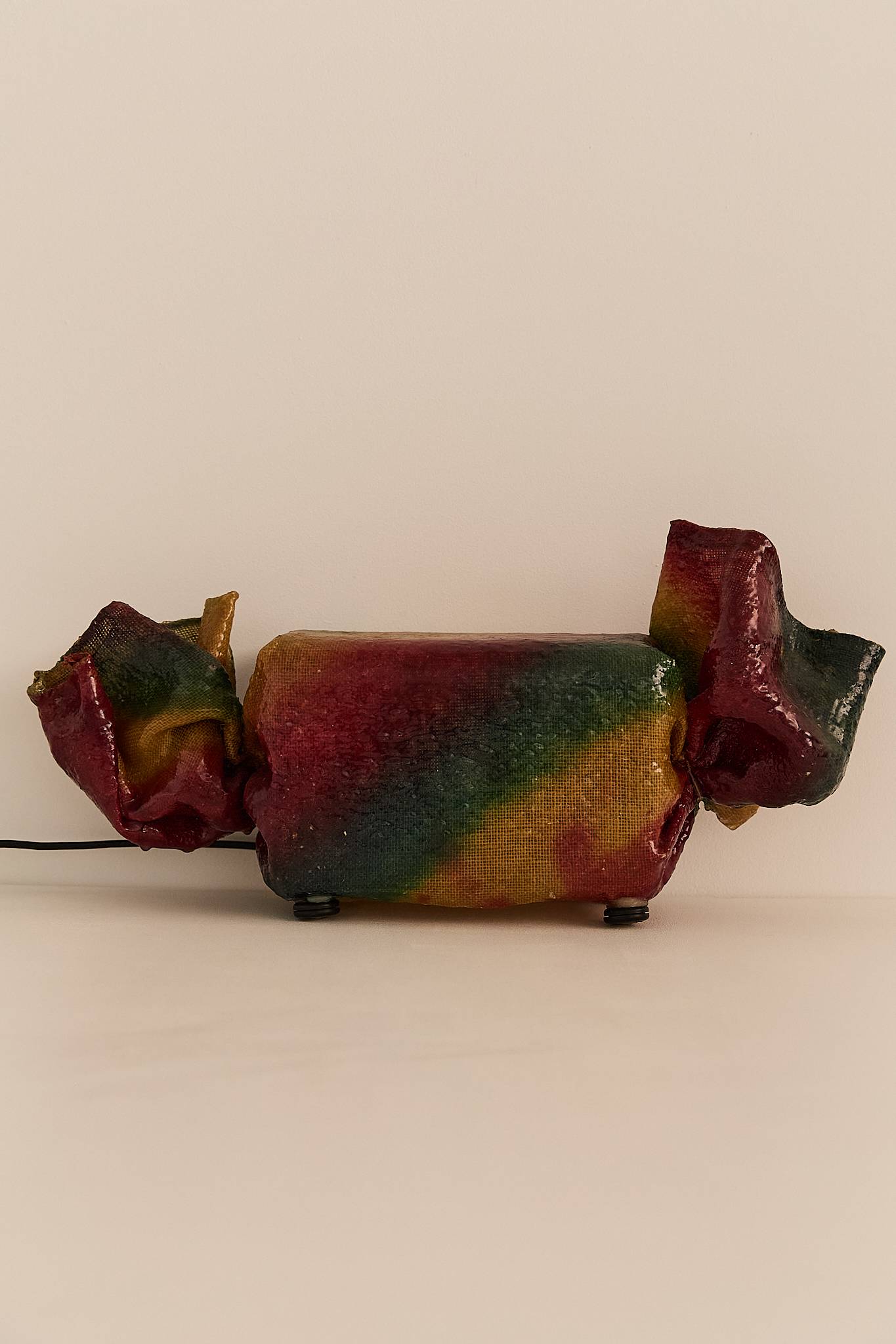A rare and playful sculptural table lamp by French artist Lionel Scornec, designed circa 1975. Titled “Candy”, the piece takes the form of a wrapped sweet, crafted in richly colored, translucent resin and fiberglass.