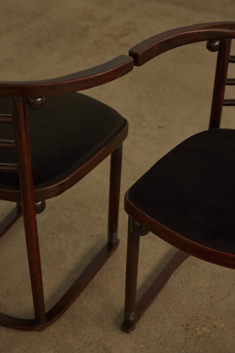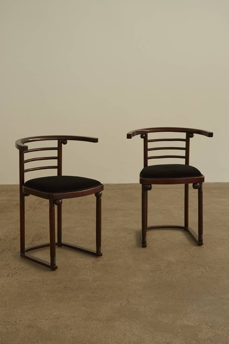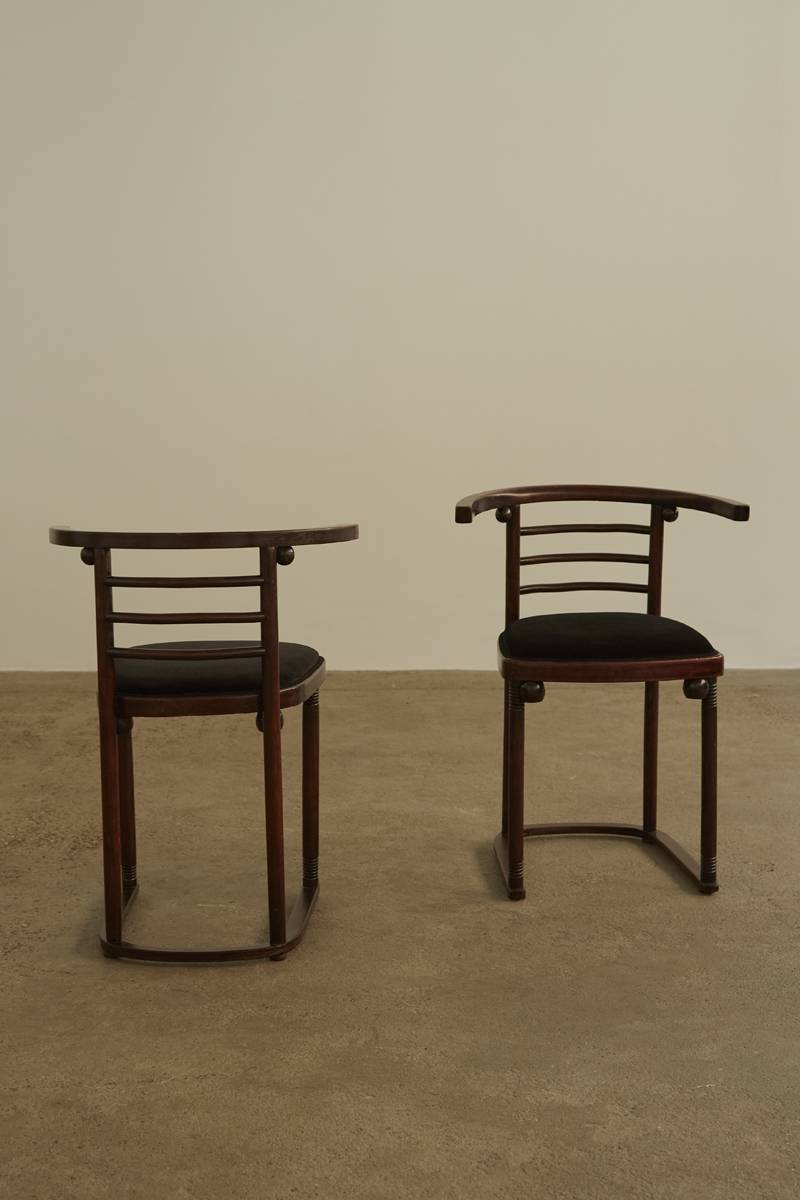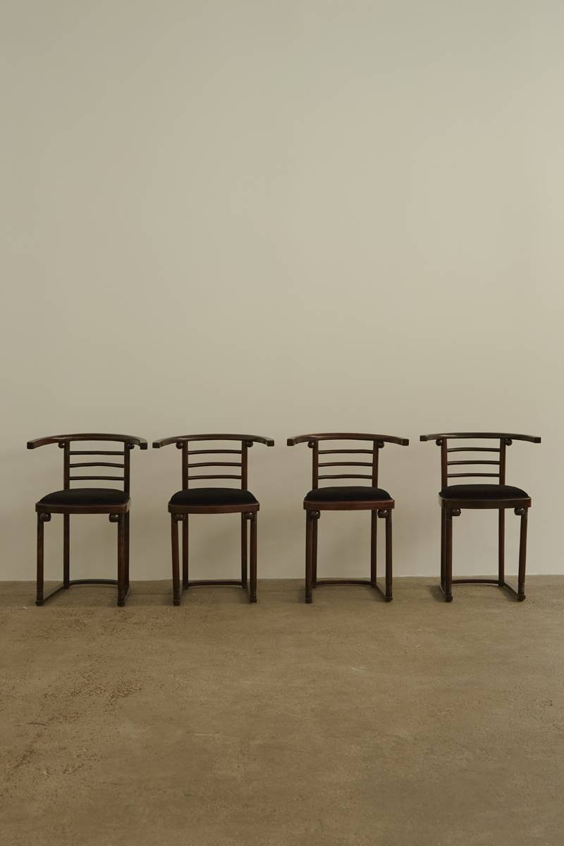 Set of 4 Fledermaus Chairs by Josef Hoffmann for Jacob and Josef Kohn (Model 728). Crafted in bent beechwood, these chairs feature distinctive wooden spheres accentuating the joinery points, showcasing exceptional bentwood craftsmanship. Each chair has been updated with new black velvet upholstery. A matching pair of tub armchairs is also available.