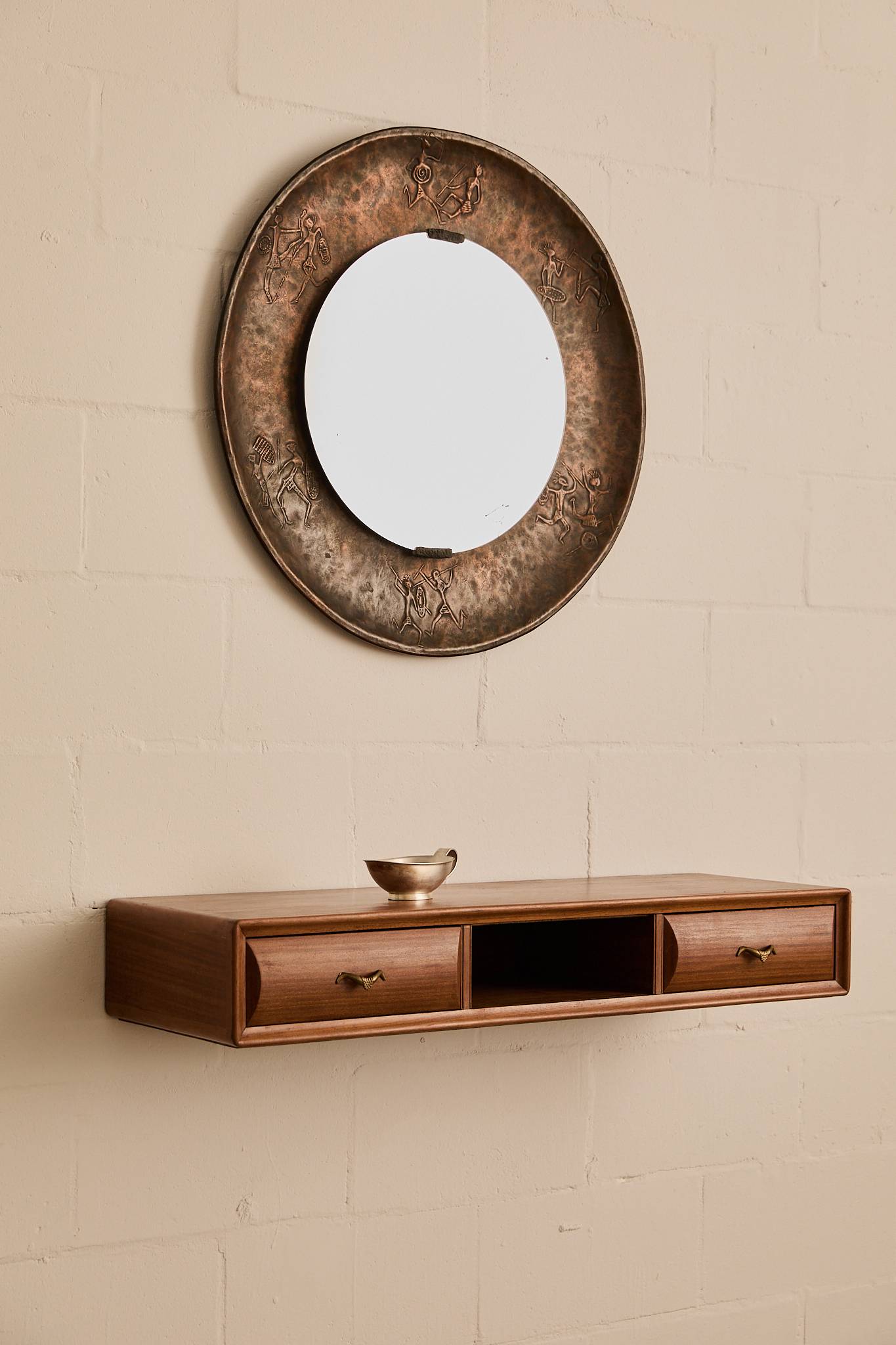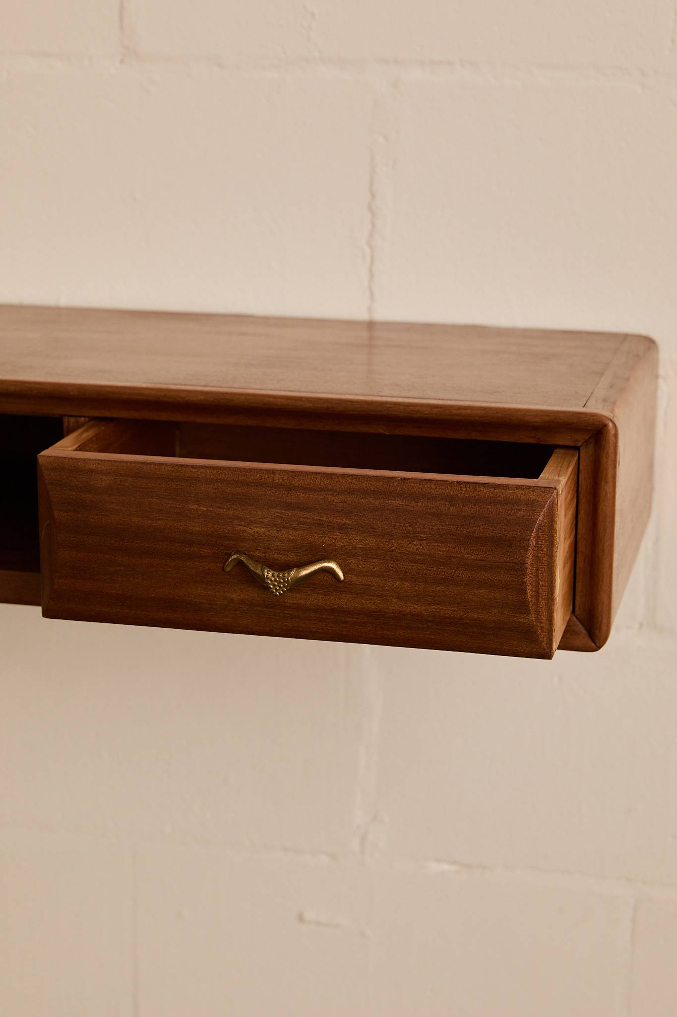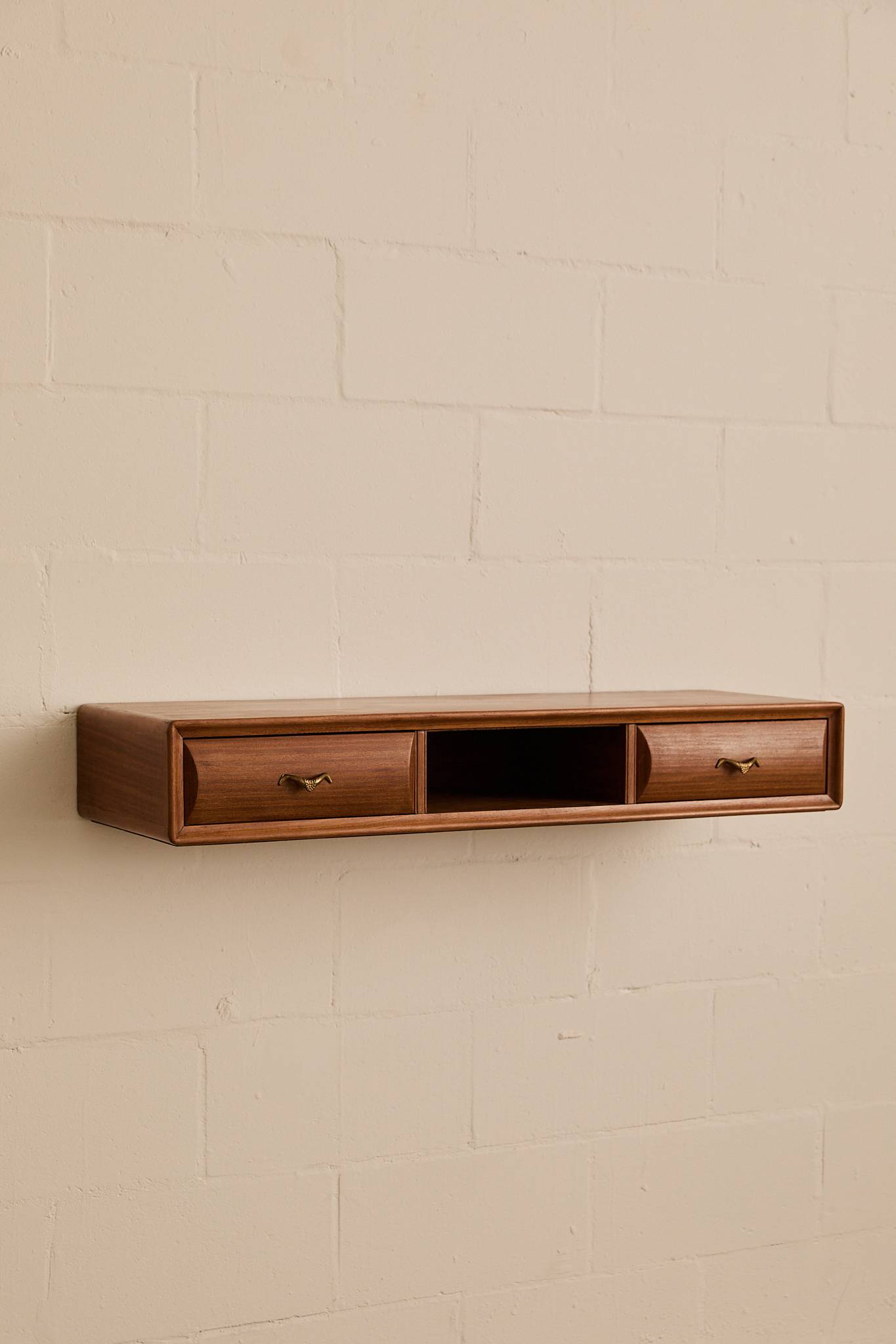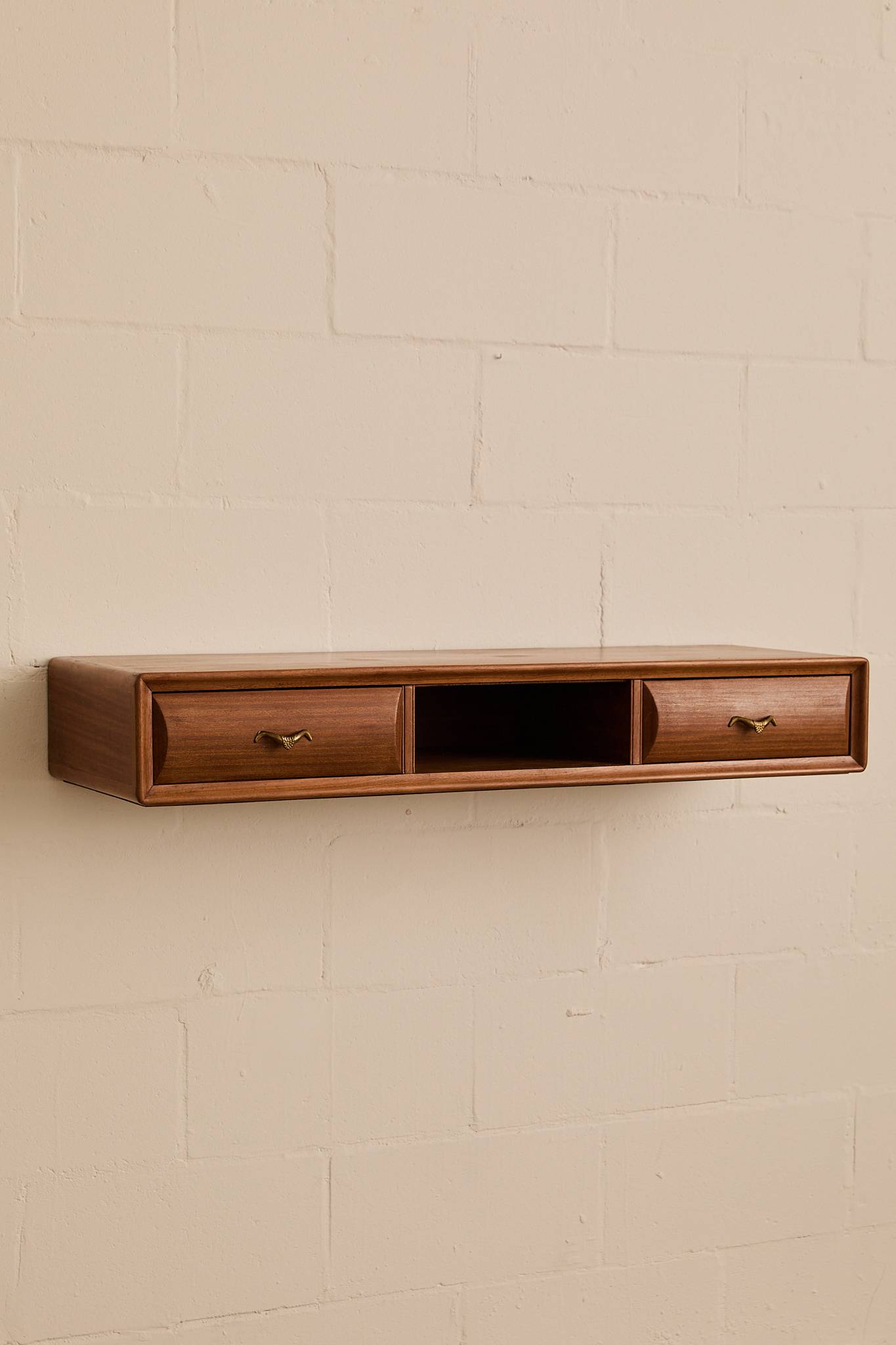 Sleek wall-mounted walnut shelf/console featuring a rounded-edge case and a single integrated drawer, finished with a distinctive brass pull.