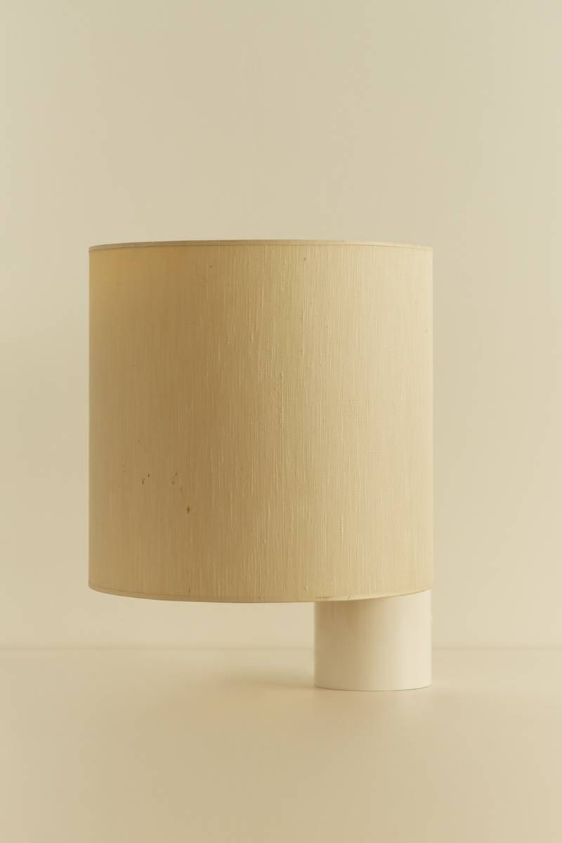 A large version of the Fluette table lamp, designed by Giuliana Gramigna for Quattrifolio in the 1970s, features a cylindrical white enameled aluminum frame paired with a cylindrical plasticized fabric lampshade.