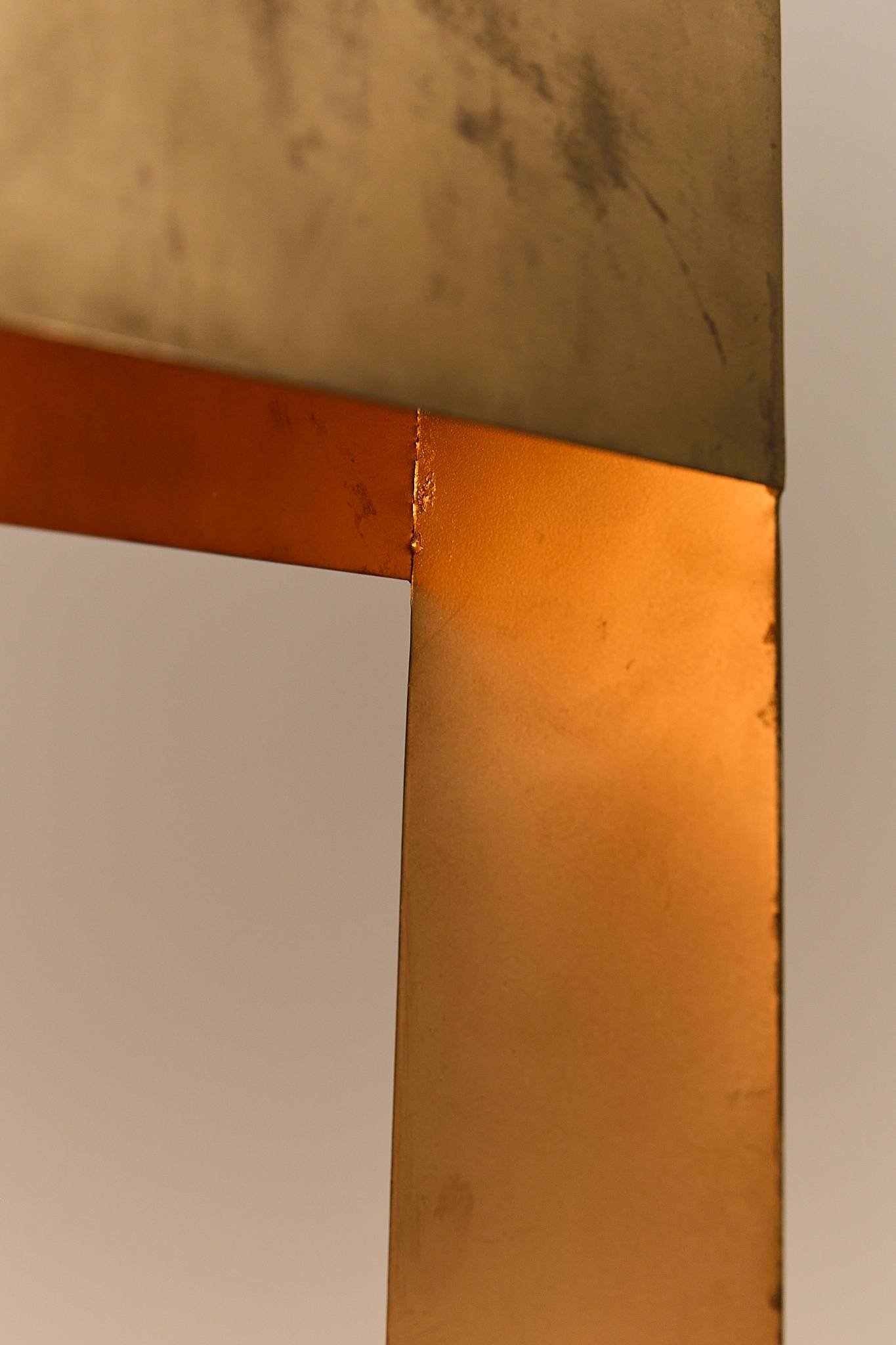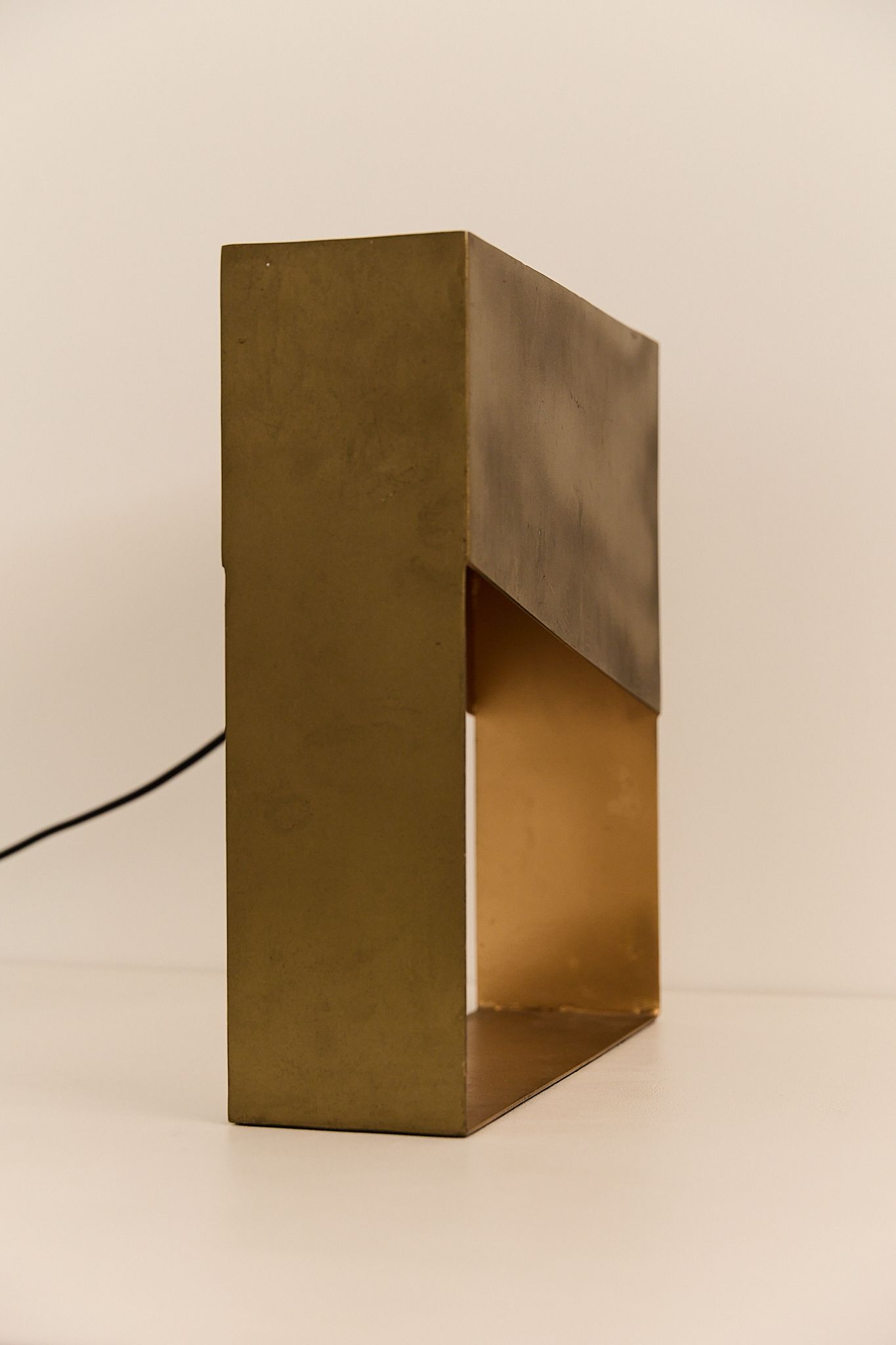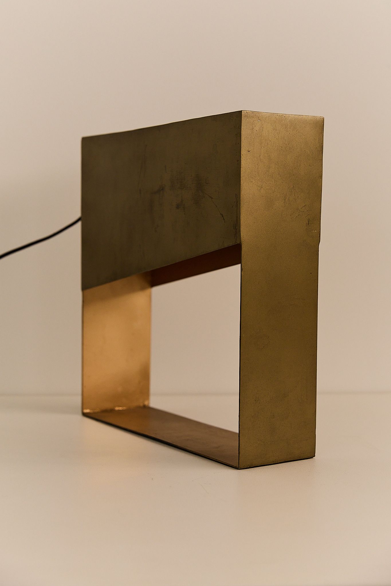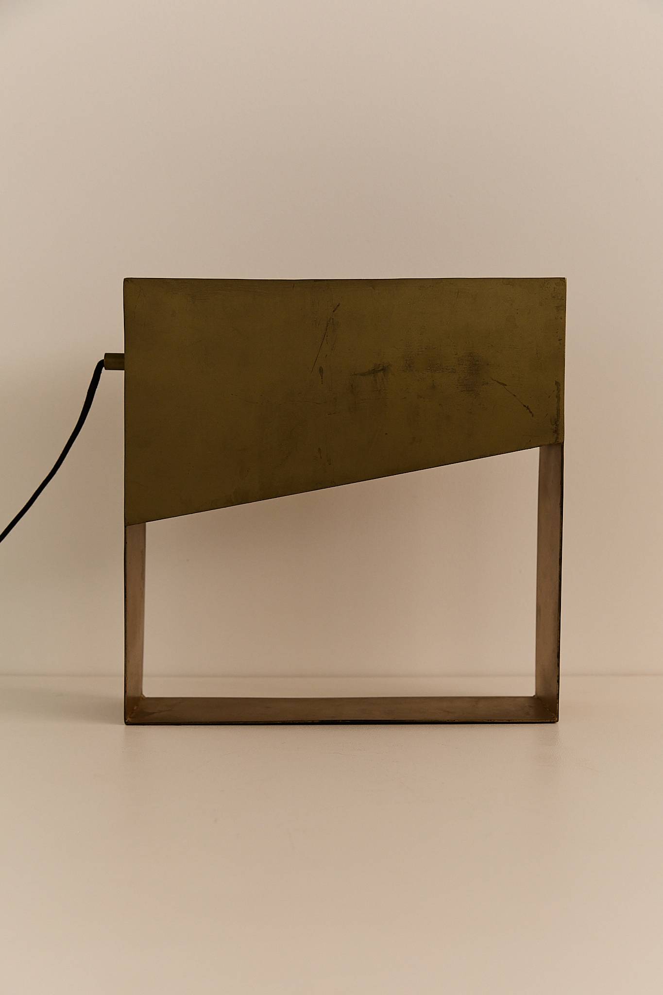 A bold geometric lamp from 1970s France, crafted in solid metal with a warm brass finish. Its sculptural, open-frame design casts a soft ambient glow