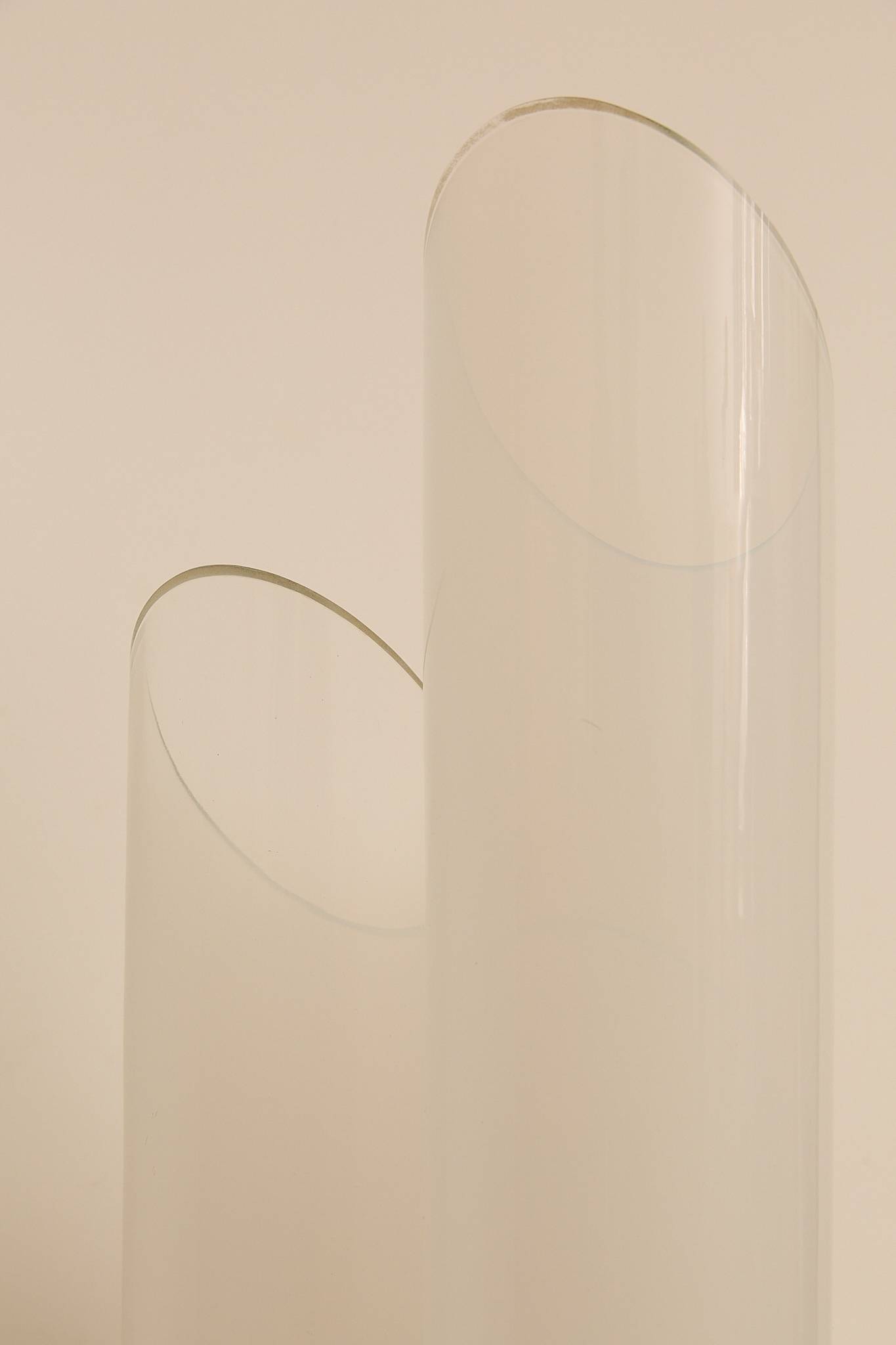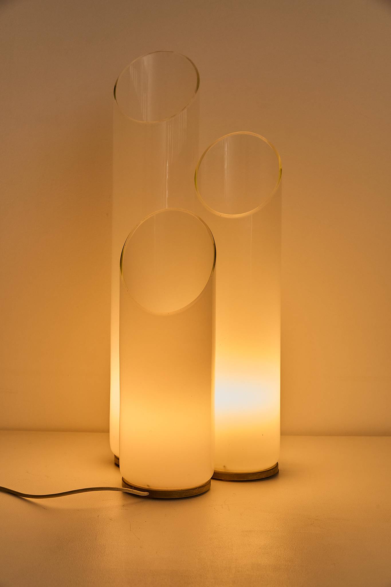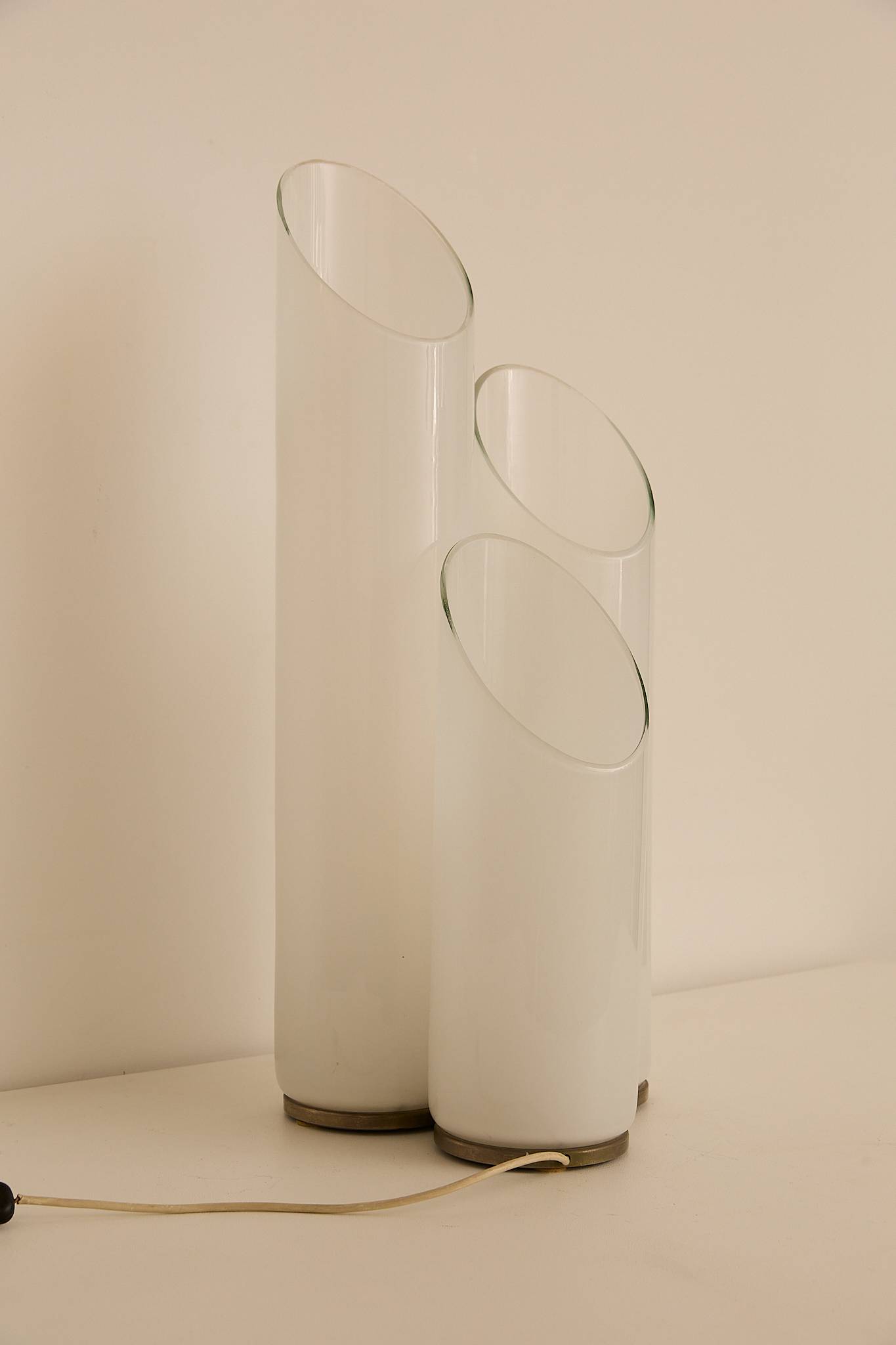 Sculptural table lamp attributed to Carlo Nason for Mazzega, Italy, 1970s. Composed of three overlapping glass cylinders with softly angled openings, the piece emits a warm, diffused glow when lit. A refined example of Nason’s mastery of form and light, balancing minimalism with organic elegance.