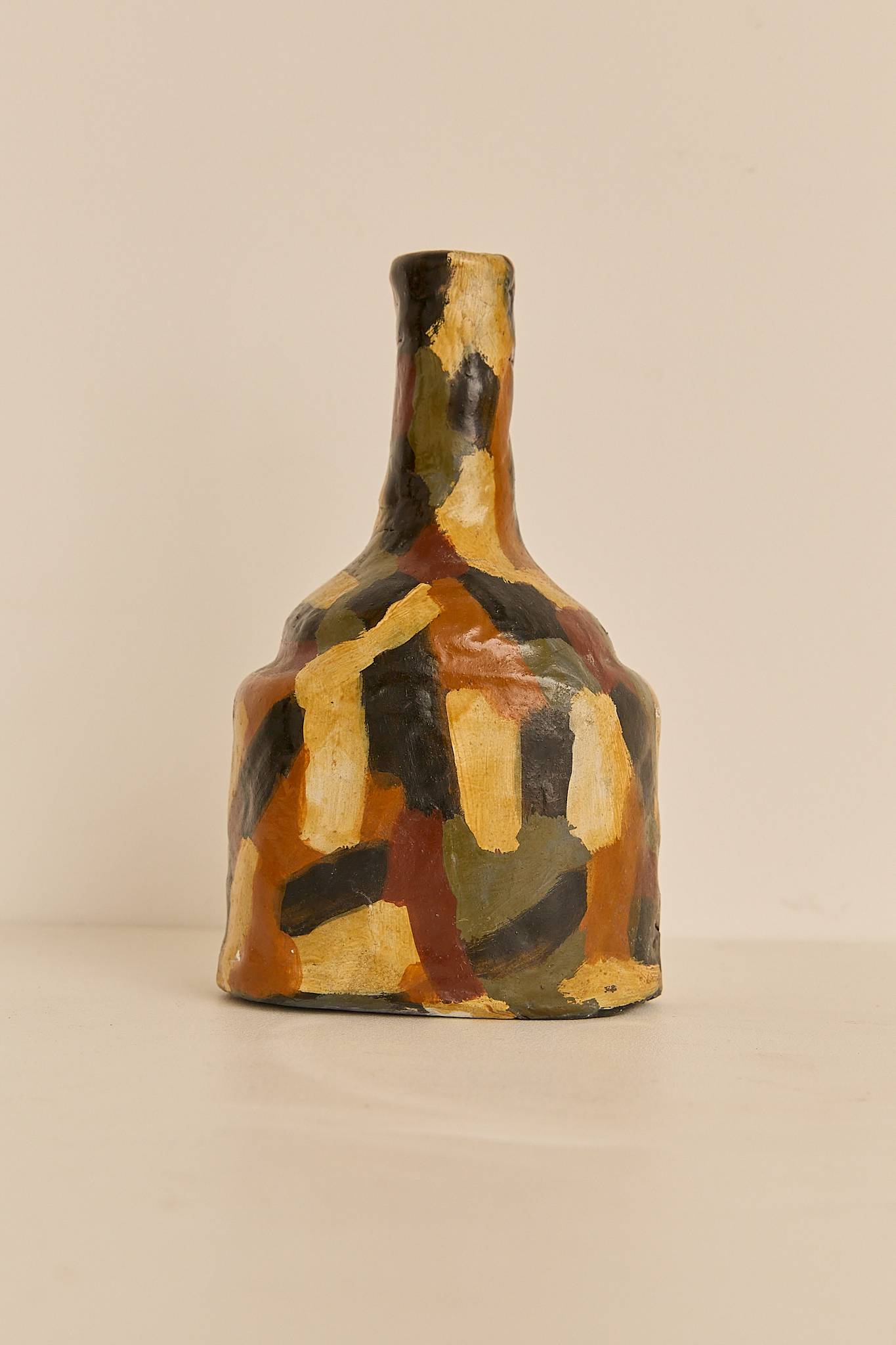 A pair of sculptural ceramic vessels, each uniquely hand-painted in layered earthy tones. Their organic forms and textured surfaces make them striking decorative pieces on their own or styled together. Price is for the pair.