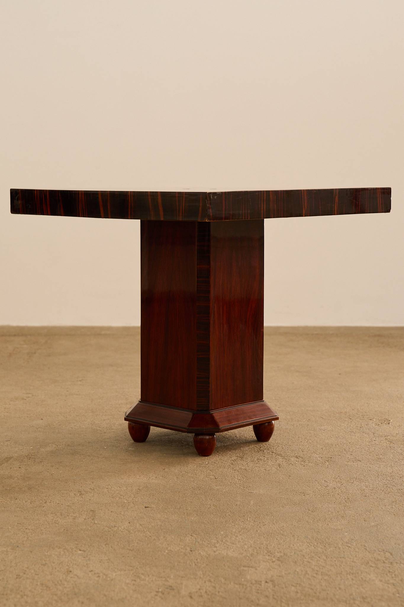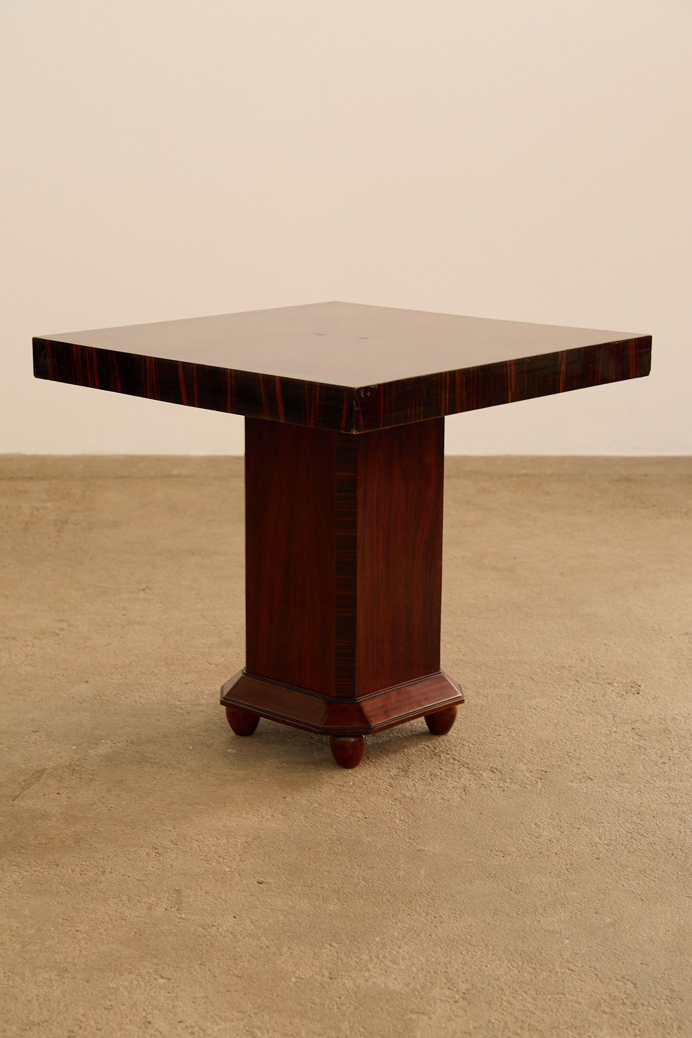 Square Art Deco side table in macassar ebony veneer, France, 1930s. The table features a bold geometric silhouette with a thick square top, set on a central pedestal base with an octagonal plinth and spherical feet. The rich macassar veneer is arranged in a striking radial pattern on the surface, highlighting the depth and movement of the wood grain.