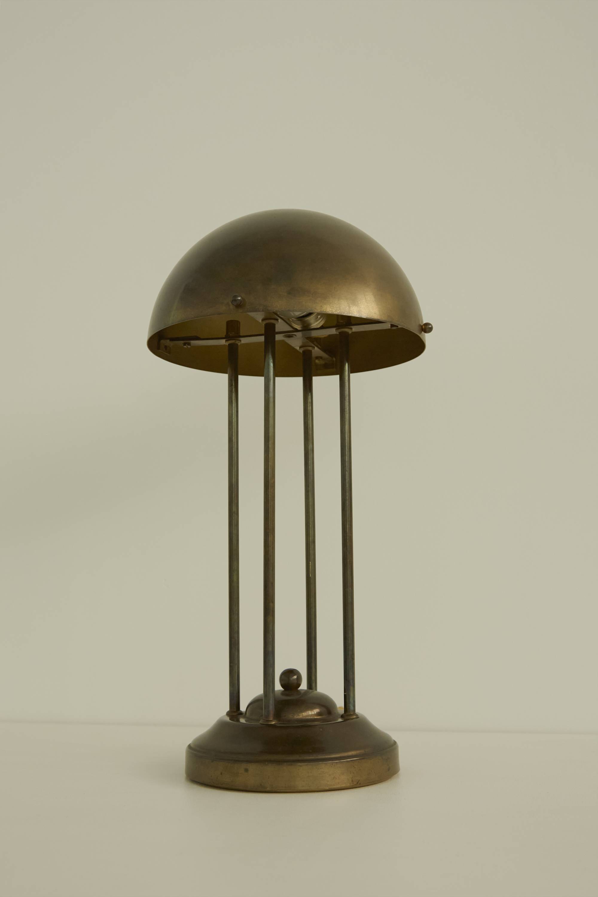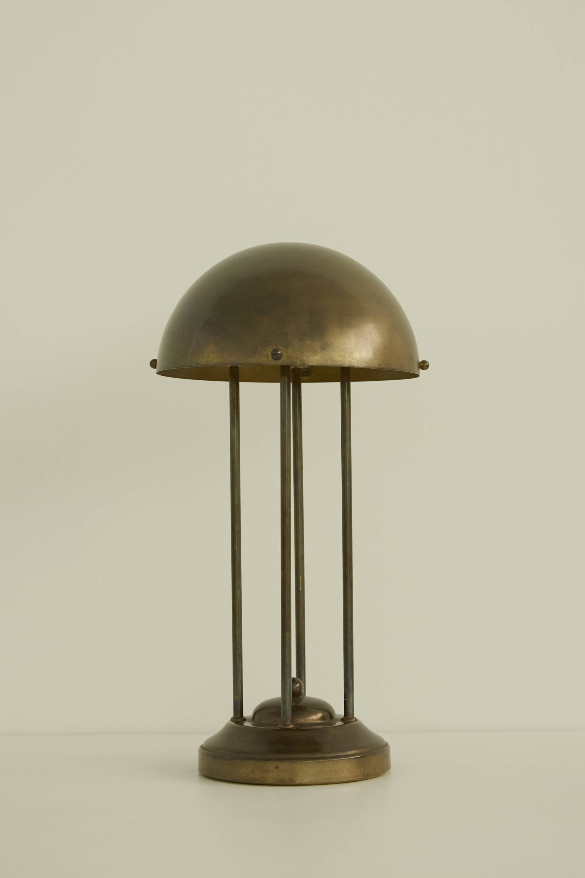 An elegant brass table lamp by Austrian designer Josef Hoffman. Its original design dates to 1900 but this piece is most likely a contemporary edition and later production circa 1960. The lamp features a wonderful patina throughout, its shade is supported by 4 brass tubes that connect to its circular foot. E27 bulb and original EU plug.