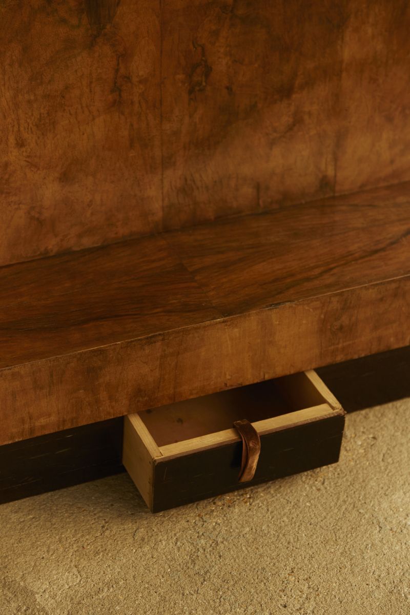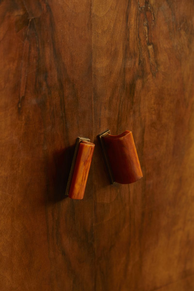 The exquisite Bakelite handles add a touch of vintage charm, while the small drawer with a leather pull handle provides convenient storage for personal items. A perfect blend of form and utility.