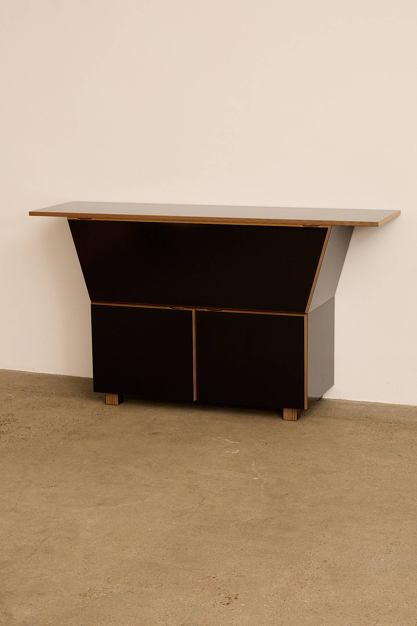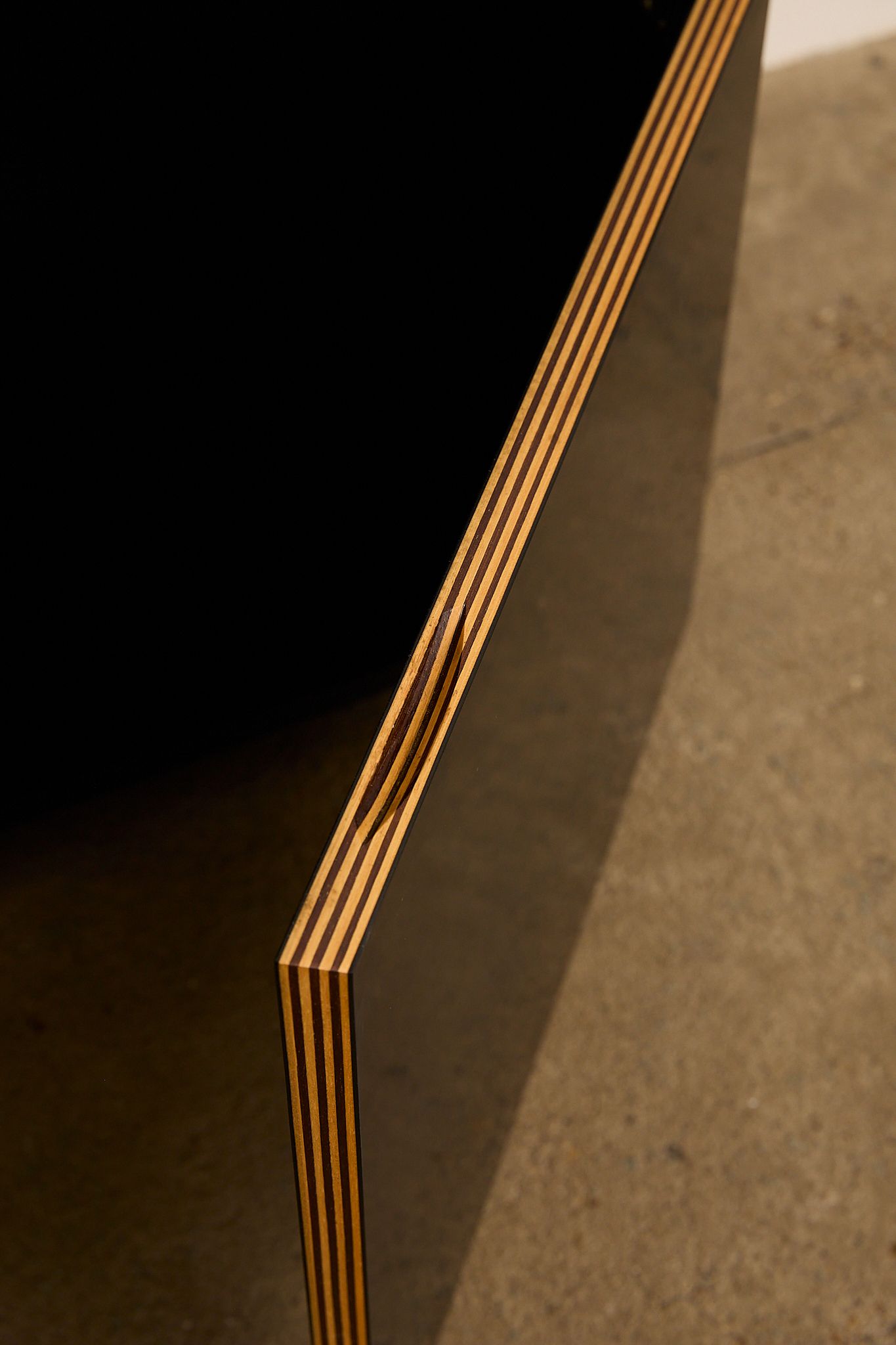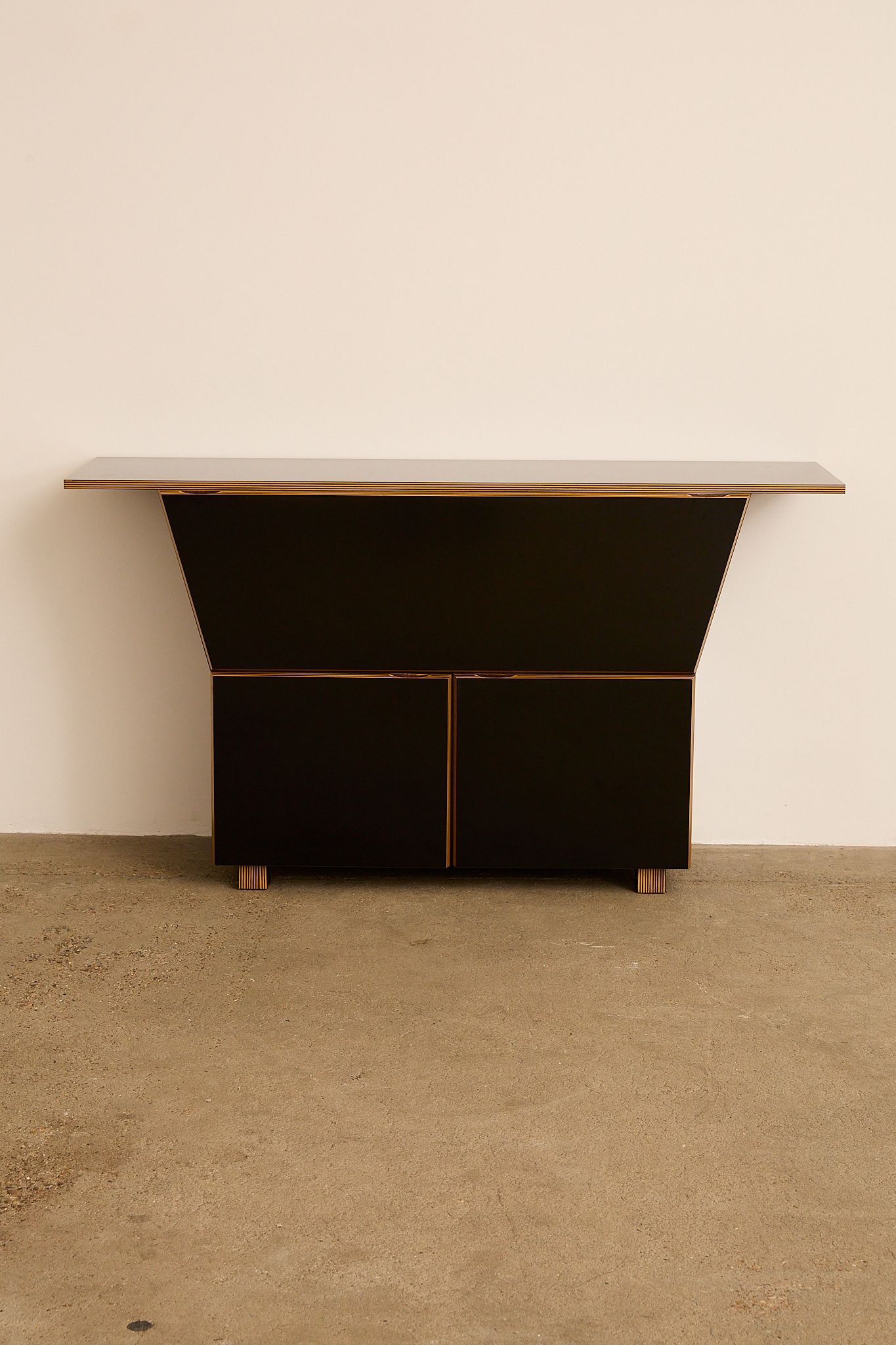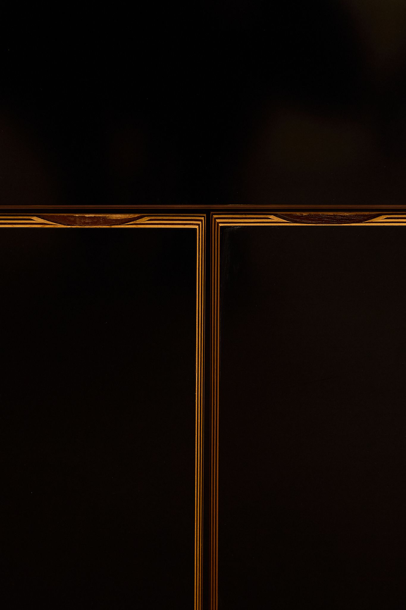 Elegant 1970s Italian sideboard with a bold, architectural silhouette in glossy black lacquer. Striped wood inlay edges add warmth and depth to its clean, geometric design, while the spacious storage and refined craftsmanship highlight the sophistication of Italian modernism.