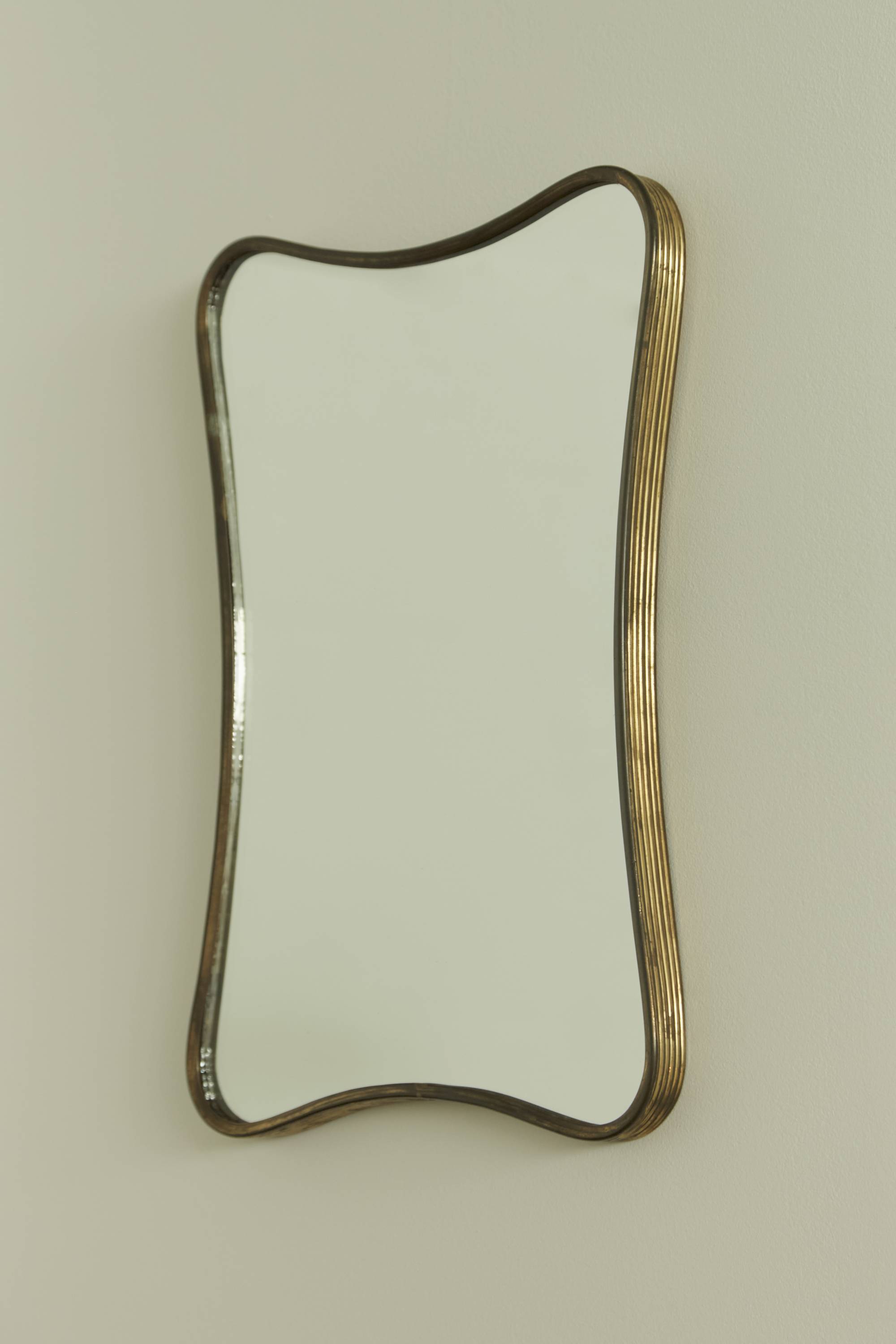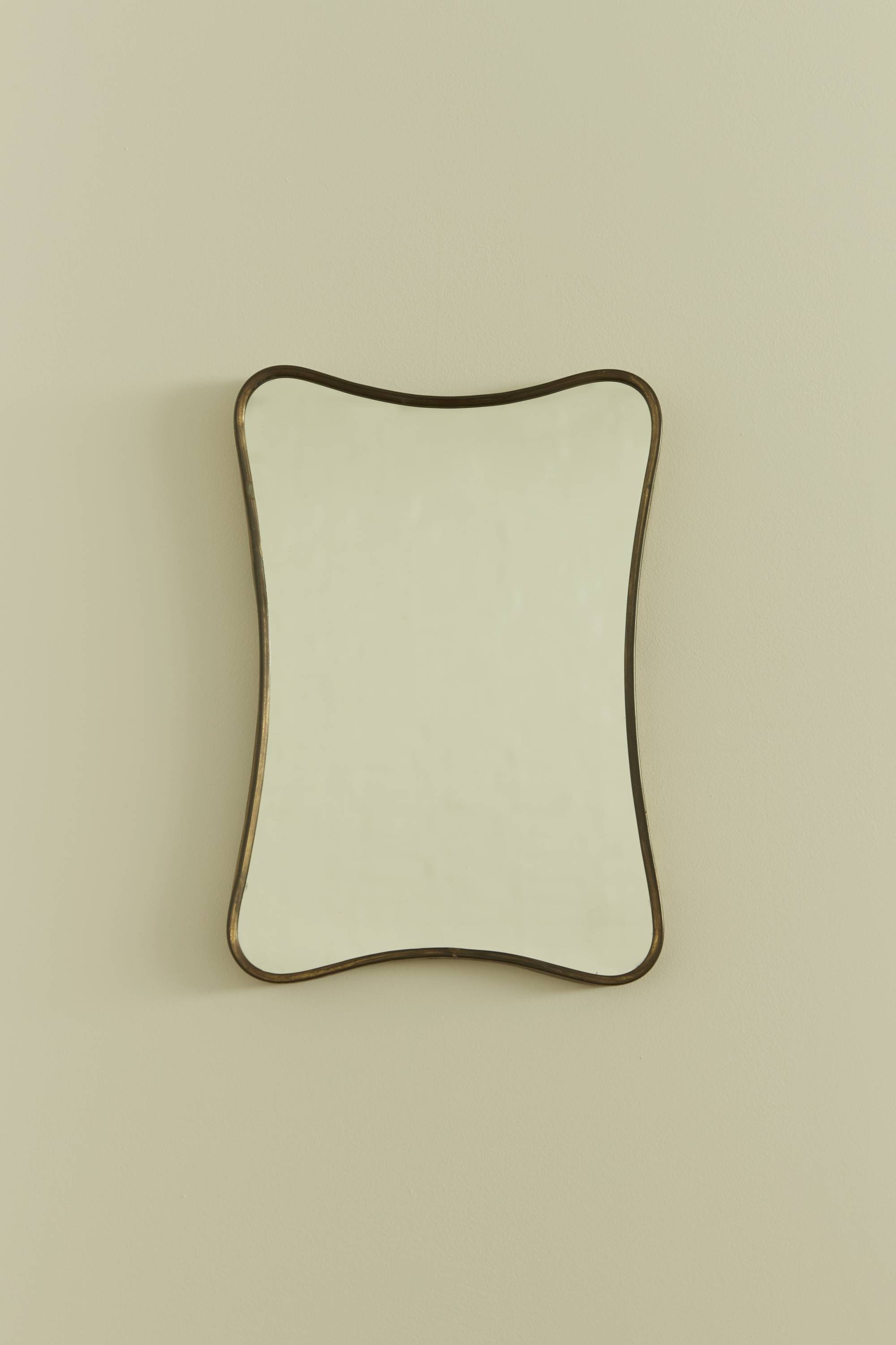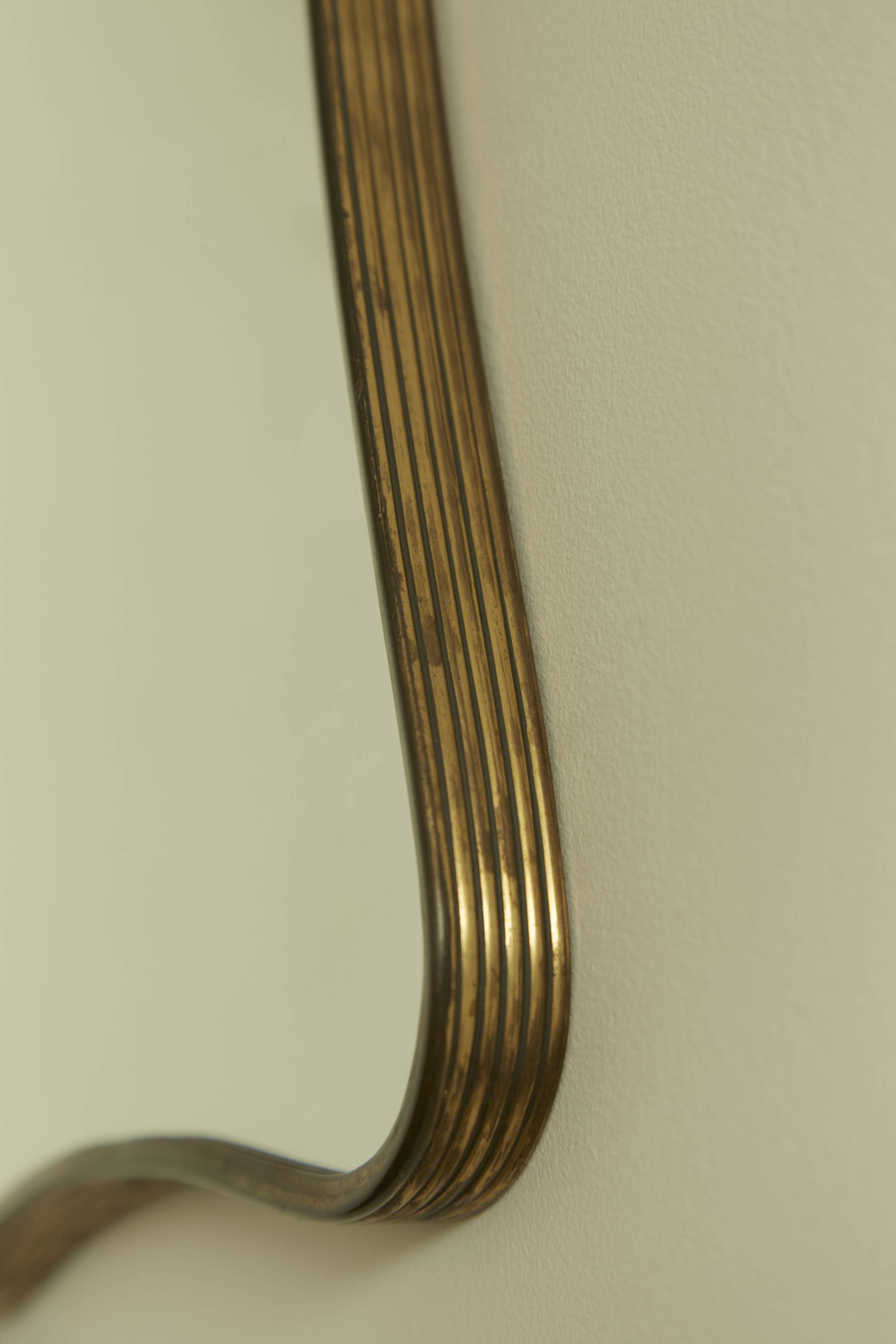 A wall mirror with a simple brass ribbed frame. Produced circa 1950 in Italy. The mirror features smooth curves that round its four corners and indent at its sides.
