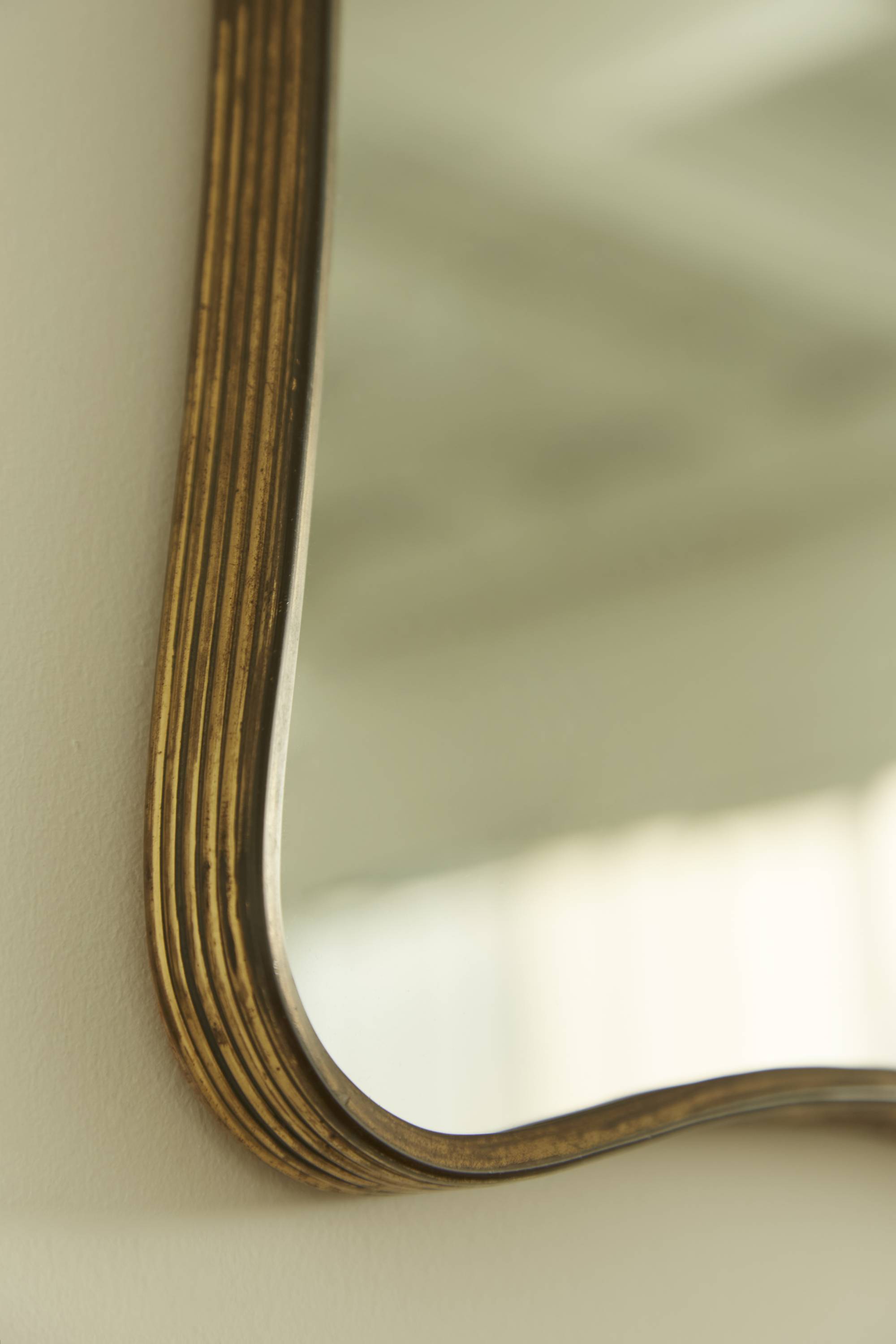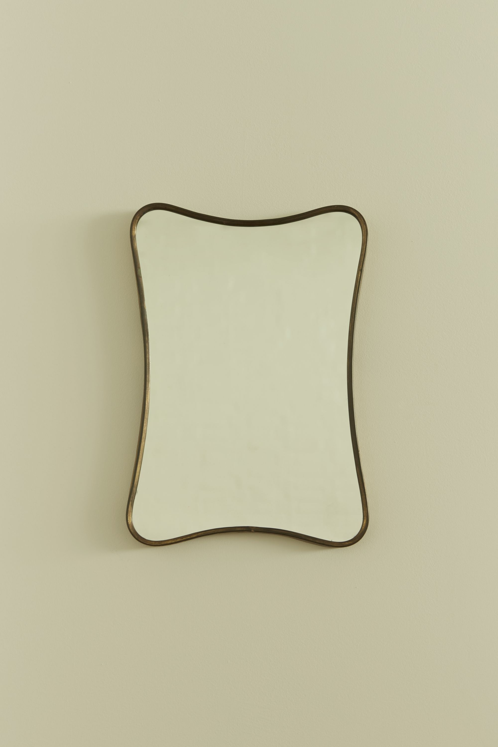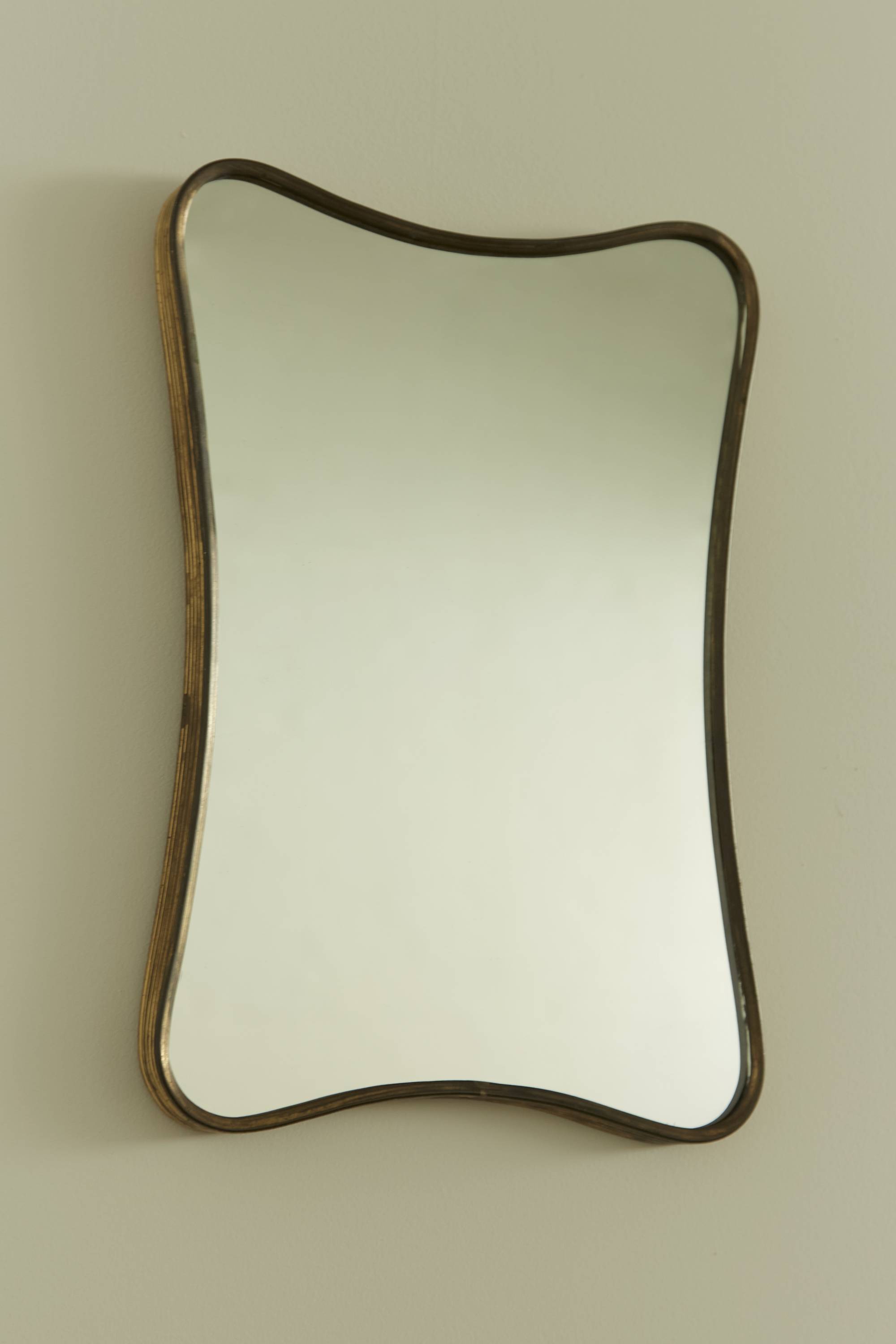 A wall mirror with a simple brass ribbed frame. Produced circa 1950 in Italy. The mirror features smooth curves that round its four corners and indent at its sides.