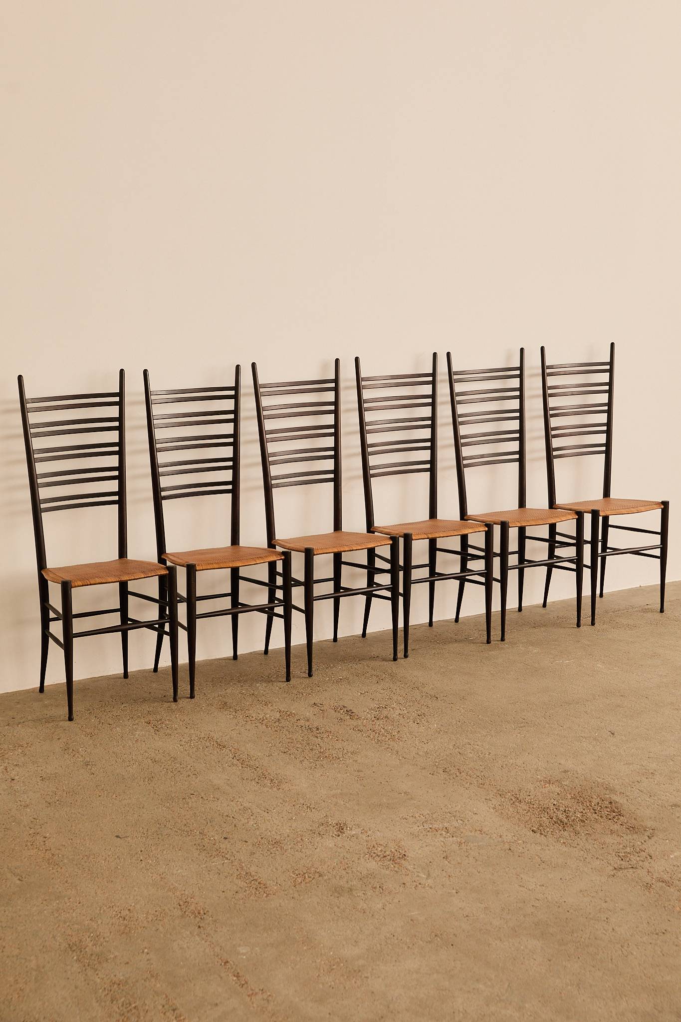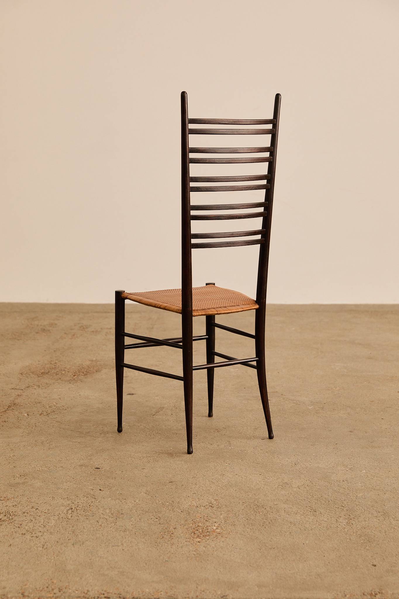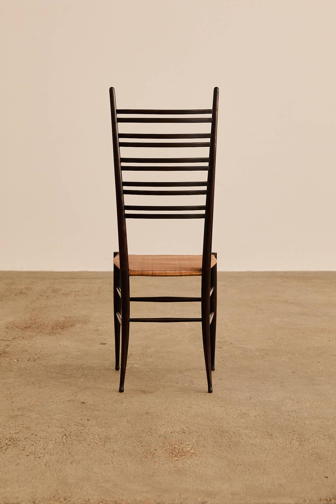 Elegant set of six dark-stained wooden ladder-back chairs with tall, sculptural slat backs and hand-woven rush seats, finished with tapered legs and stretcher bases—evoking the refined craftsmanship and lightness of Gio Ponti’s iconic Superleggera chair.