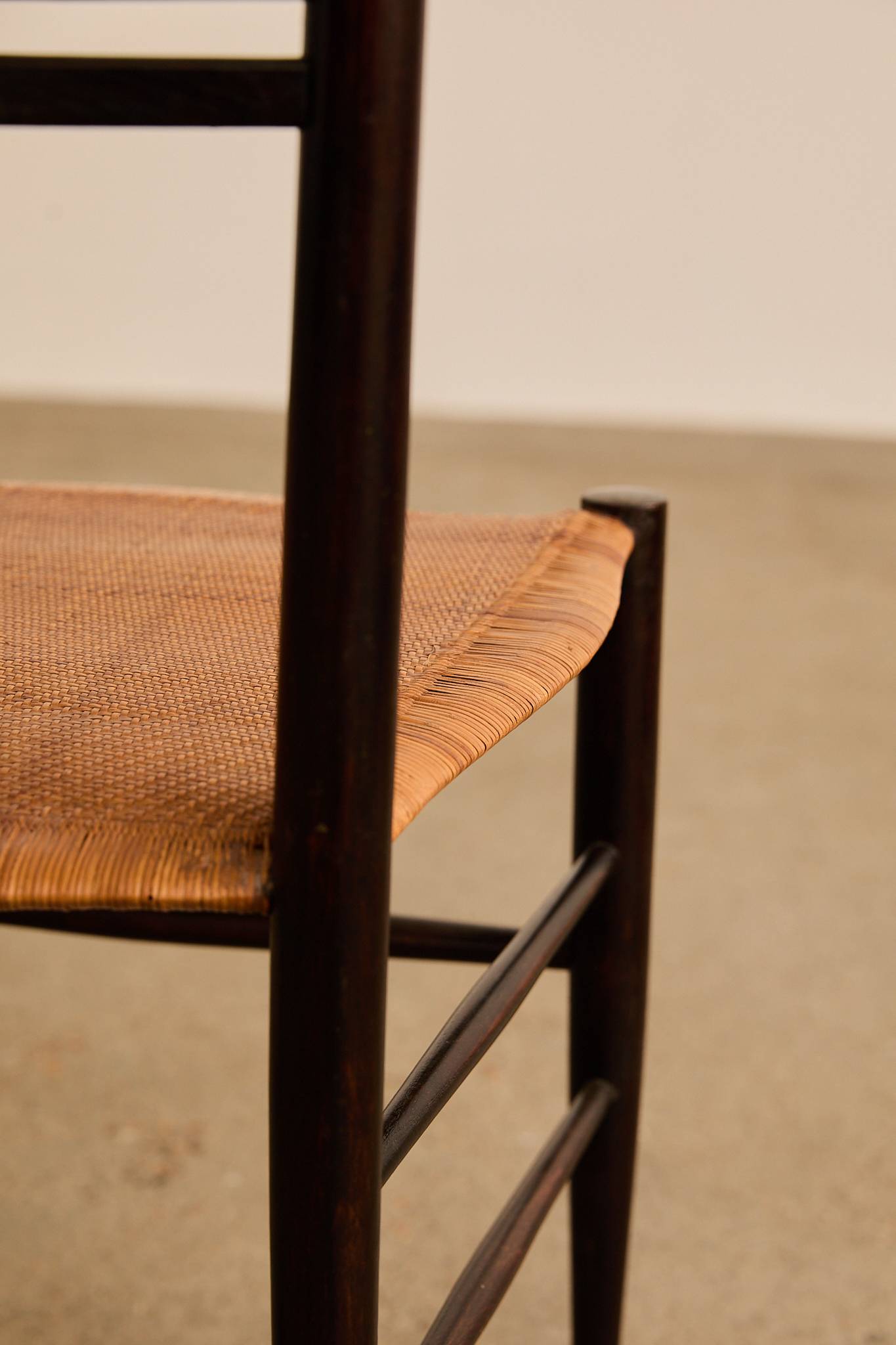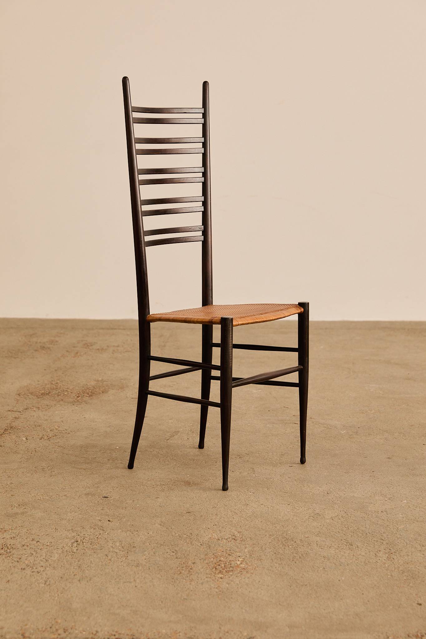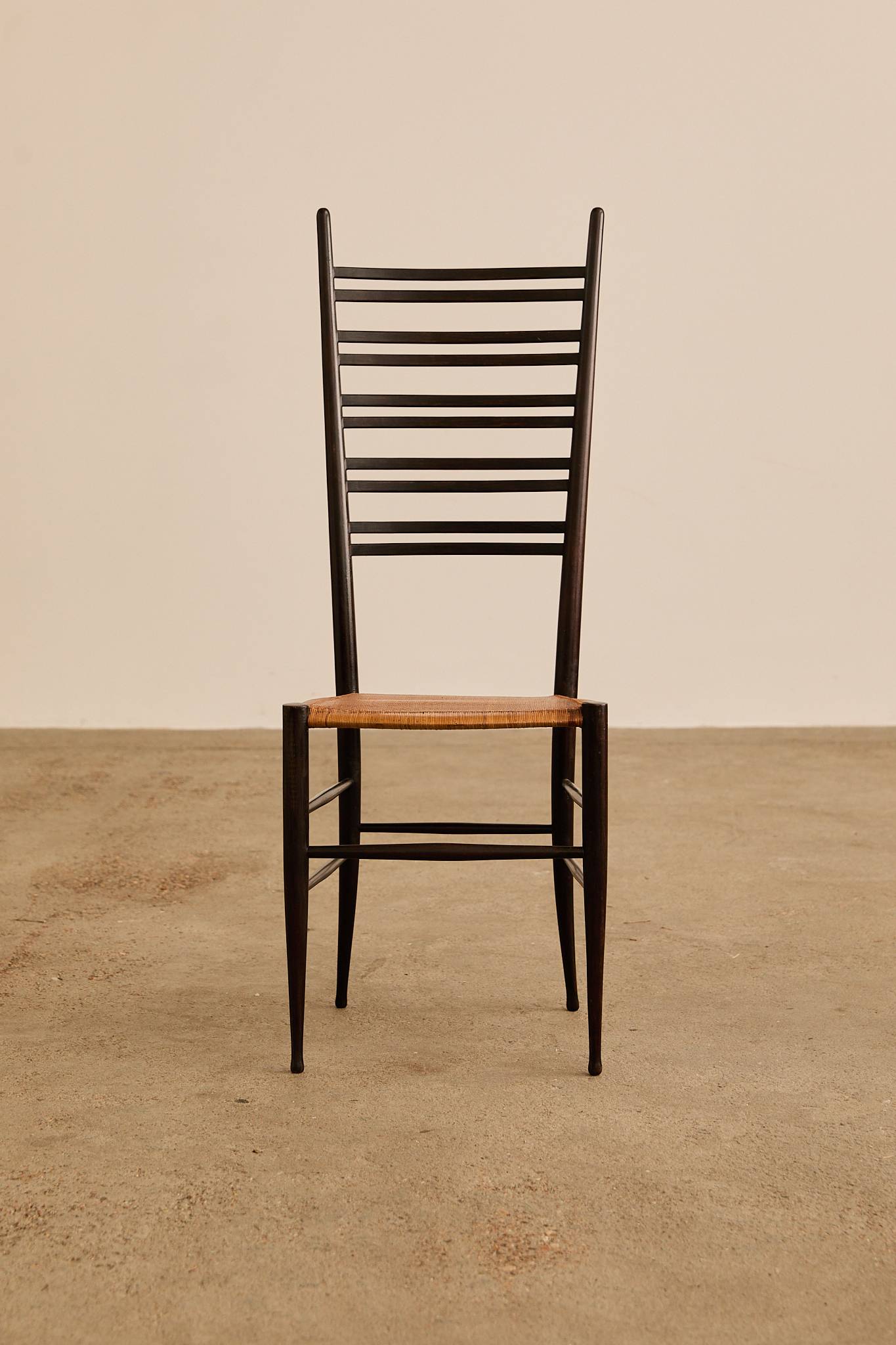 Elegant set of six dark-stained wooden ladder-back chairs with tall, sculptural slat backs and hand-woven rush seats, finished with tapered legs and stretcher bases—evoking the refined craftsmanship and lightness of Gio Ponti’s iconic Superleggera chair.