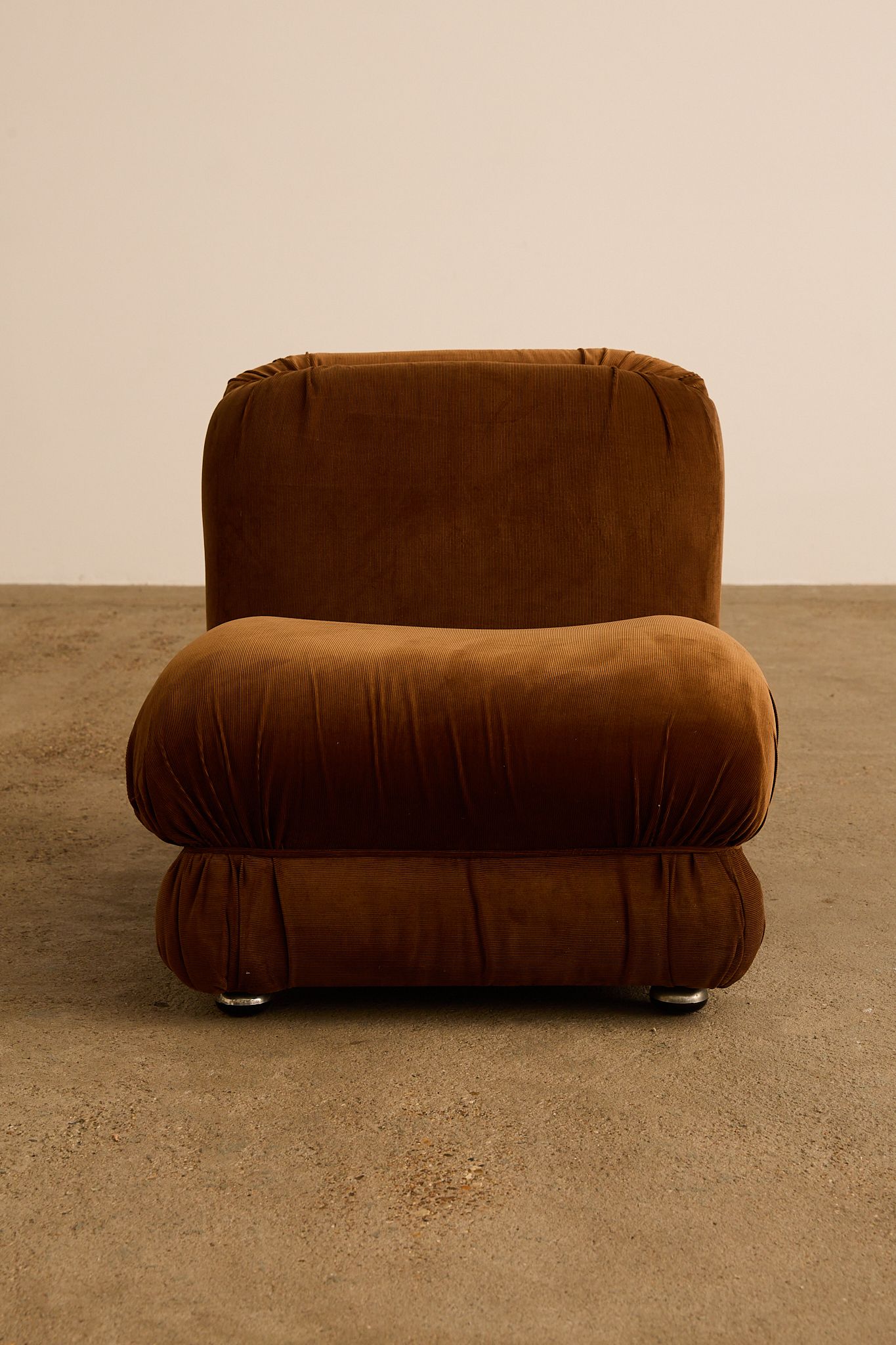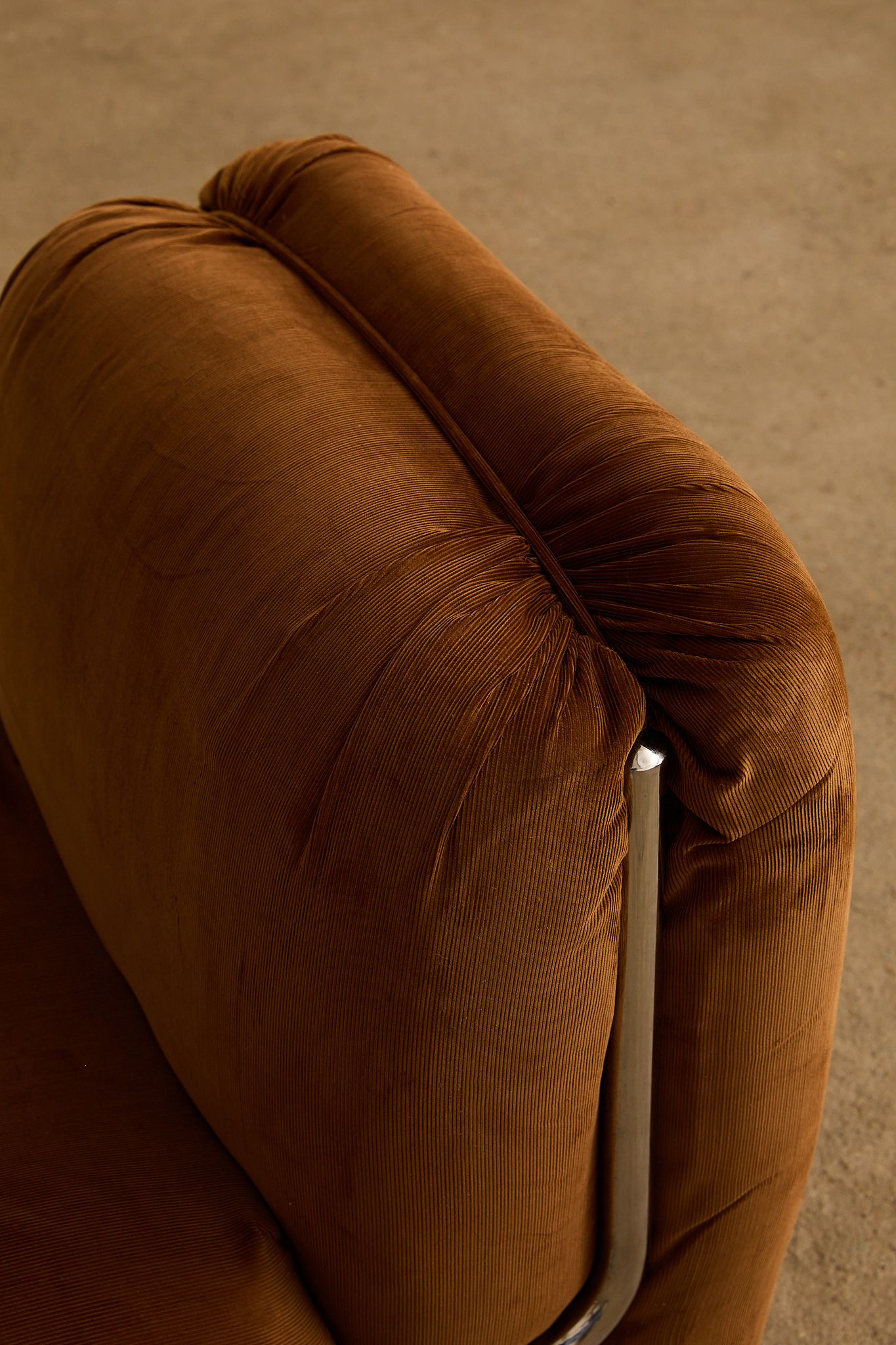1970s low-slung lounge armchair with tubular chrome frames wrapping around generously padded seats, newly upholstered in soft corduroy in tan brown tones.
