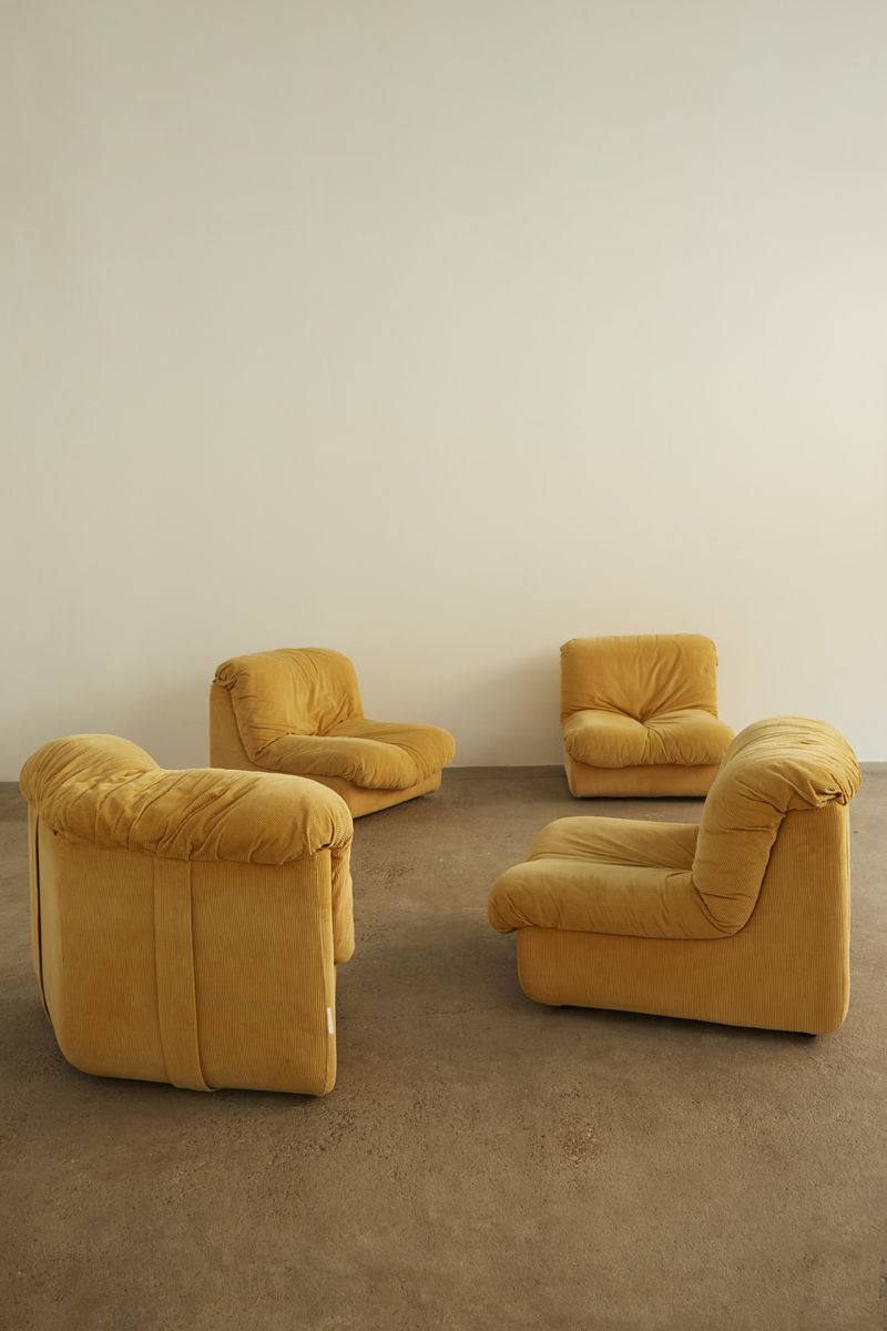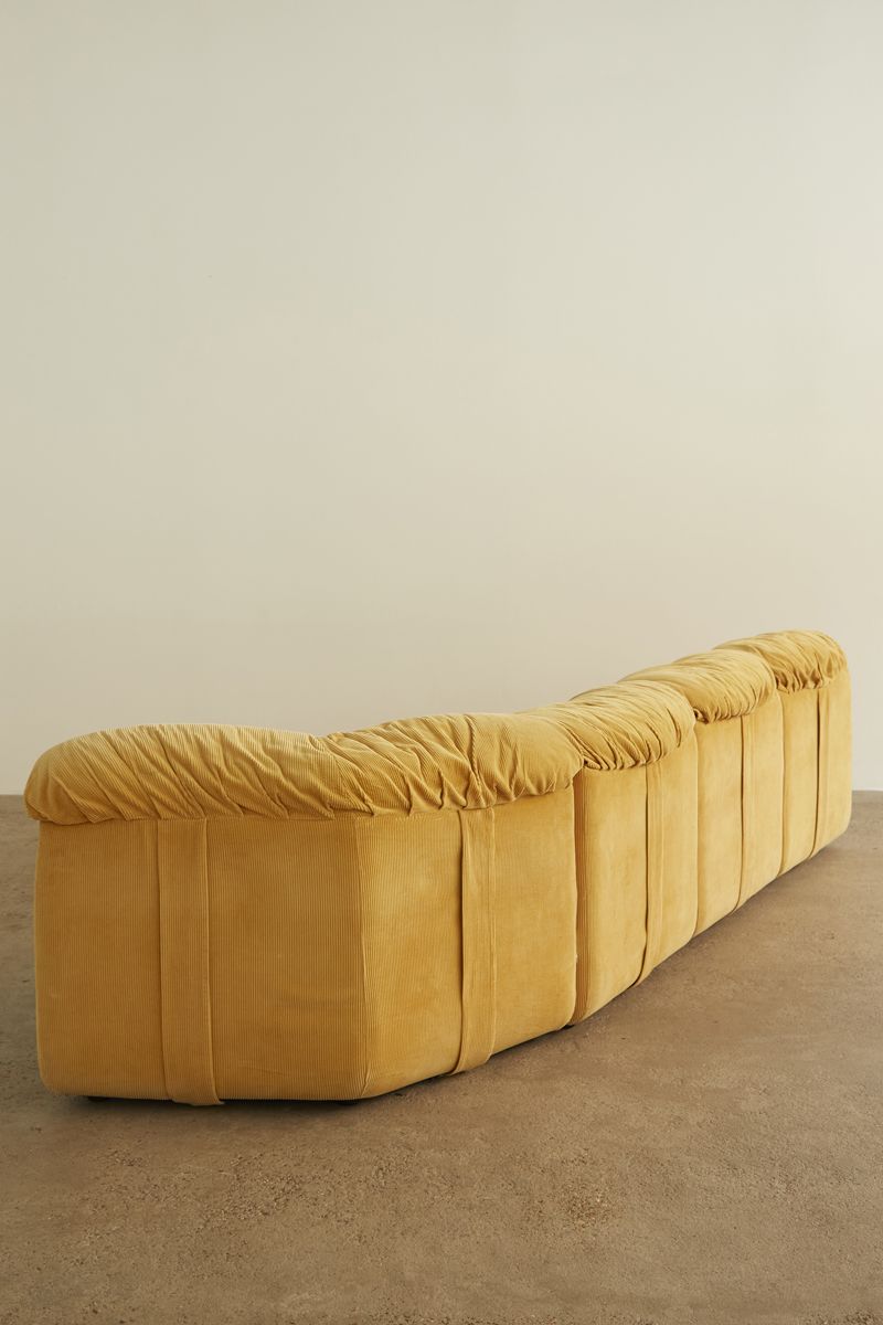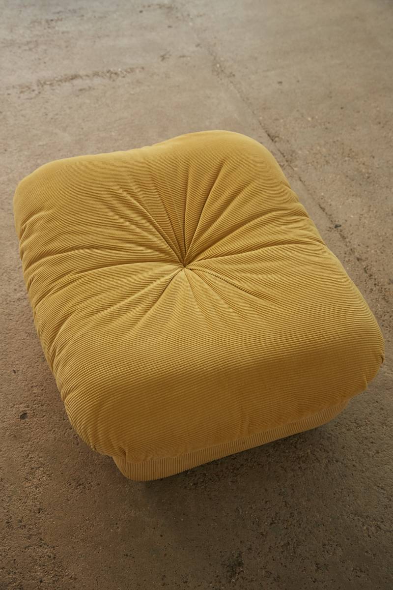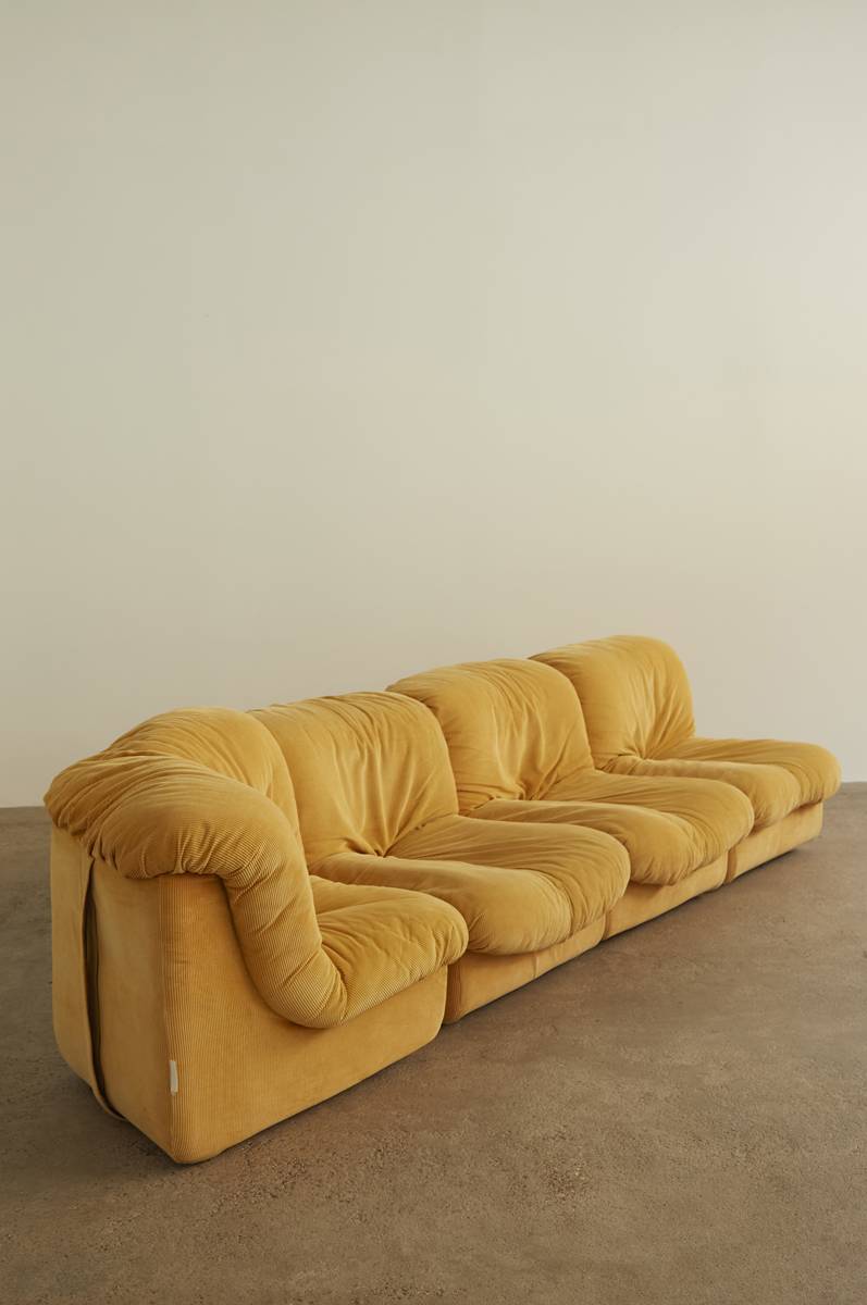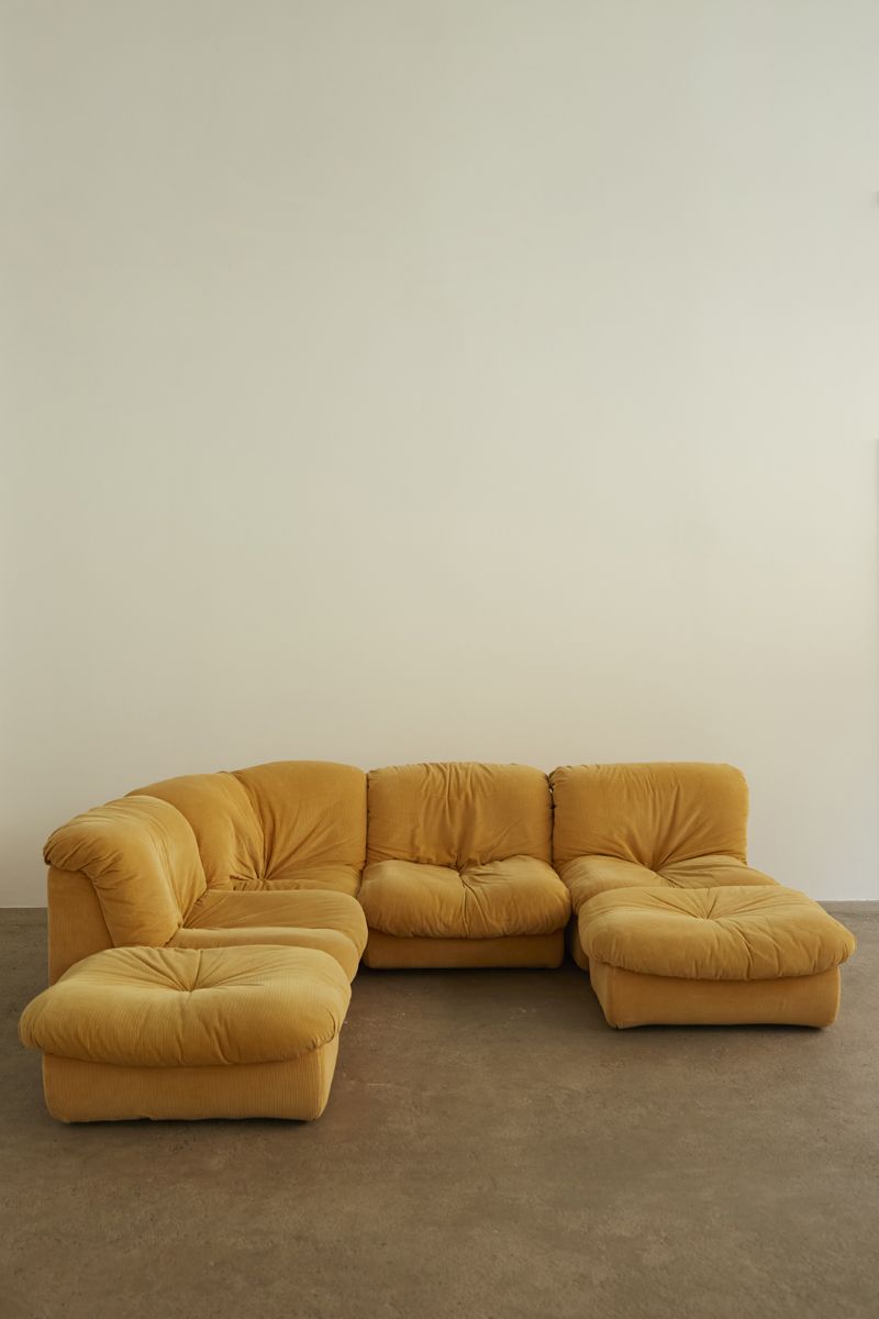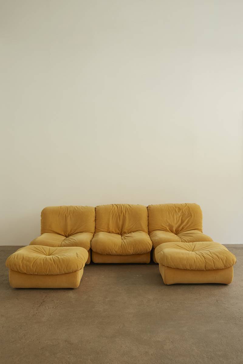 This timeless piece offers exceptional flexibility in arrangement, making it ideal for a variety of spaces and preferences. Upholstered in its original fabric and built with a sturdy hardwood frame, it embodies the elegance and functionality of 1970s Italian design. The set includes six pieces in total, featuring a corner element, three seating modules, and two ottomans, offering endless configuration possibilities to suit your space.