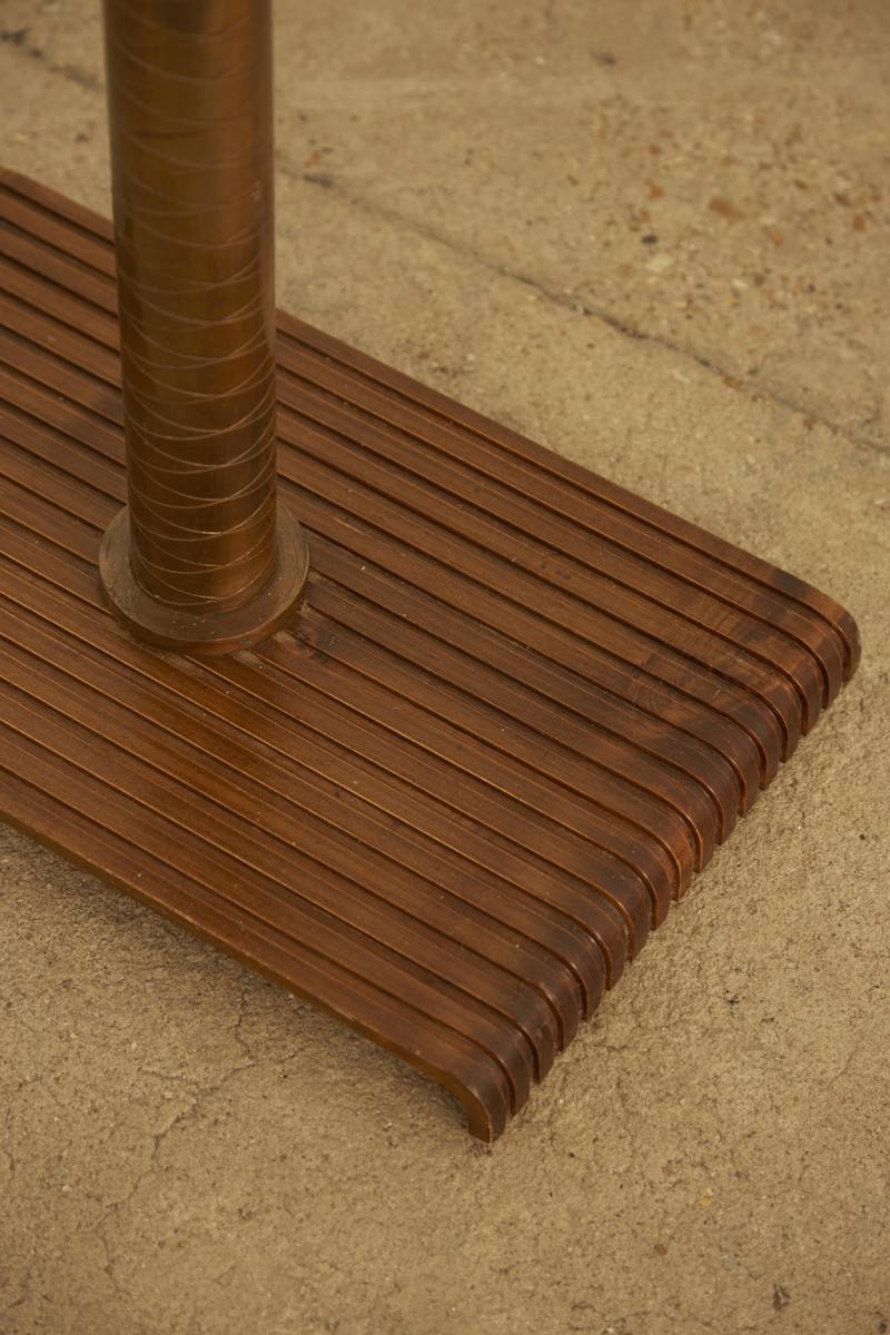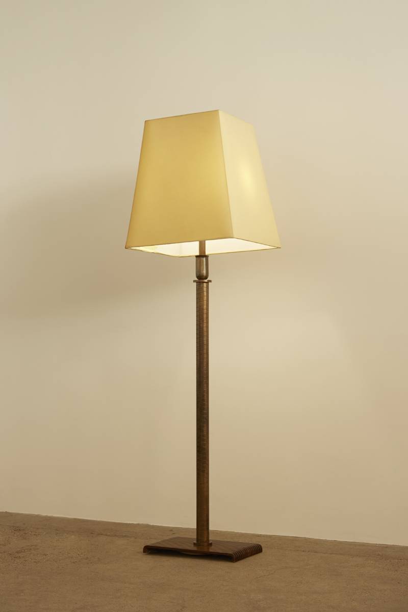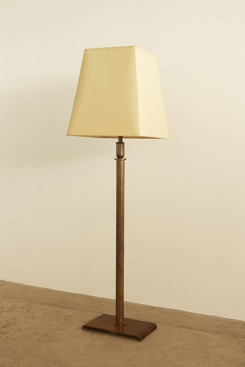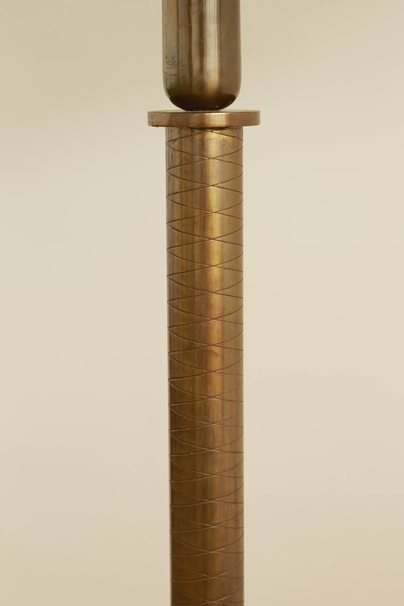 An Italian floor lamp from the 1950s, featuring a decorative inlaid brass pole and a ribbed wooden base. The original fabric shade, with some marks due to age, adds to its character. A refined and timeless piece with elegant craftsmanship.