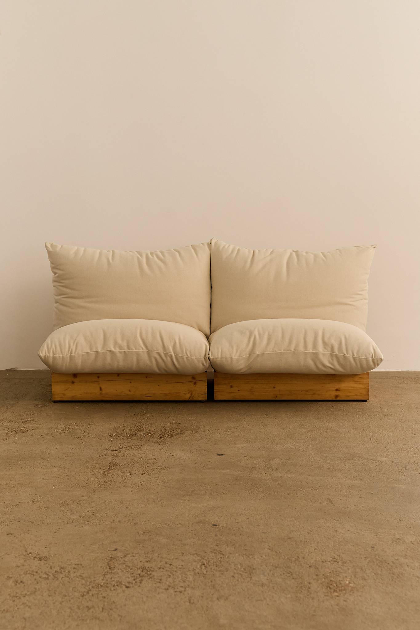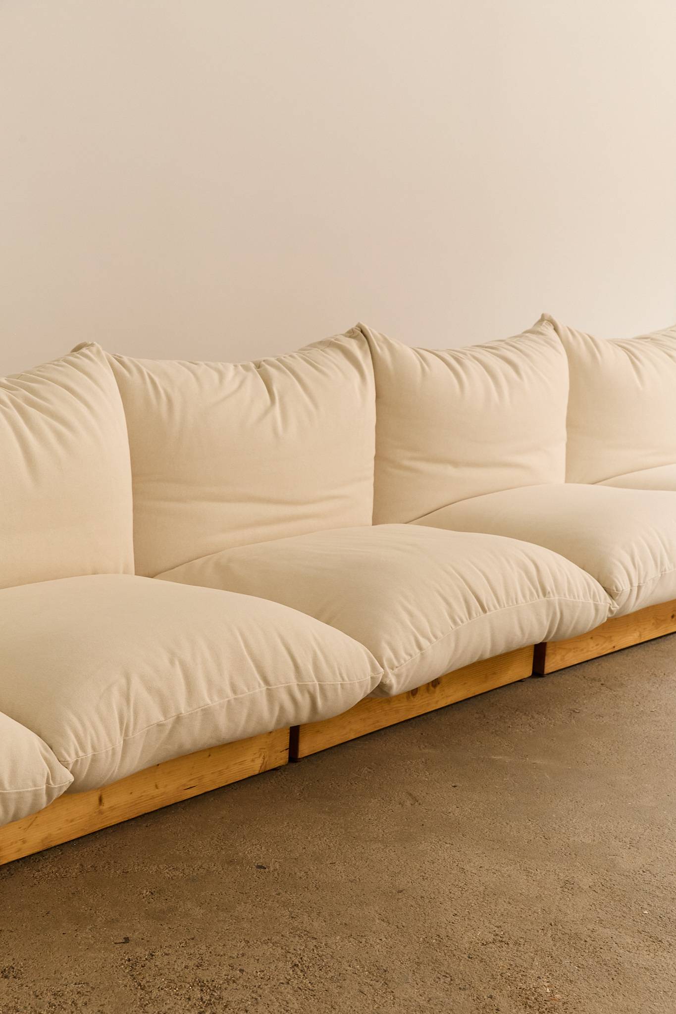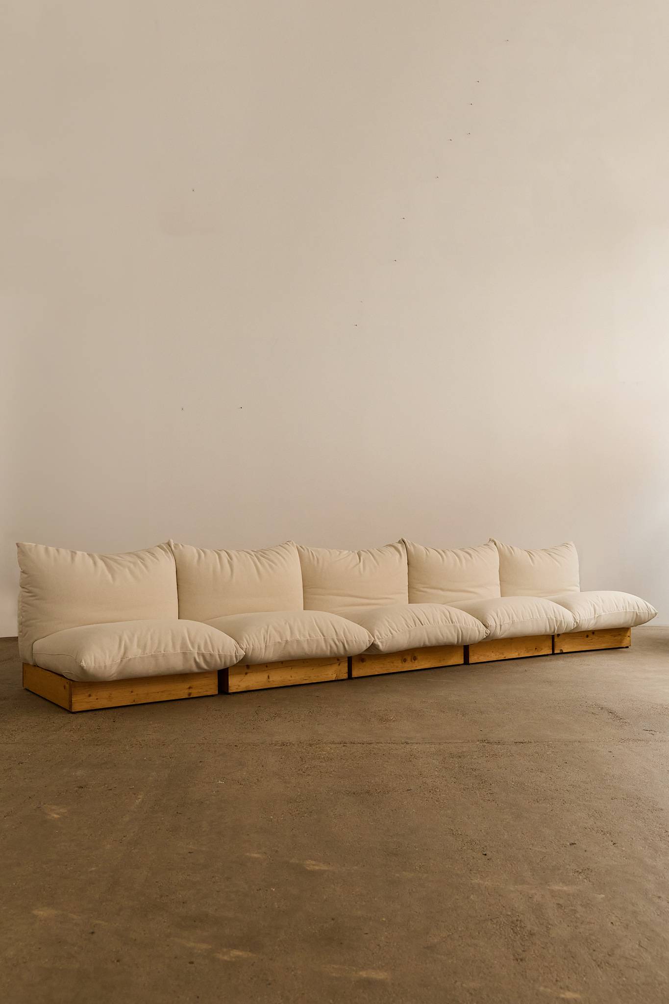 A generous five-seat Italian modular sofa resting on solid pine bases, newly reupholstered in natural cotton fabric. The design emphasises comfort with oversized, cloud-like cushions that invite relaxation while maintaining a clean, architectural profile. Each section can be arranged together or used individually as armchairs. Vat is added on top as it’s an imported item.